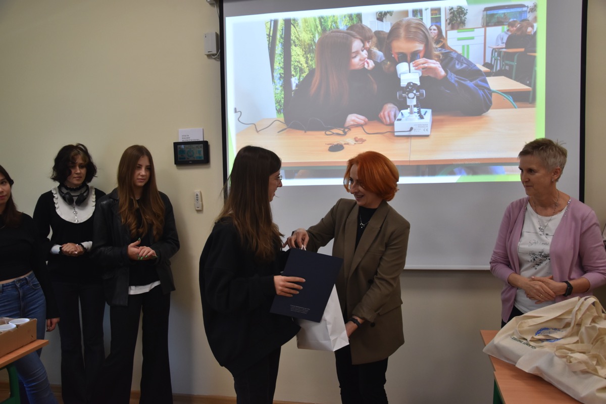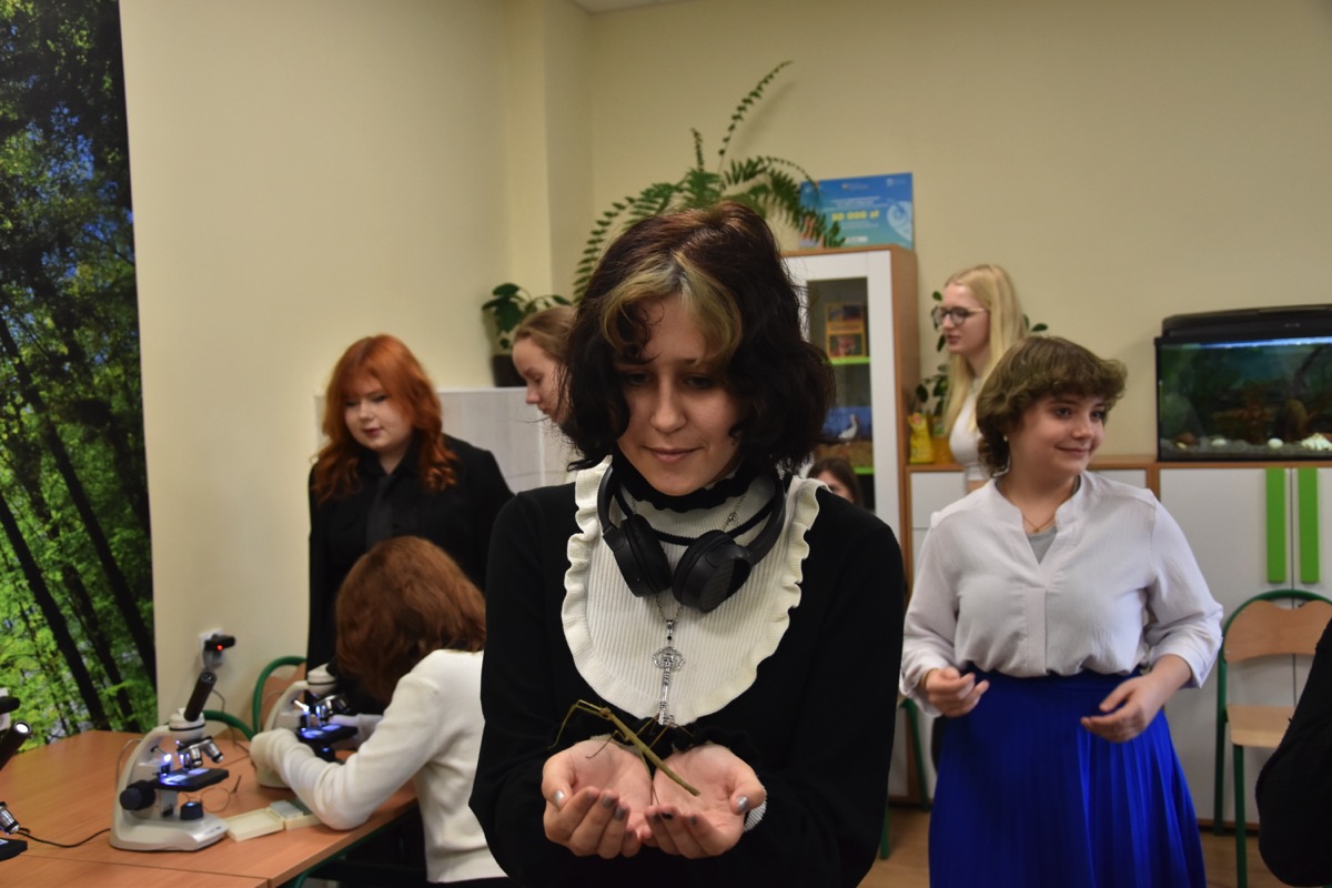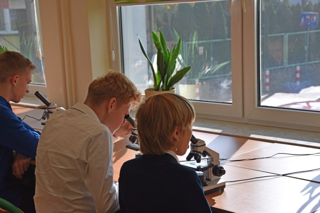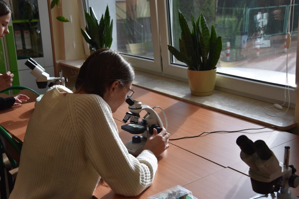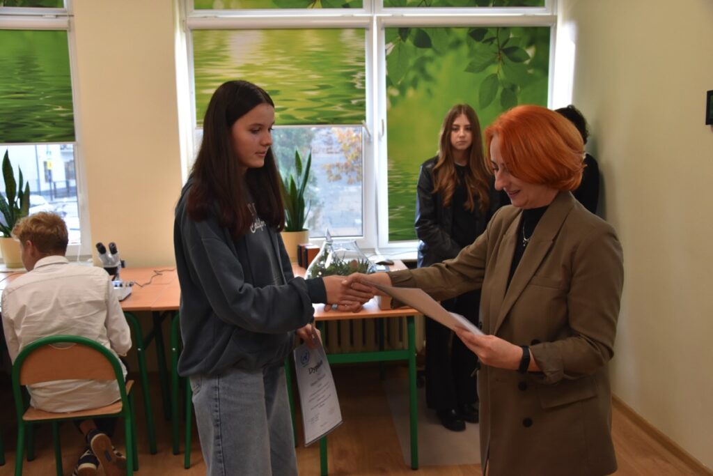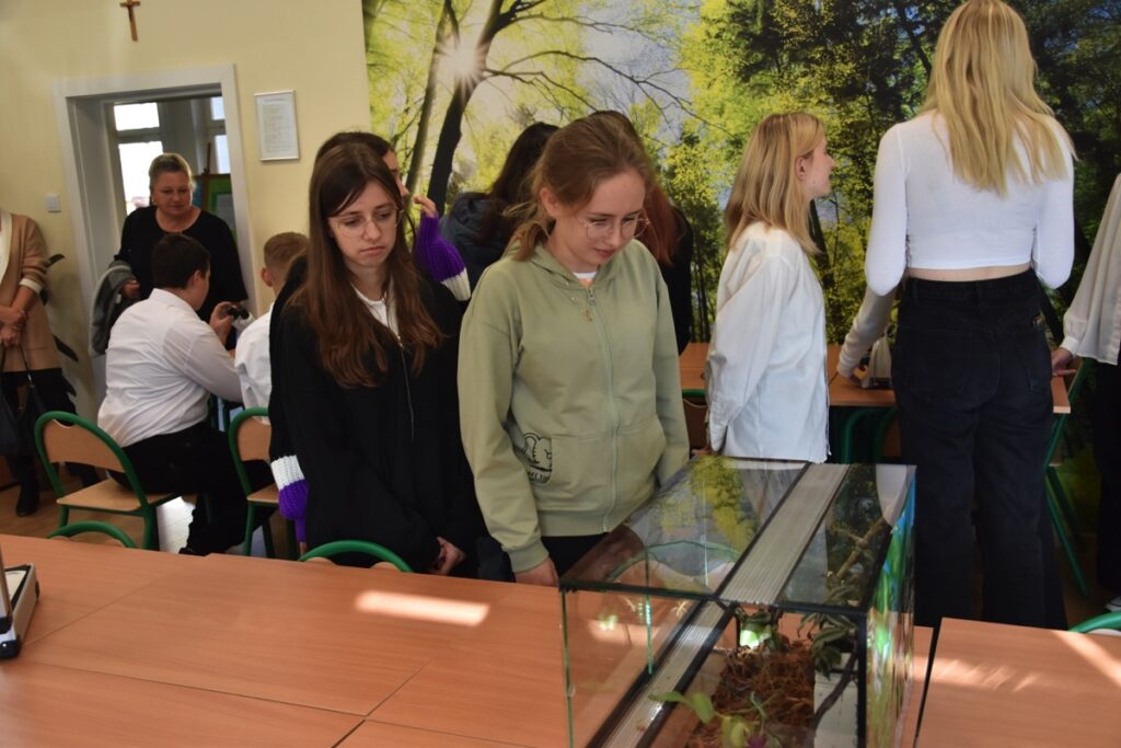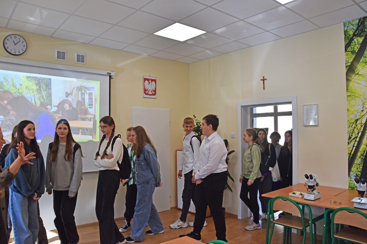 admin 2 lata temu Konkursy , Organizacyjne , Osiągnięcia26 października 2023 roku w naszym liceum odbył się Konkurs Ekologiczny dla uczniów klas siódmych i ósmych szkół podstawowych powiatu biłgorajskiego. Zwycięzcą konkursu został Jakub Szymanik ze Szkoły Podstawowej w Tarnogrodzie, kolejne równoległe miejsce zajęły Milena Jaskowska ze Szkoły Podstawowej w Dereźni Solskiej i Amelia Mulawa ze Szkoły Podstawowej w Luchowie Dolnym. Po napisaniu testu ekologicznego uczniowie wraz z opiekunami przeszli do nowo powstałej ekopracowni, na którą szkoła otrzymała dofinansowanie z projektu ,,Ekopracownia – zielone serce szkoły” realizowanego przez Wojewódzki Fundusz Ochrony Środowiska w Lublinie. W nowoczesnej pracowni młodzież zapoznała się z warunkami nauczania biologii w naszym liceum. Uczestnicy konkursu obejrzeli pomoce naukowe wykorzystywane podczas lekcji, samodzielnie prowadzili obserwacje mikroskopowe oraznauczyli się obsługi binokularu. Duże zainteresowanie młodzieży wzbudziło akwarium i hodowla patyczaków.