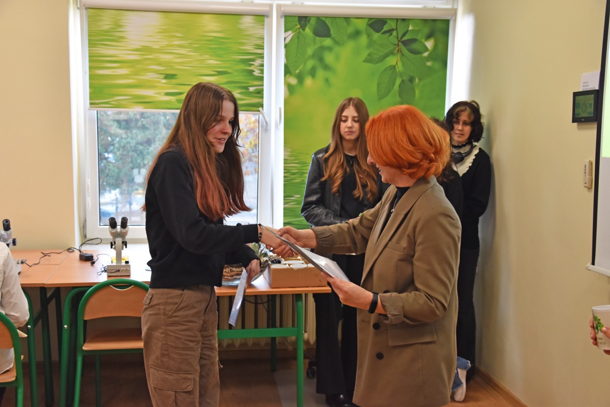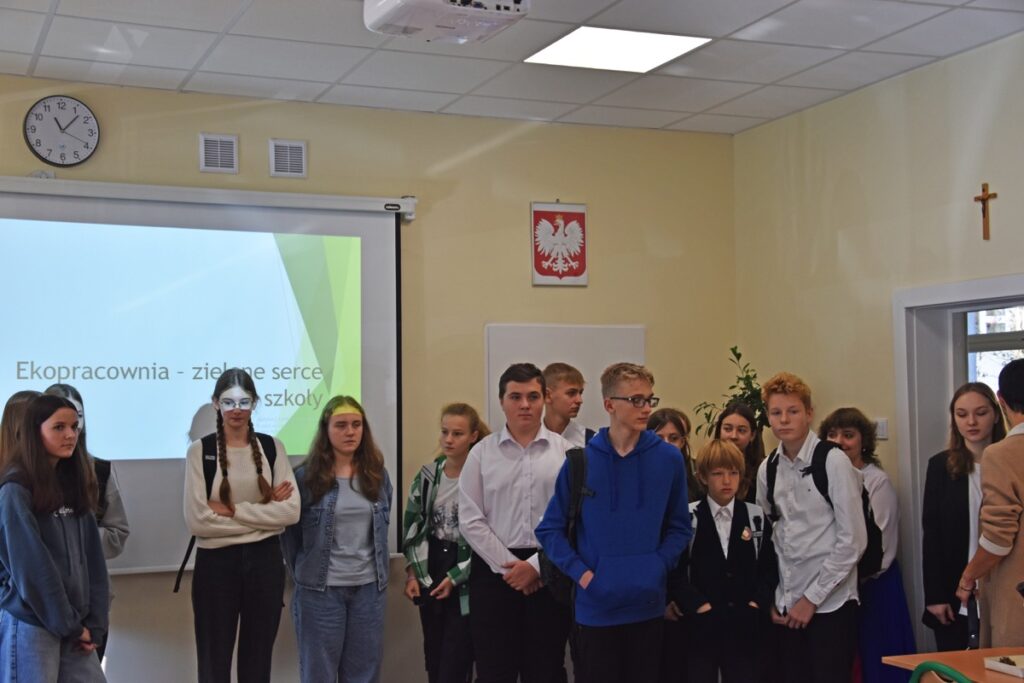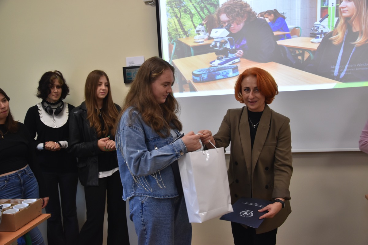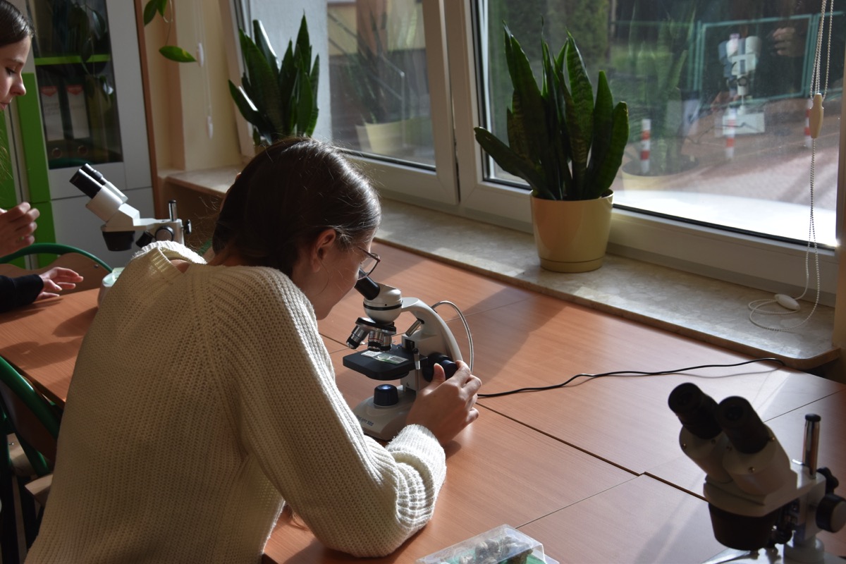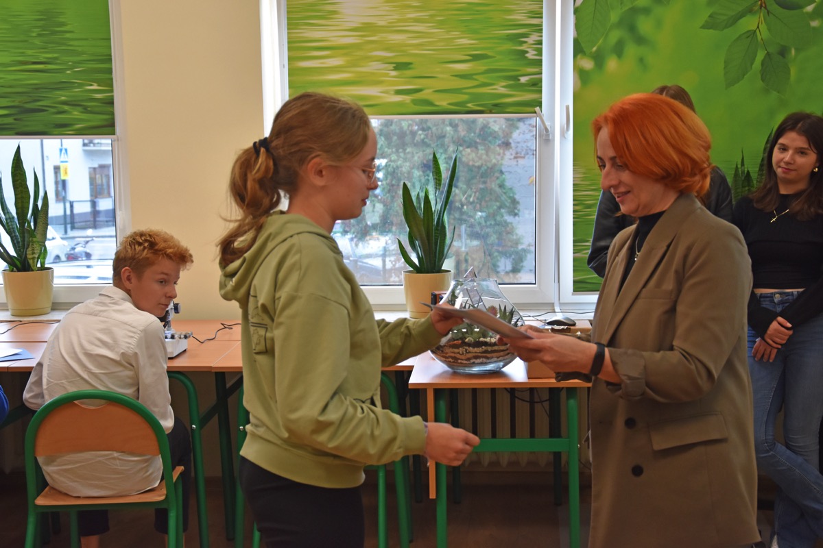 admin 2 lata temu Konkursy , Organizacyjne , Osiągnięcia26 października 2023 roku w naszym liceum odbył się Konkurs Ekologiczny dla uczniów klas siódmych i ósmych szkół podstawowych powiatu biłgorajskiego. Zwycięzcą konkursu został Jakub Szymanik ze Szkoły Podstawowej w Tarnogrodzie, kolejne równoległe miejsce zajęły Milena Jaskowska ze Szkoły Podstawowej w Dereźni Solskiej i Amelia Mulawa ze Szkoły Podstawowej w Luchowie Dolnym. Po napisaniu testu ekologicznego uczniowie wraz z opiekunami przeszli do nowo powstałej ekopracowni, na którą szkoła otrzymała dofinansowanie z projektu ,,Ekopracownia – zielone serce szkoły” realizowanego przez Wojewódzki Fundusz Ochrony Środowiska w Lublinie. W nowoczesnej pracowni młodzież zapoznała się z warunkami nauczania biologii w naszym liceum. Uczestnicy konkursu obejrzeli pomoce naukowe wykorzystywane podczas lekcji, samodzielnie prowadzili obserwacje mikroskopowe oraznauczyli się obsługi binokularu. Duże zainteresowanie młodzieży wzbudziło akwarium i hodowla patyczaków.