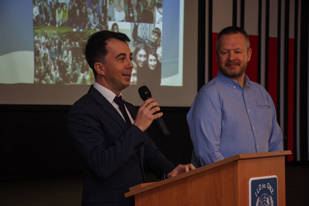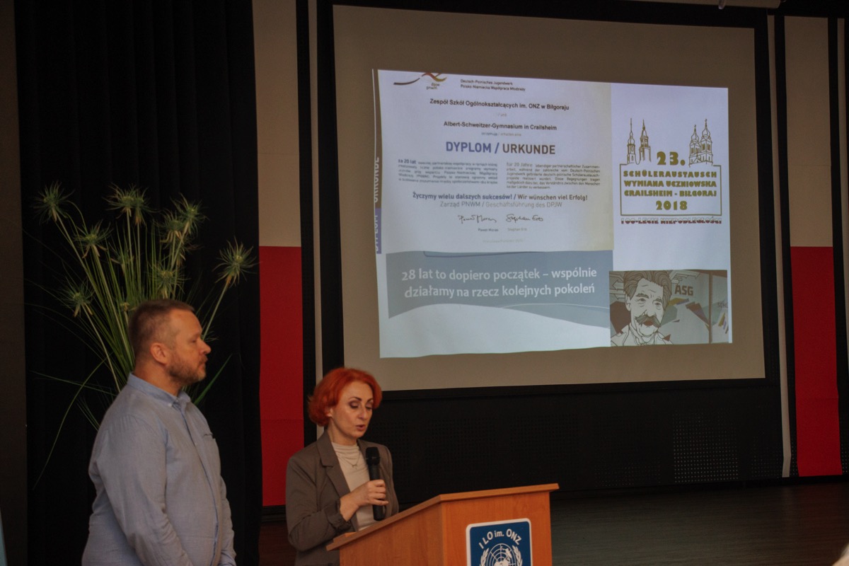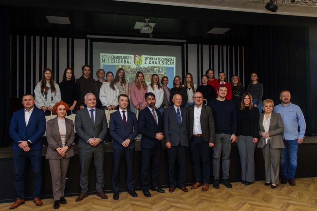 admin 1 rok temu Organizacyjne26 listopada 2024 roku w auli naszego liceum miało miejsce uroczyste powitanie delegacji z partnerskiego miasta Crailsheim w Niemczech. W wydarzeniu uczestniczyło 7 uczennic z Gimnazjum im. Alberta Schweitzera, które przybyły z trzema opiekunami: nauczycielką Brittą Streng, Honorowym Obywatelem Miasta Biłgoraja Manfredem Salingerem oraz odpowiedzialnym za współpracę międzynarodową w Urzędzie Miasta Crailsheim Christophem Salingerem. Powodem wizyty był zbliżający się jubileusz 25-lecia partnerstwa Biłgoraja i Crailsheim, które zostało formalnie zainaugurowane 16 września 2000 roku. W ramach przygotowań do jubileuszu niemieckie uczennice razem z polskimi koleżankami i kolegami rozpoczęły przygotowanie pracy plastycznej, która ma uświetnić przyszłoroczną rocznicę. Witając gości dyrektor Jolanta Rycyk podkreśliła znaczenie długoletniej – zainicjowanej już w 1995 roku – współpracy między szkołami w wymiarze lokalnym i międzynarodowym. W spotkaniu uczestniczyli także Starosta Biłgorajski Andrzej Szarlip oraz Burmistrz Miasta Biłgoraja Wojciech Gleń, którzy wyrazili radość z kontynuowania tego międzynarodowego partnerstwa. Interesująca i obfitująca w ciekawostki prezentacja przypomniała historię współpracy między obiema szkołami. Uczestnicy wydarzenia mieli także okazję poznać historię dotychczasowych wymian i wspólnie realizowanych projektów. Podkreślona została rola uczniów i nauczycieli w budowaniu trwałych przyjaźni między narodami. Szczególny charakter miało wystąpienie Manfreda Salingera współzałożyciela partnerstwa miast, który wspominał początki współpracy oraz znaczenie wzajemnego zrozumienia i solidarności między mieszkańcami Biłgoraja i Crailsheim. Na sali obecny był również były burmistrz Biłgoraja, Stefan Oleszczak, który przed laty rozpoczął międzynarodową współpracę naszego miasta z Crailsheim. Podczas dwudziestego szóstego już spotkania nie tylko podsumowano dotychczasowe osiągnięcia, ale również zainicjowano nowe projekty partnerskich szkół. Kolejne wydarzenia związane z obchodami 25-lecia partnerstwa Biłgoraja i Crailsheim odbędą się w przyszłym roku.