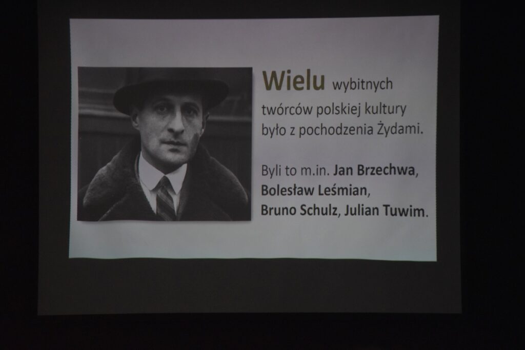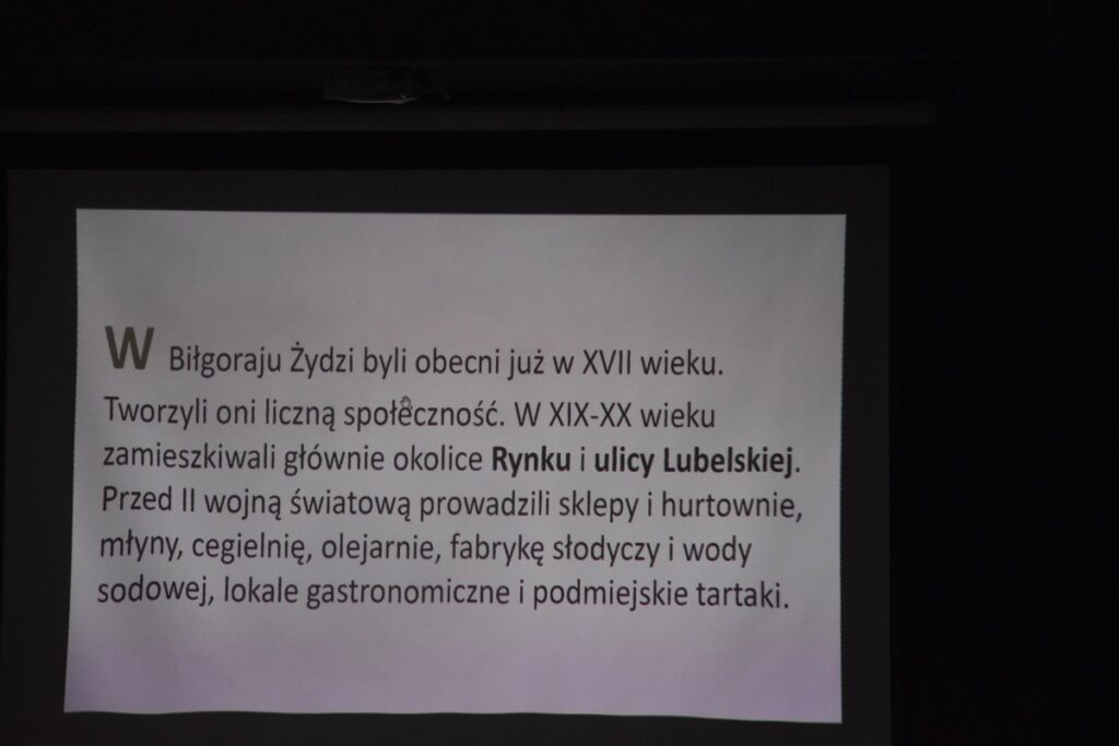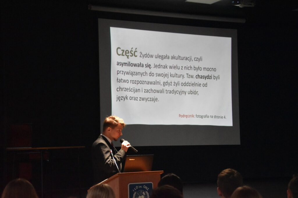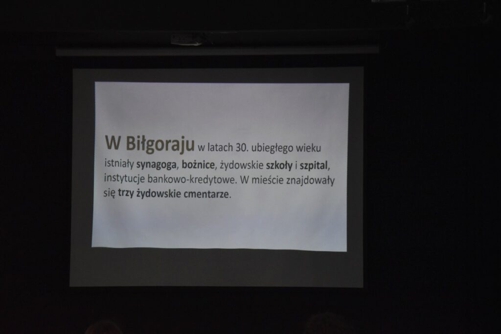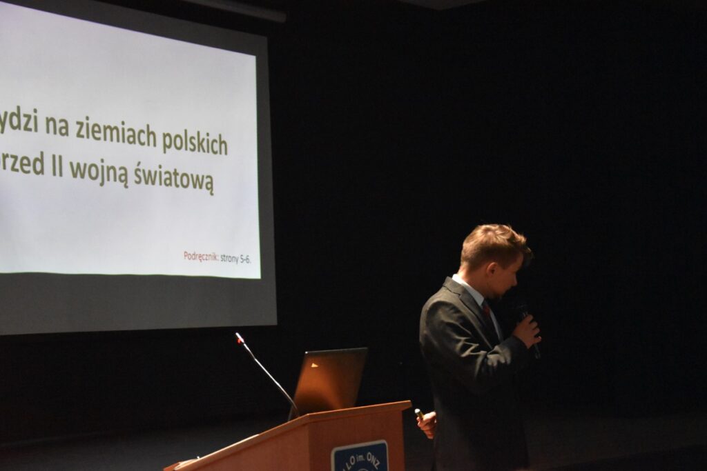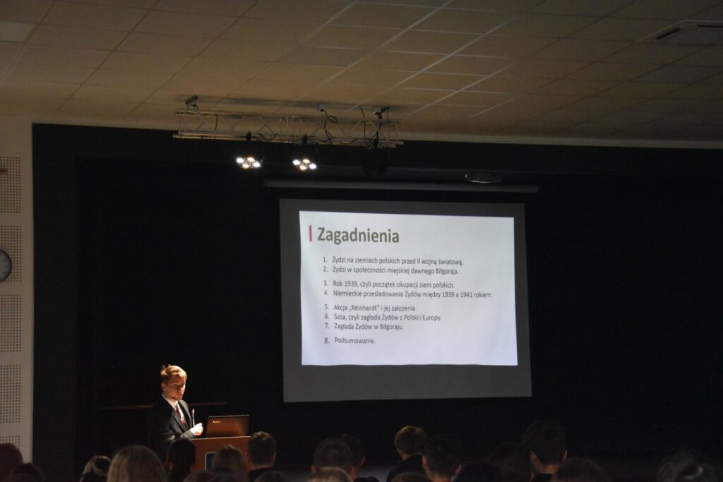 admin 3 lata temu Organizacyjne2 listopada 2022 r. w auli odbyła się lekcja otwarta historii „Tak jak by nas nigdy nie było”. W trakcie zajęć uczniowie zostali zapoznani z informacjami o kulturze żydowskiej i jej miejscu w kulturze dawnej Polski, a także roli ludności żydowskiej w społeczności miejskiej dawnego Biłgoraja. Ważnym ogniwem lekcji było omówienie Akcji „Reinhardt” i przebiegu wysiedlenia do obozu zagłady biłgorajskich Żydów. Wydarzenie to miało miejsce dokładnie 80 lat temu, czyli 2 listopada 1942 roku. Podczas zajęć uczniowie z klas: IV Ep, IV Fp, III E i II B, a także członkowie koła historii regionalnej poznali wojenne losy Pawła i Wiktorii Trzcińskich, mieszkańców Biłgoraja, którzy za pomoc udzieloną Żydom zostali rozstrzelani przez Niemców na początku 1943 roku. Odtworzone zostały także nagrania opowieści ich córki – Gabrieli Gorzandt, która relacjonowała wydarzenia z lat okupacji niemieckiej w Biłgoraju.
