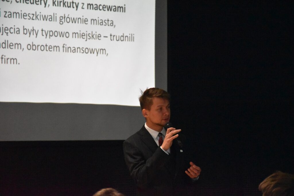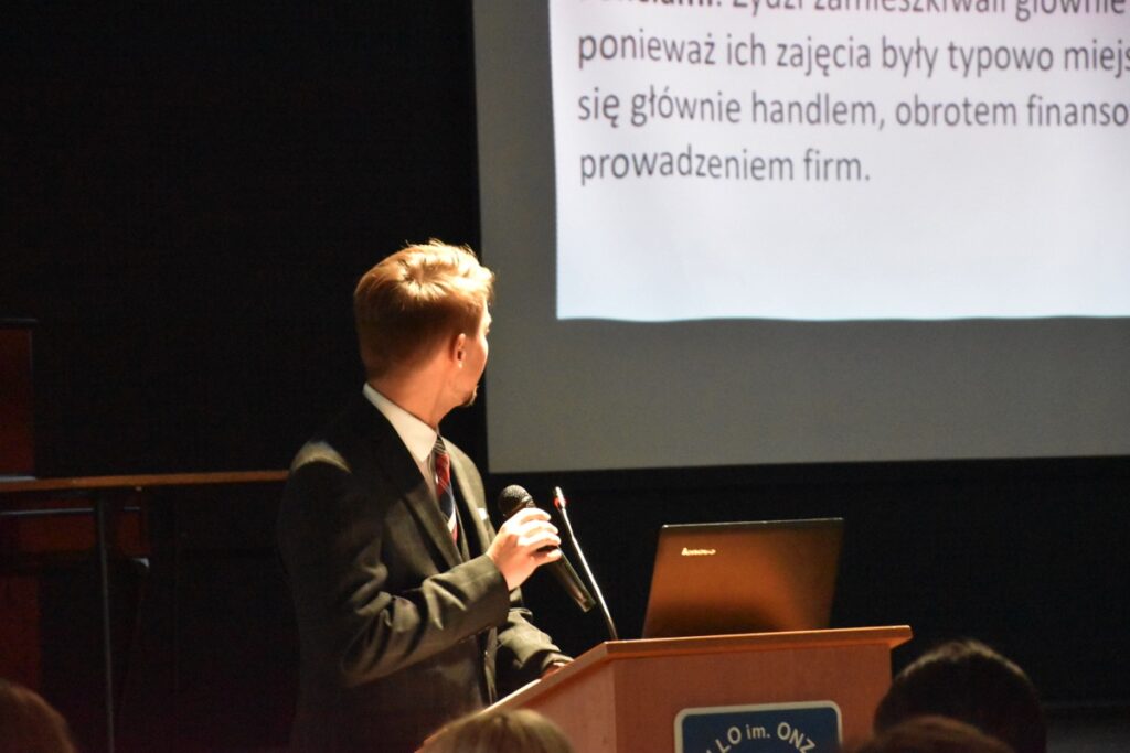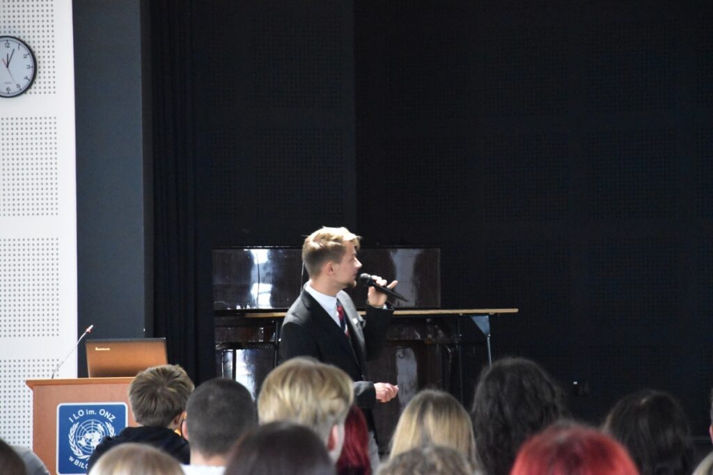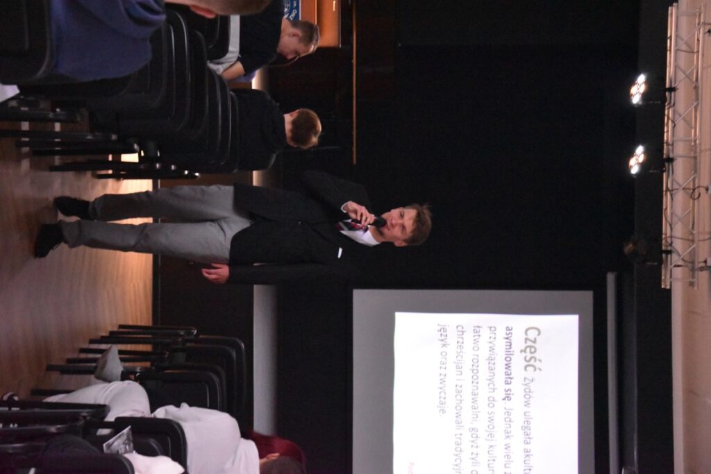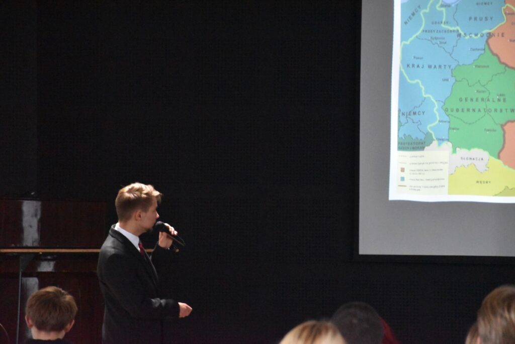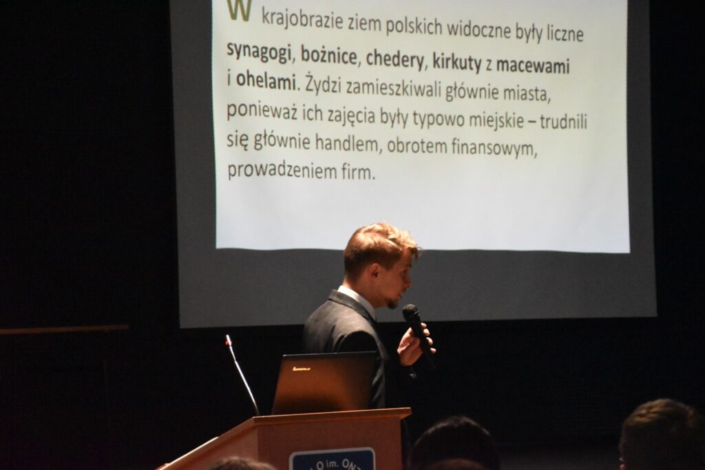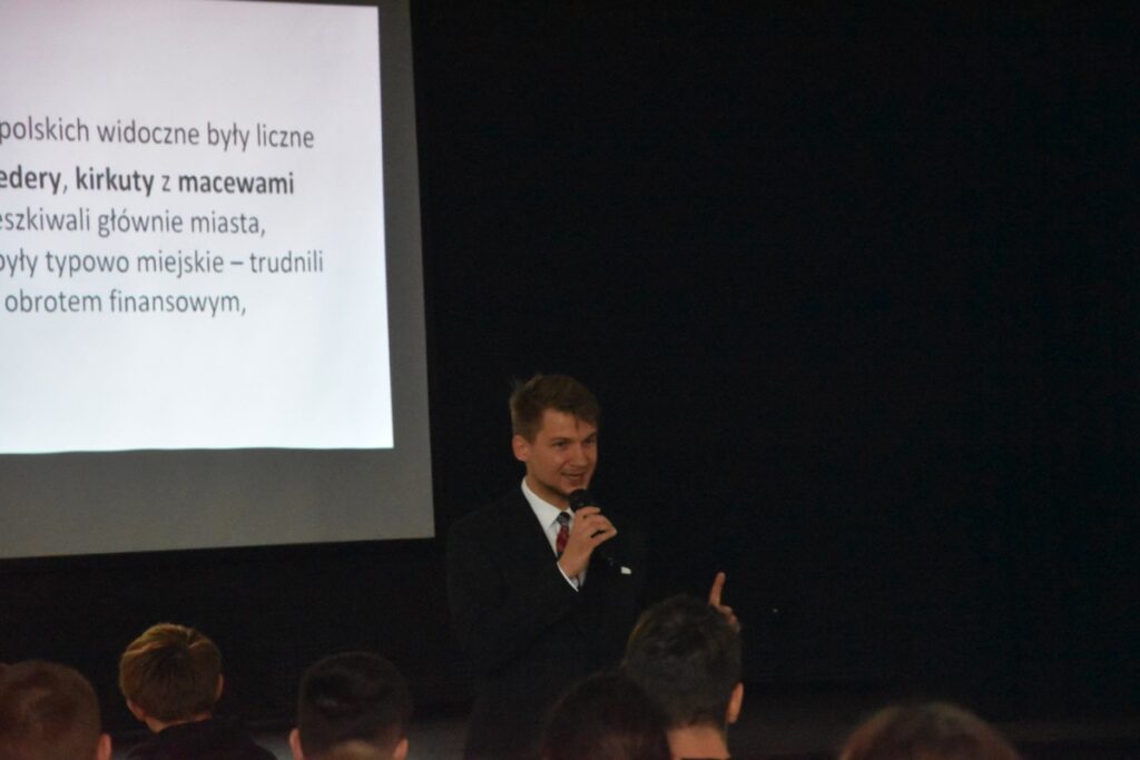 admin 3 lata temu Organizacyjne2 listopada 2022 r. w auli odbyła się lekcja otwarta historii „Tak jak by nas nigdy nie było”. W trakcie zajęć uczniowie zostali zapoznani z informacjami o kulturze żydowskiej i jej miejscu w kulturze dawnej Polski, a także roli ludności żydowskiej w społeczności miejskiej dawnego Biłgoraja. Ważnym ogniwem lekcji było omówienie Akcji „Reinhardt” i przebiegu wysiedlenia do obozu zagłady biłgorajskich Żydów. Wydarzenie to miało miejsce dokładnie 80 lat temu, czyli 2 listopada 1942 roku. Podczas zajęć uczniowie z klas: IV Ep, IV Fp, III E i II B, a także członkowie koła historii regionalnej poznali wojenne losy Pawła i Wiktorii Trzcińskich, mieszkańców Biłgoraja, którzy za pomoc udzieloną Żydom zostali rozstrzelani przez Niemców na początku 1943 roku. Odtworzone zostały także nagrania opowieści ich córki – Gabrieli Gorzandt, która relacjonowała wydarzenia z lat okupacji niemieckiej w Biłgoraju.