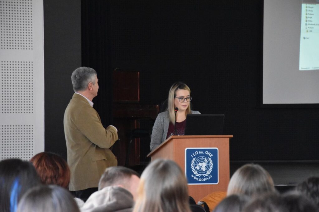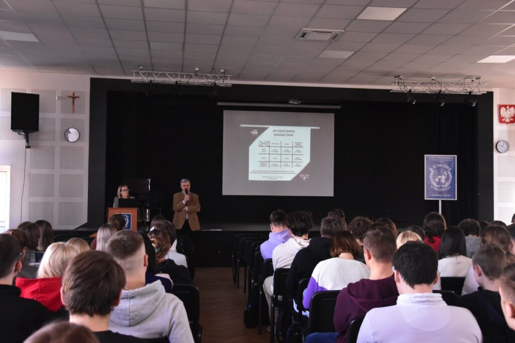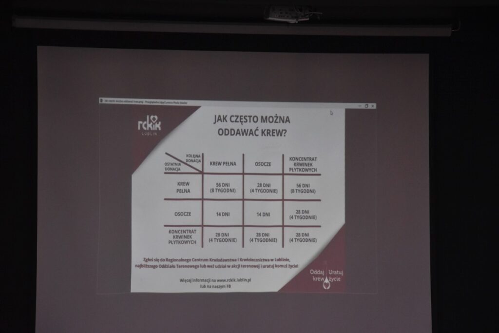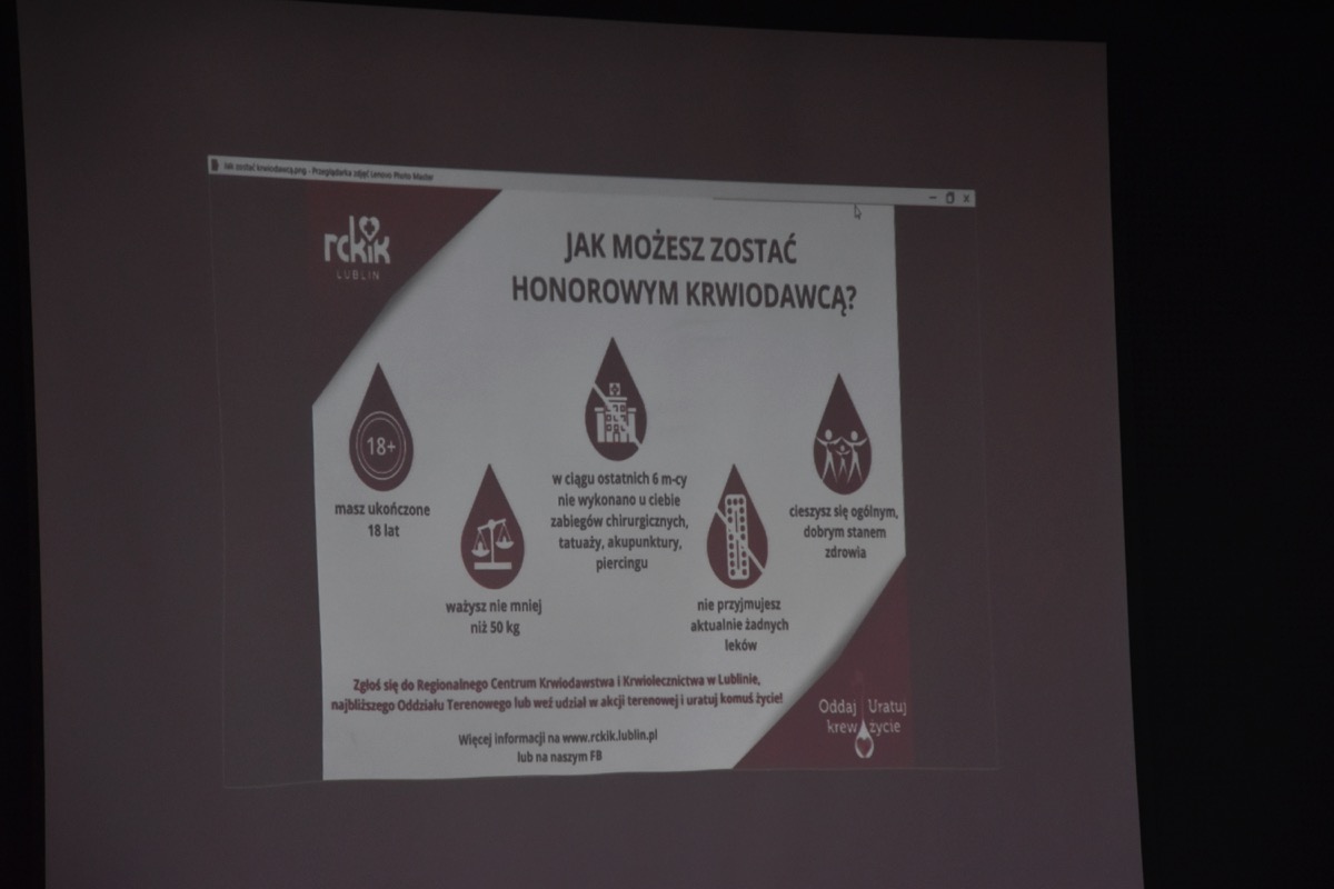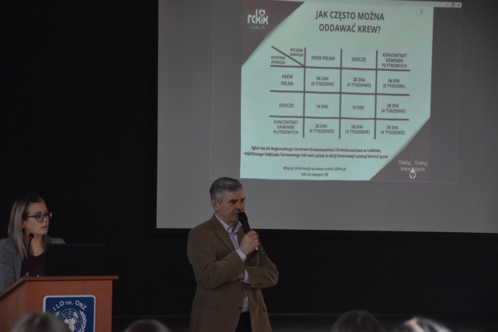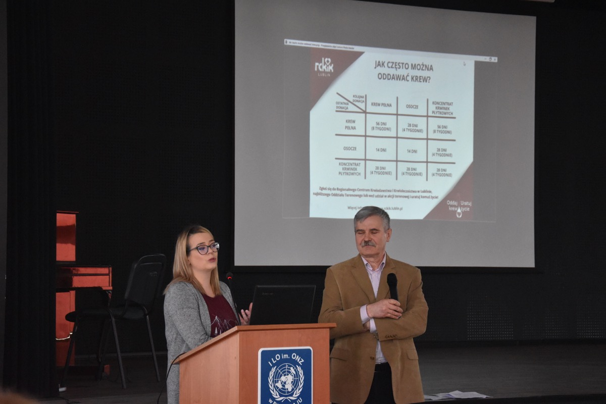 admin 3 lata temu Organizacyjne28 marca w auli naszej szkoły odbyło się spotkanie z panią Elżbietą Bryłą i panem Edwardem Kurzyną, pracownikami Zarządu Rejonowego Polskiego Czerwonego Krzyża w Biłgoraju. Głównym celem wizyty było zachęcenie licealistów do aktywnego zaangażowania się w akcję honorowego krwiodawstwa, która odbędzie się w naszej szkole 18 kwietnia 2023 r. Zaproszeni goście wymienili korzyści płynące z oddawania krwi na rzecz osób potrzebujących oraz apelowali, aby młodzi ludzie przystępowali do ruchu honorowego krwiodawstwa.