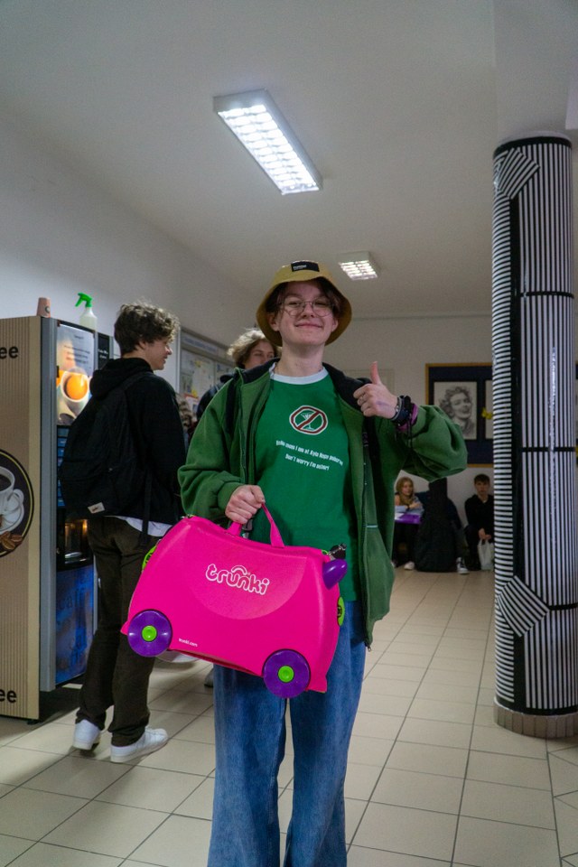 Grill, drukarka, wózek dla lalek, walizka lub zabawkowe auto – to niestandardowe plecaki naszych licealistów, którzy 1 kwietnia 2022 roku obchodzili „Dzień bez plecaka”. Uczniowie dołożyli wszelkich starań, aby znaleźć alternatywne rozwiązania i swoje książki, zeszyty oraz przybory szkolne umieścić w „czymś innym” niż na co dzień. Dzięki temu, że młodzież wykazała się niezwykłą kreatywnością i poczuciem humoru, piątek upłynął w szkole w wyjątkowo radosnej atmosferze. Nauczycielom podobały się pomysły uczniów i również przyłączyli się do akcji.