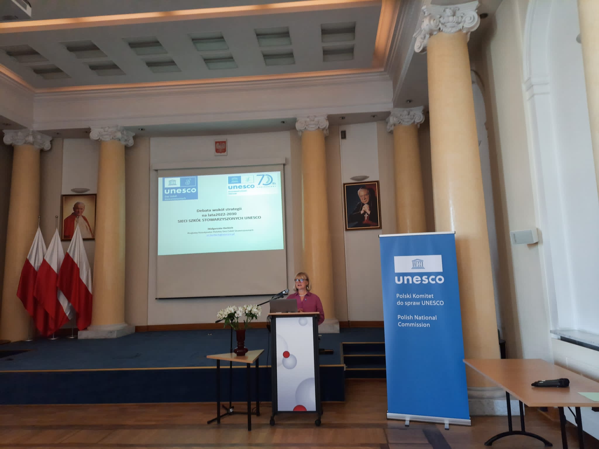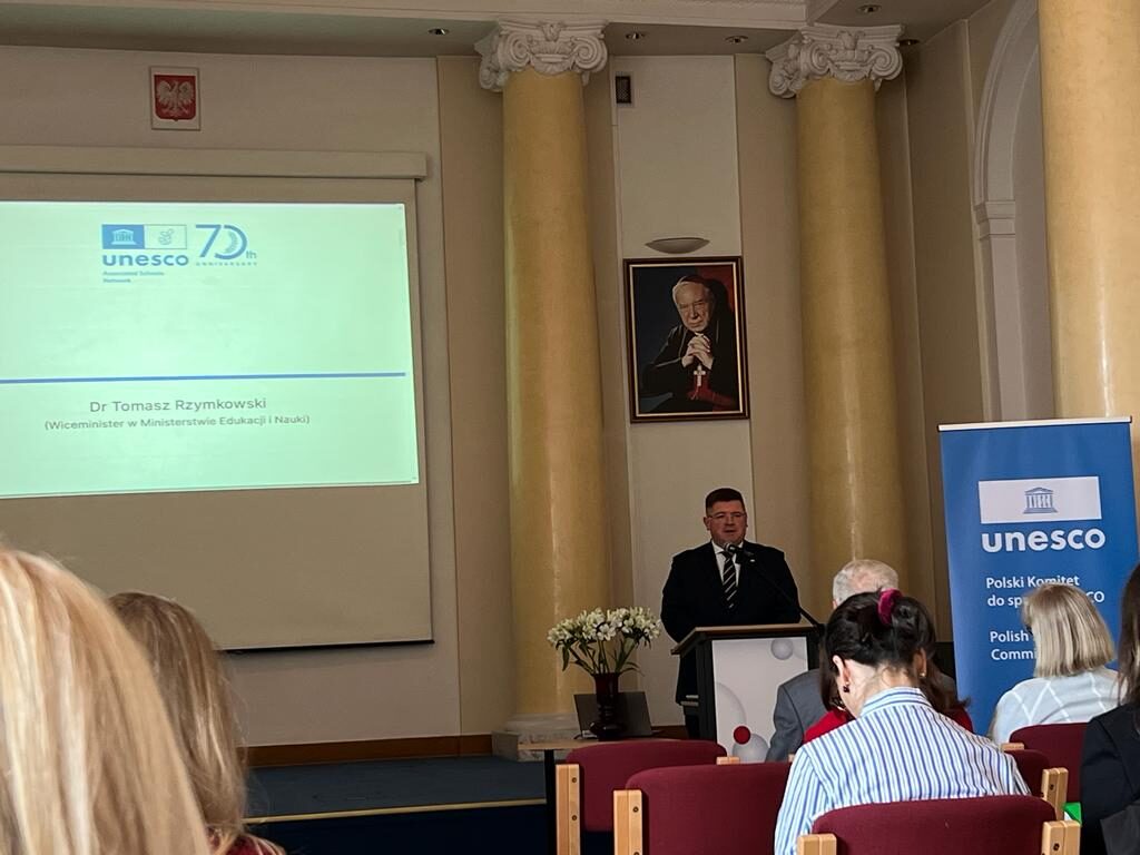admin 3 lata temu OrganizacyjneW dniach 25-26 maja 2023 r. w Ośrodku Rozwoju Edukacji w Warszawie miały miejsce uroczyste obchody 70-lecia Sieci Szkół Stowarzyszonych UNESCO, zorganizowane przez Polski Komitet ds. UNESCO oraz Ministerstwo Edukacji i Nauki. W jubileuszu uczestniczyli koordynatorzy i przedstawiciele szkół należących do Sieci Szkół Stowarzyszonych, a także honorowi goście m. in. Sekretarz Stanu dr Tomasz Rzymkowski, prof. Michał Kleiber oraz Koordynator Krajowy Polskiej Sieci Szkół Stowarzyszonych, pani Małgorzata Herbich. Naszą szkołę reprezentowała pani Aneta Swatowska.