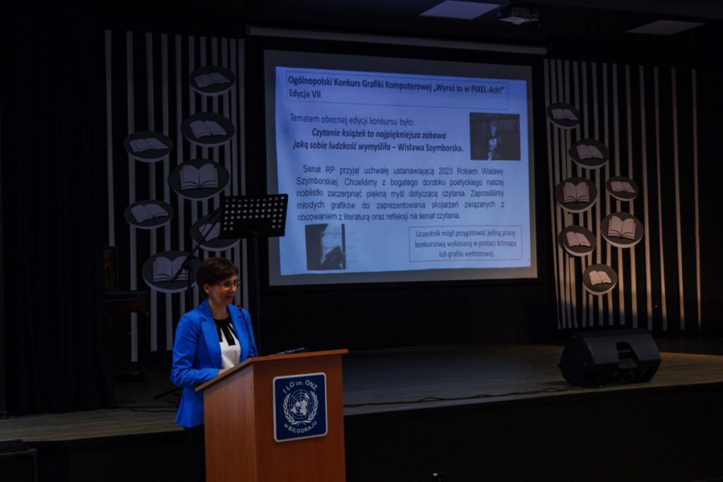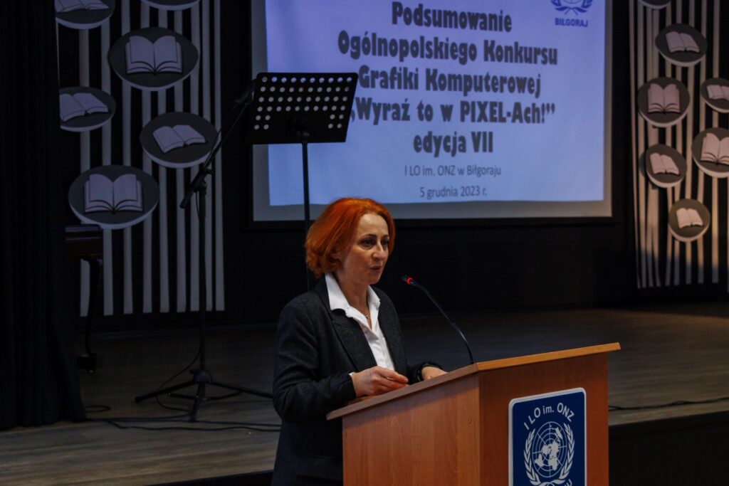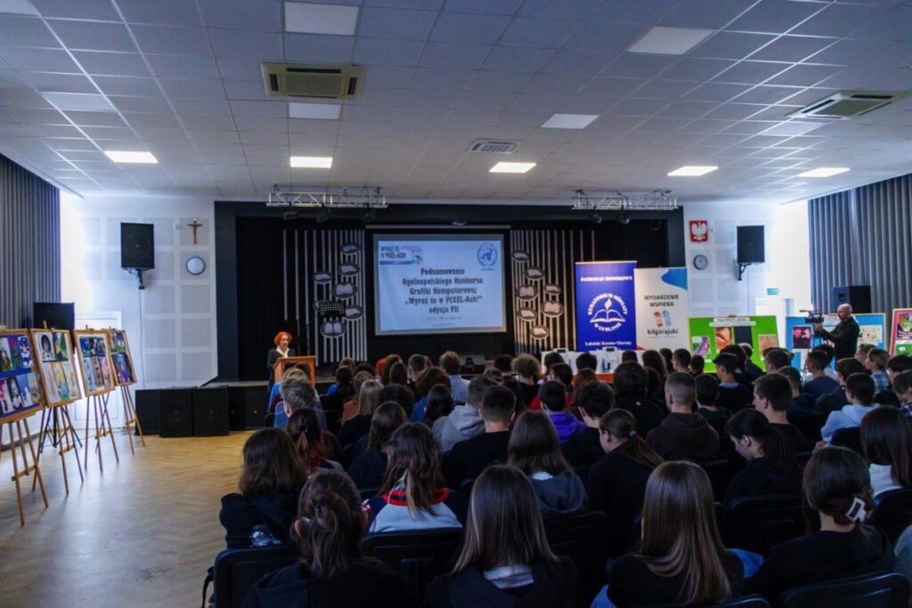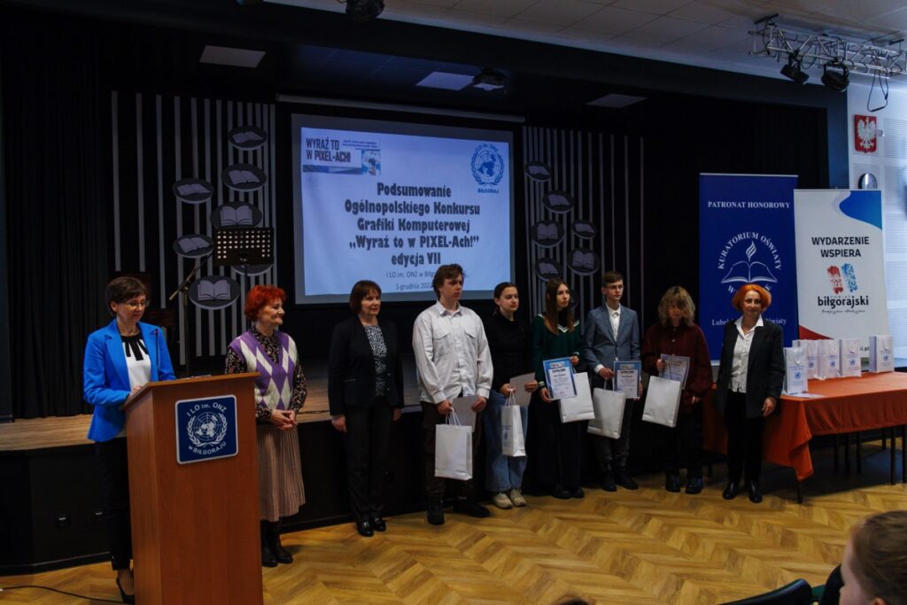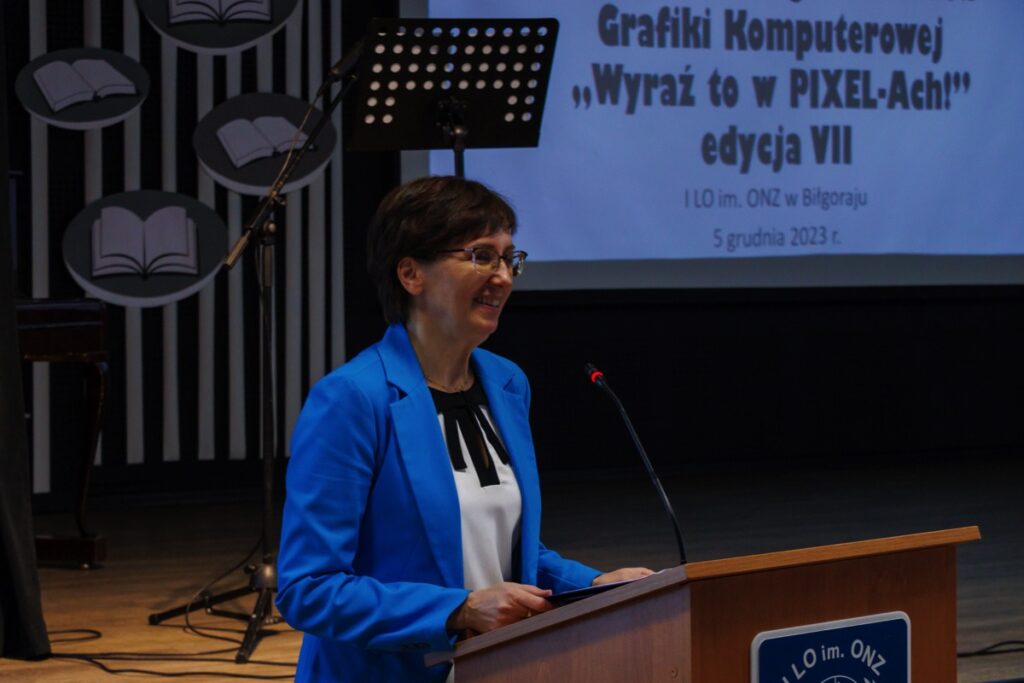 admin 2 lata temu Konkursy , Organizacyjne5 grudnia 2023 r. w naszym liceum odbyło się uroczyste podsumowanie VII edycji Ogólnopolskiego Konkursu Grafiki Komputerowej „Wyraź to w PIXEL-Ach!”, który zorganizowany został pod honorowym patronatem pani Beaty Strzałki Posła na Sejm RP, pani Teresy Misiuk Lubelskiego Kuratora Oświaty, pana Andrzeja Szarlipa Starosty Biłgorajskiego oraz pana Janusza Rosłana Burmistrza Miasta Biłgoraja.