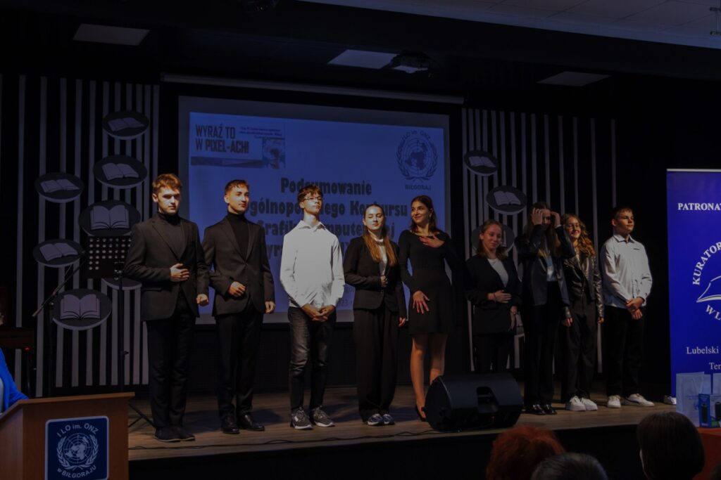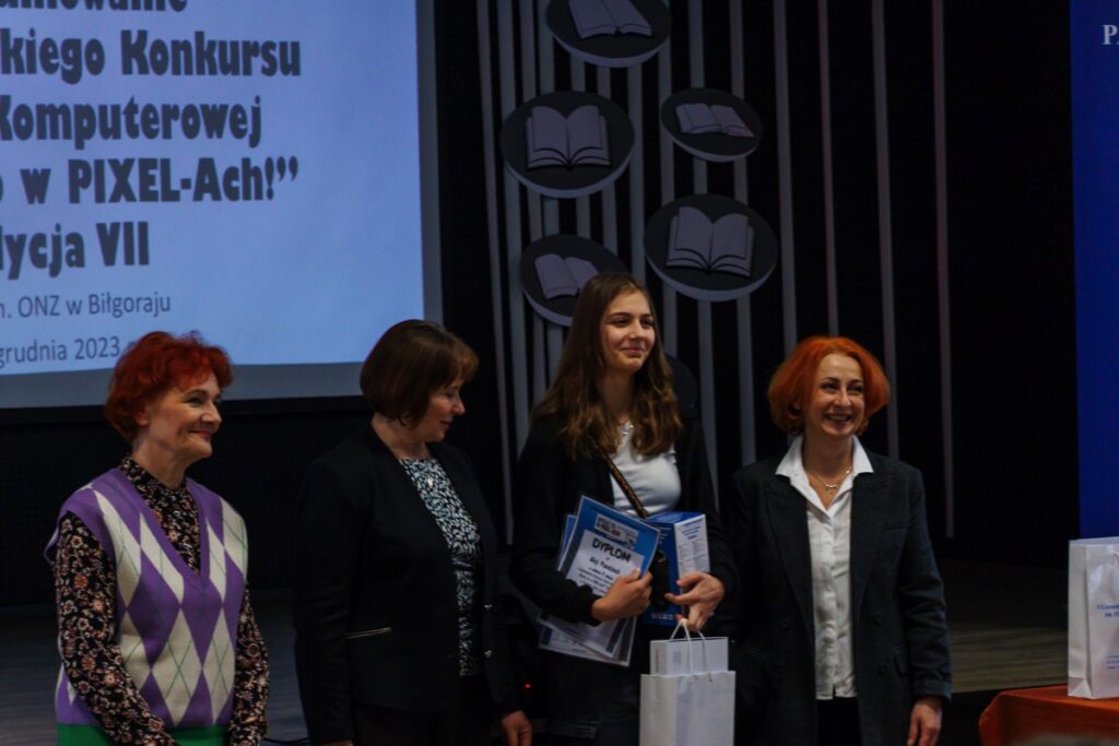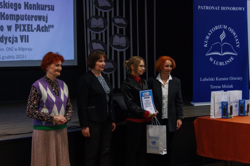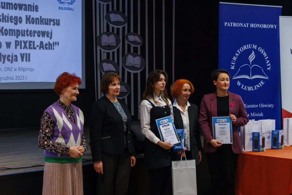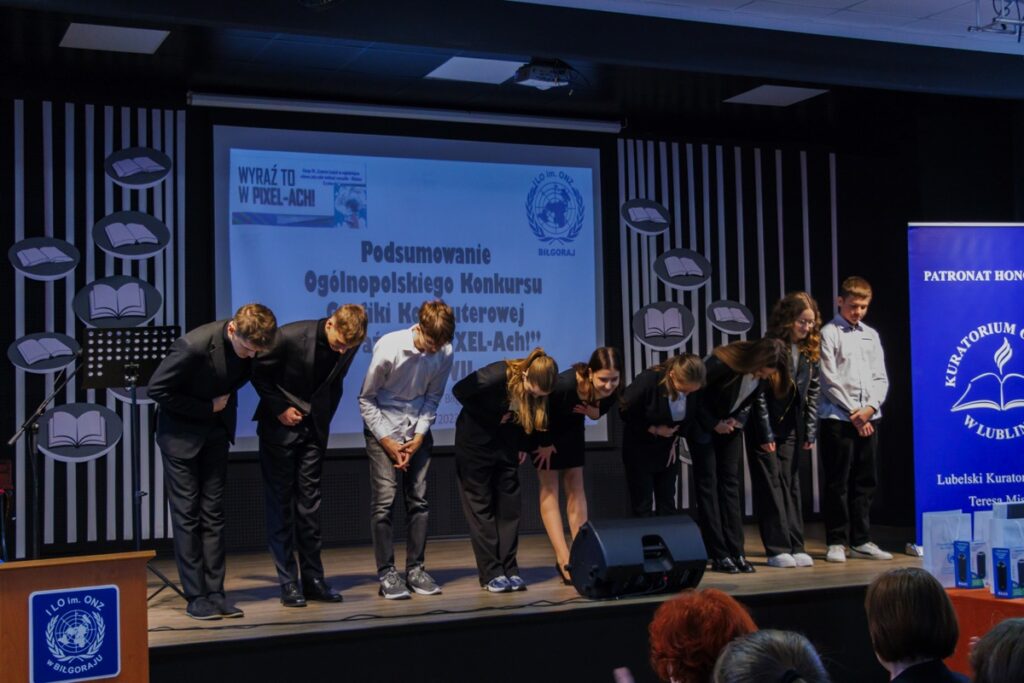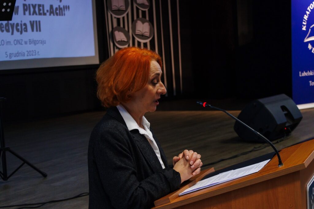 admin 2 lata temu Konkursy , Organizacyjne5 grudnia 2023 r. w naszym liceum odbyło się uroczyste podsumowanie VII edycji Ogólnopolskiego Konkursu Grafiki Komputerowej „Wyraź to w PIXEL-Ach!”, który zorganizowany został pod honorowym patronatem pani Beaty Strzałki Posła na Sejm RP, pani Teresy Misiuk Lubelskiego Kuratora Oświaty, pana Andrzeja Szarlipa Starosty Biłgorajskiego oraz pana Janusza Rosłana Burmistrza Miasta Biłgoraja.