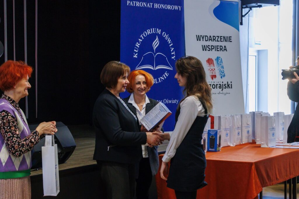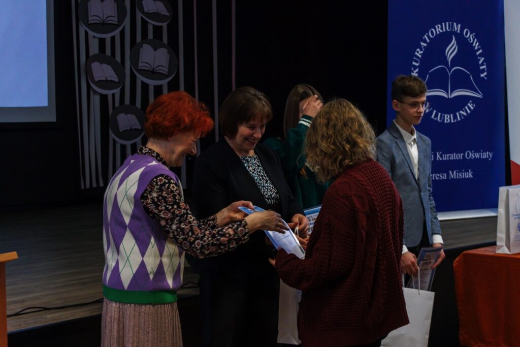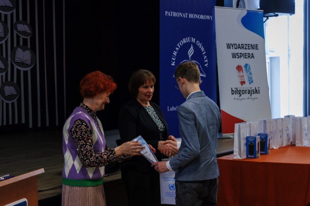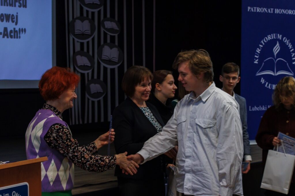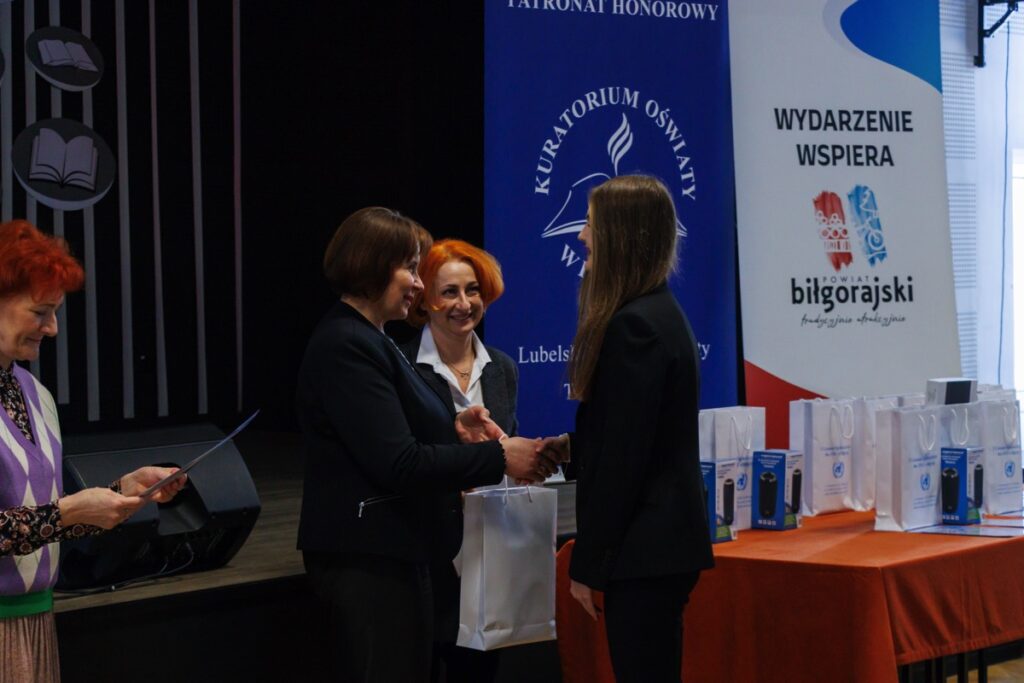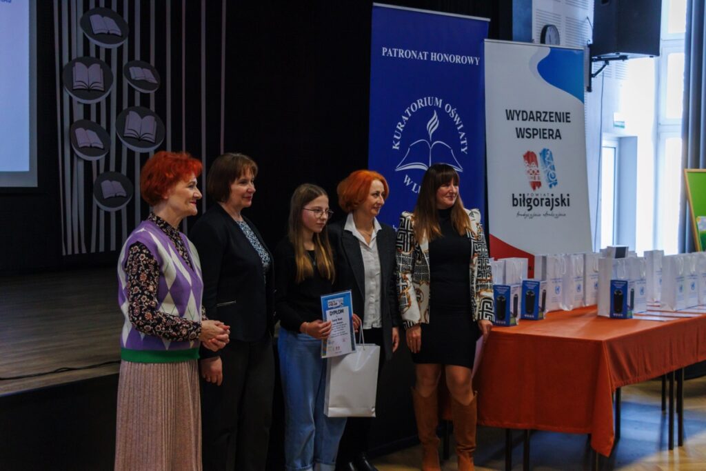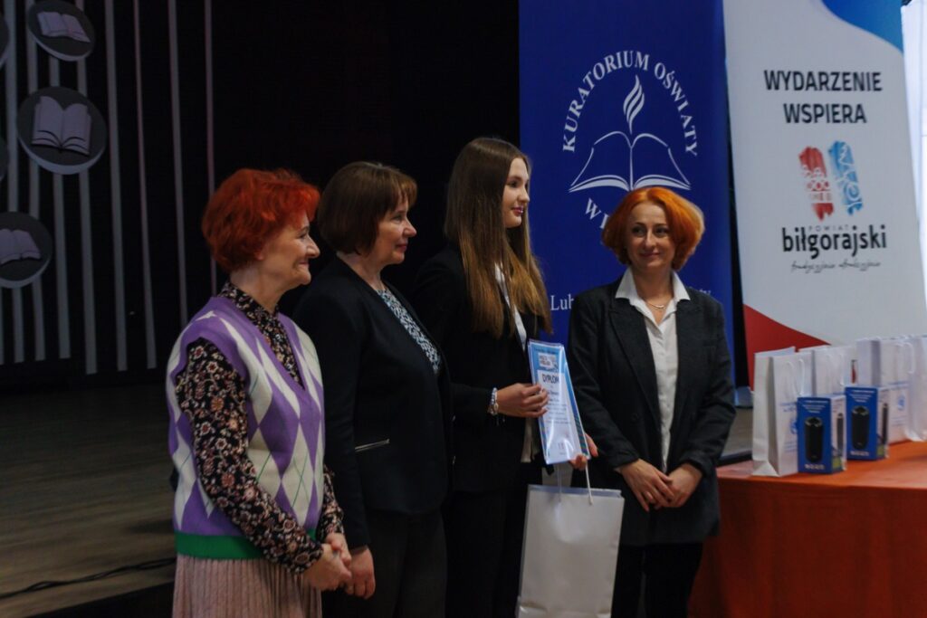 Laureatom konkursu, którzy przybyli na uroczystość z Garwolina, Lublina, Stalowej Woli, Zamościa i Biłgoraja dyplomy oraz nagrody wręczyły: pani Maria Gałka – Etatowy Członek Zarządu Powiatu, pani Marta Marchewka-Skurzak – kierownik Wydziału Oświaty, Kultury, Sportu i Turystyki Starostwa Powiatowego w Biłgoraju oraz pani Katarzyna Tkaczyk, wicedyrektor naszego liceum. Cenne nagrody zostały ufundowane przez Lubelskiego Kuratora Oświaty oraz Starostę Biłgorajskiego. Miłym akcentem było także wręczenie wyróżnień ufundowanych przez Burmistrza Miasta Biłgoraja.
