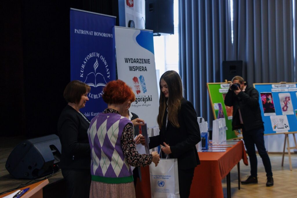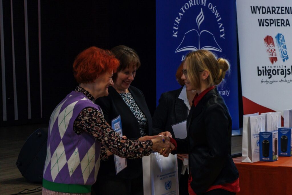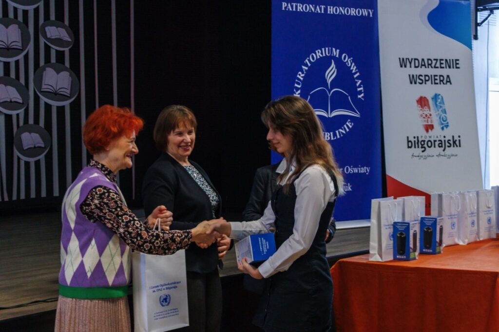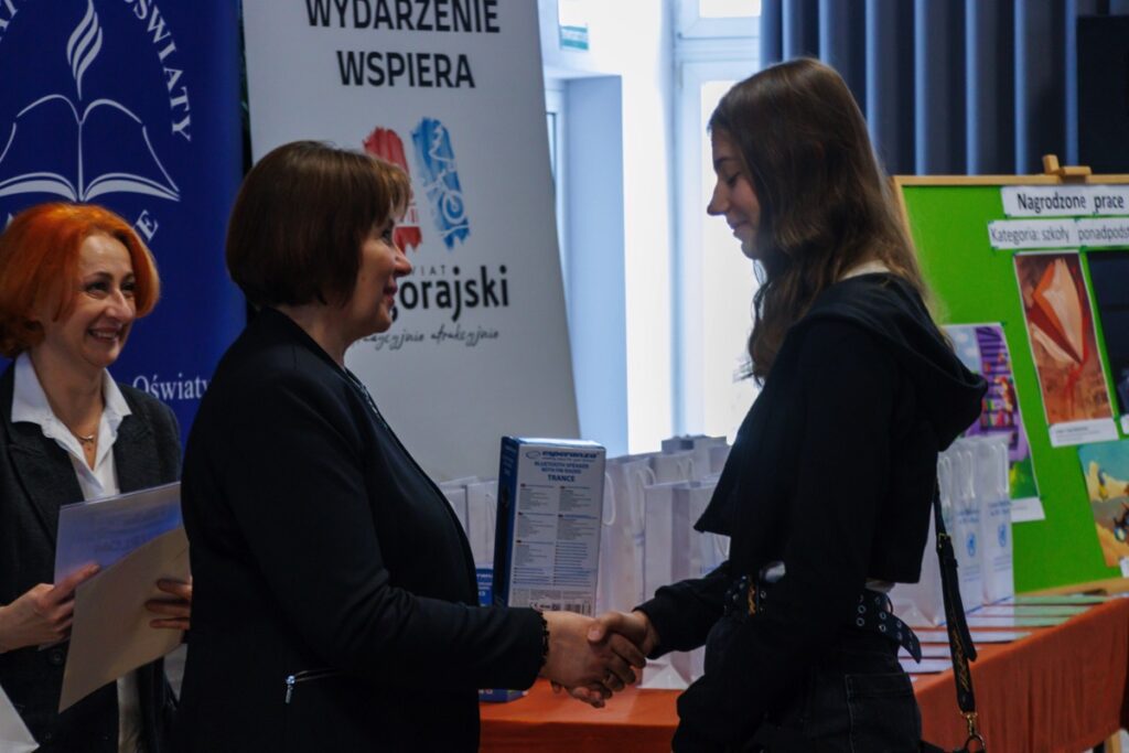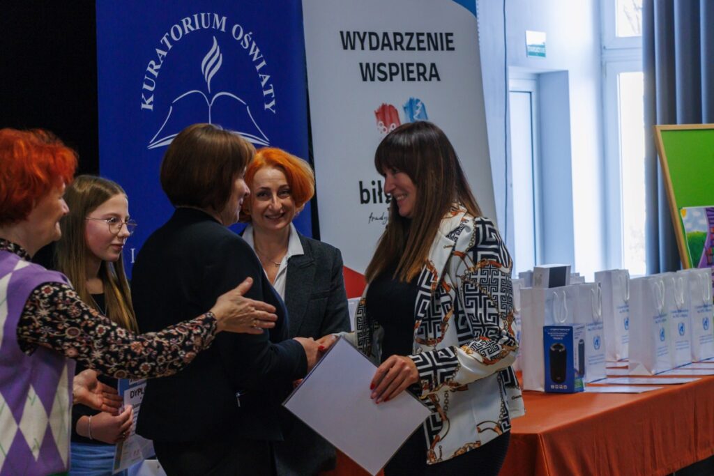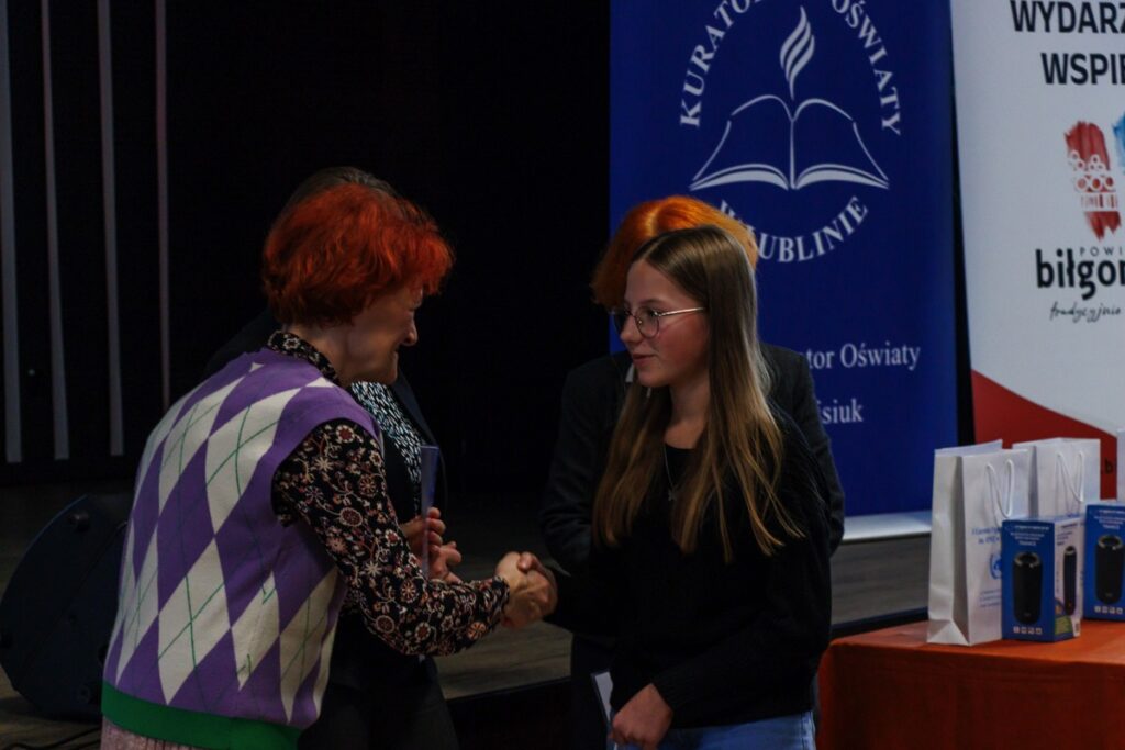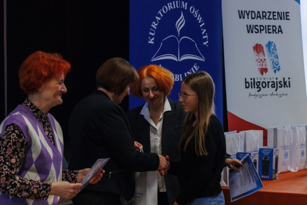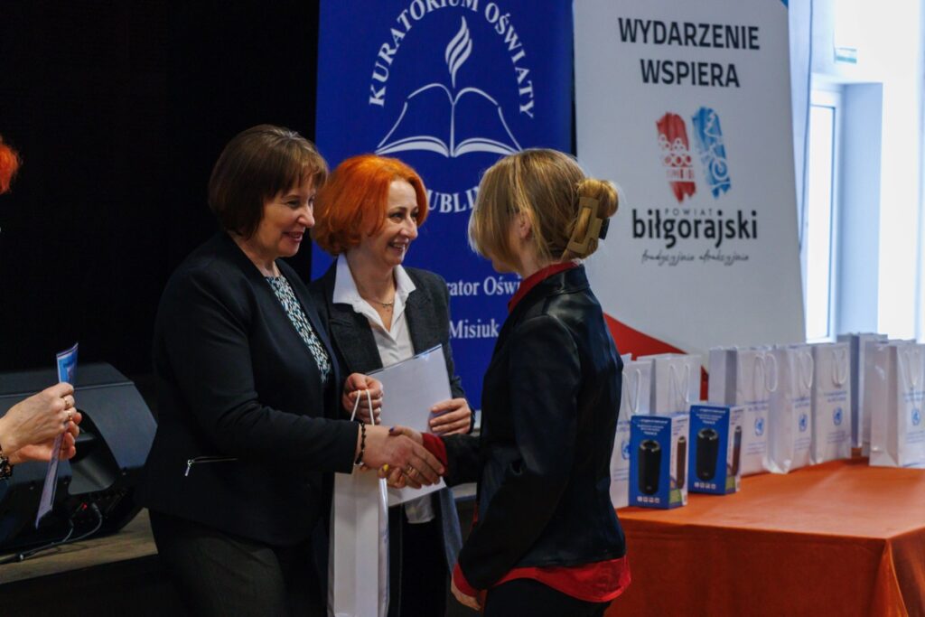Laureatom konkursu, którzy przybyli na uroczystość z Garwolina, Lublina, Stalowej Woli, Zamościa i Biłgoraja dyplomy oraz nagrody wręczyły: pani Maria Gałka – Etatowy Członek Zarządu Powiatu, pani Marta Marchewka-Skurzak – kierownik Wydziału Oświaty, Kultury, Sportu i Turystyki Starostwa Powiatowego w Biłgoraju oraz pani Katarzyna Tkaczyk, wicedyrektor naszego liceum. Cenne nagrody zostały ufundowane przez Lubelskiego Kuratora Oświaty oraz Starostę Biłgorajskiego. Miłym akcentem było także wręczenie wyróżnień ufundowanych przez Burmistrza Miasta Biłgoraja.
