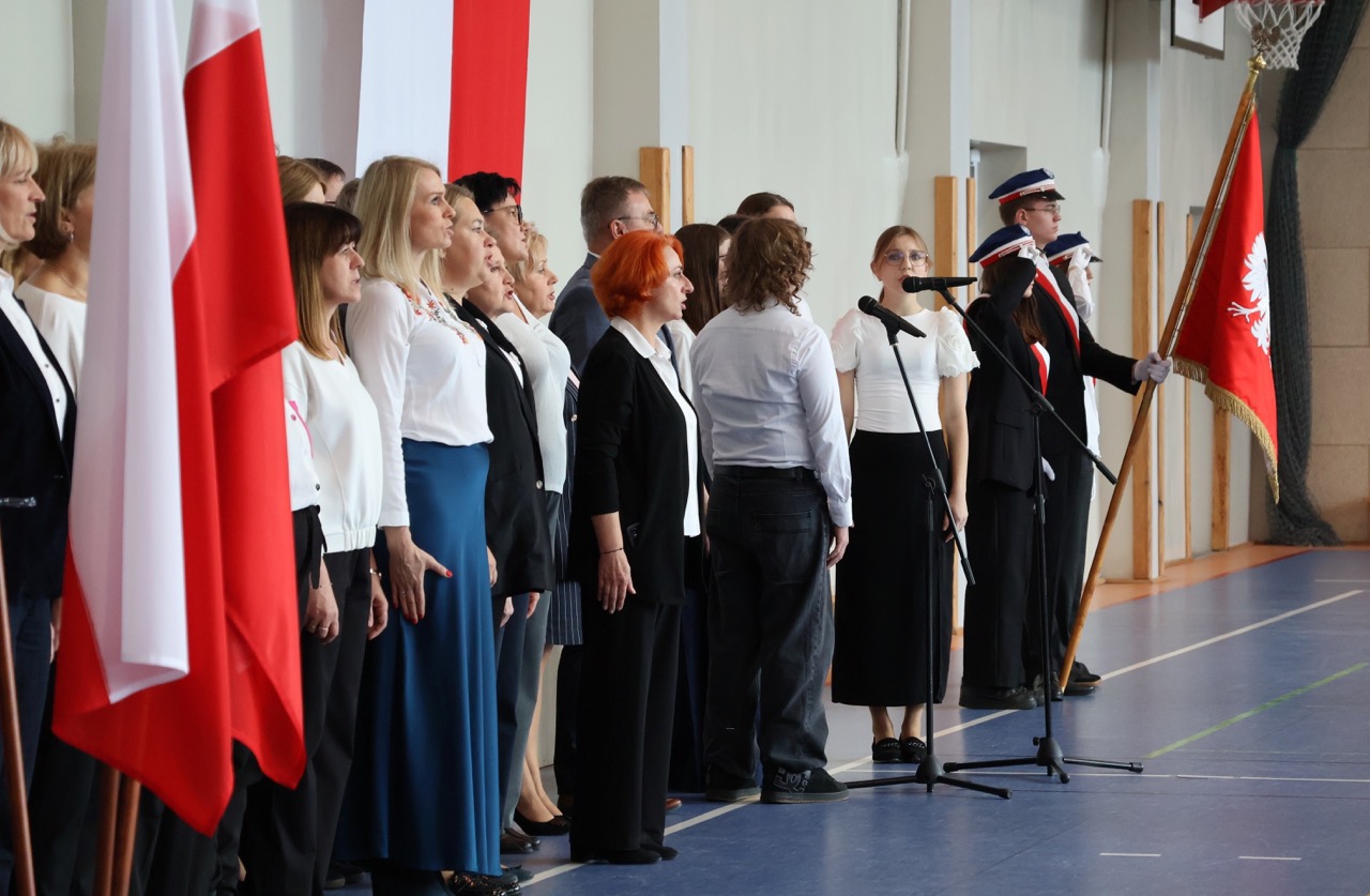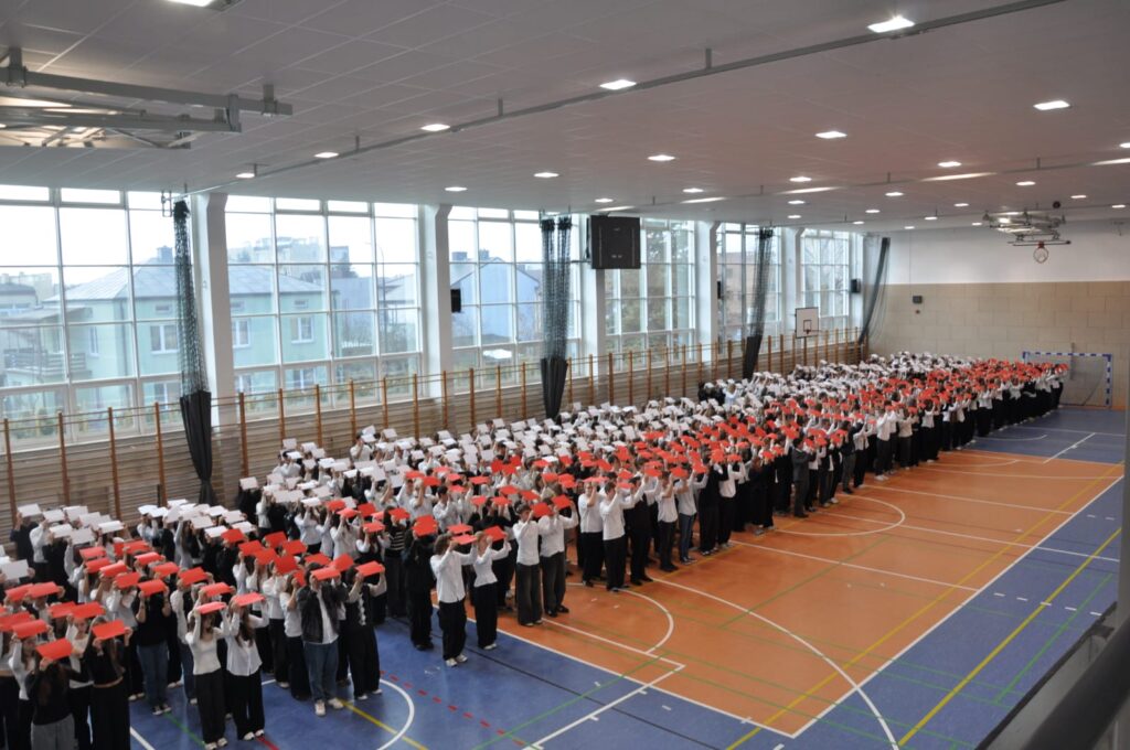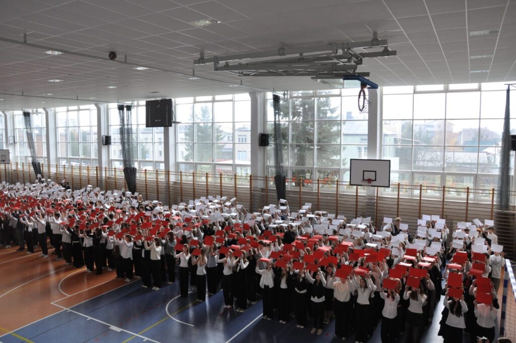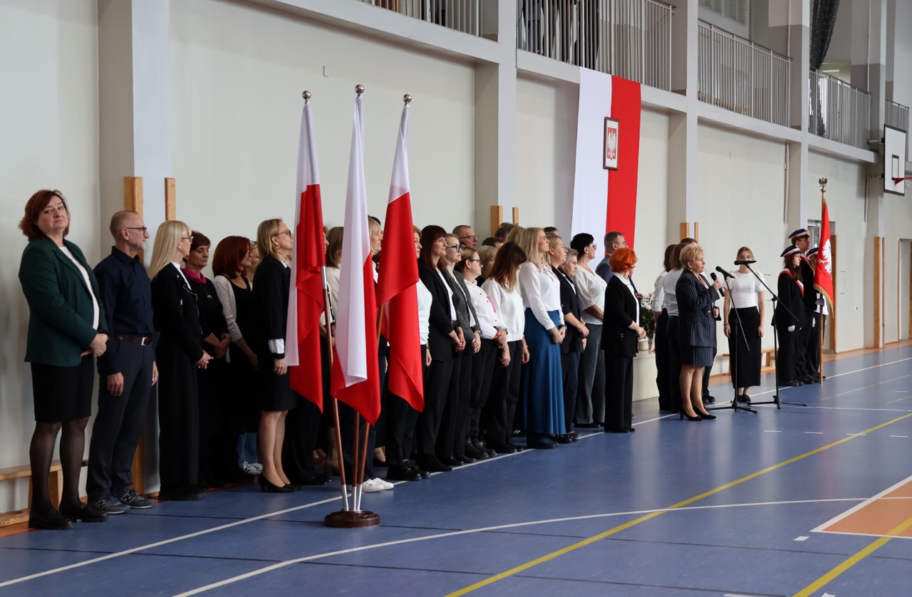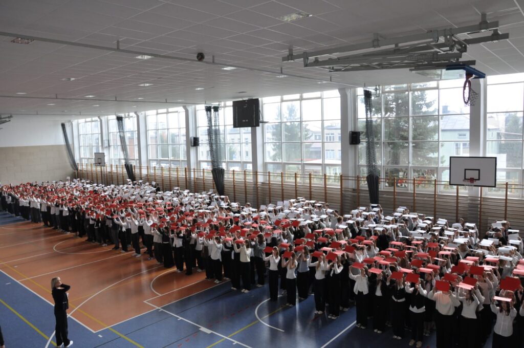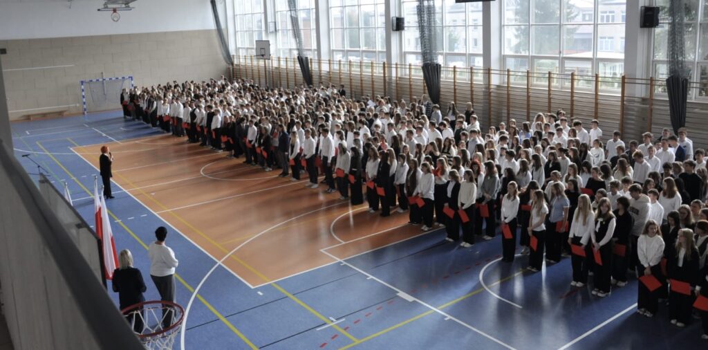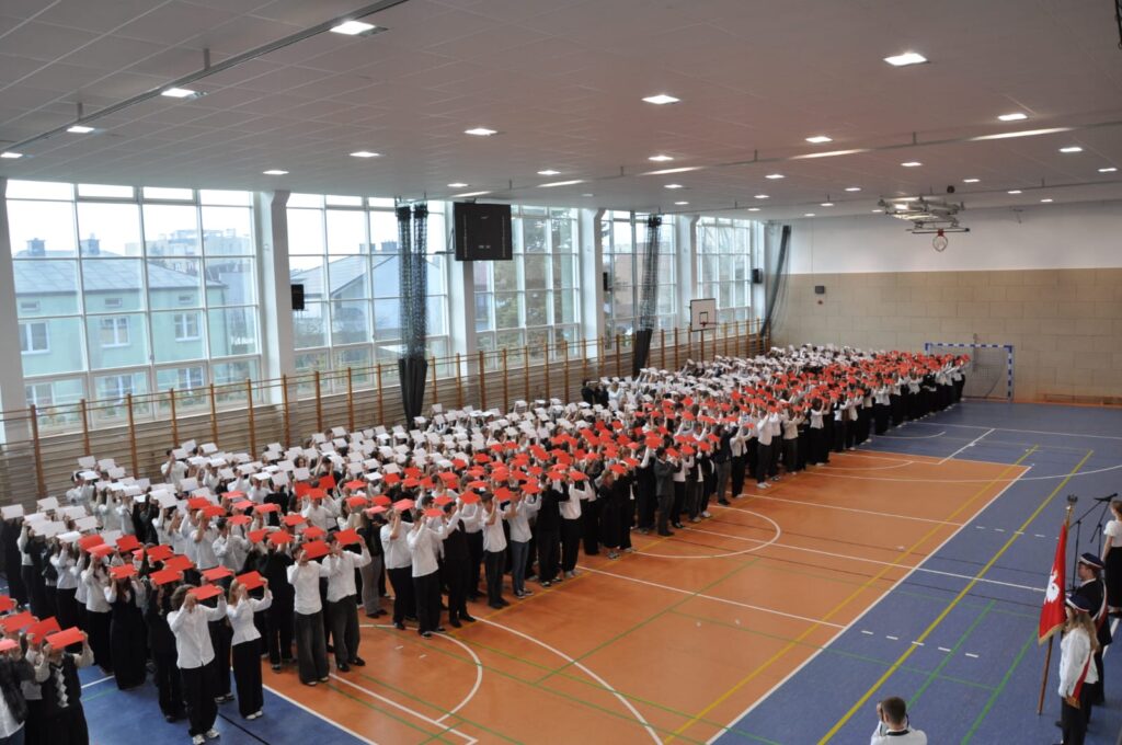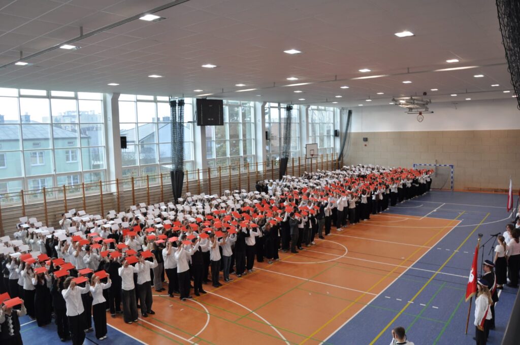 admin 5 miesięcy temu Organizacyjne , UroczystościDo tradycji naszej szkoły należy wspólne śpiewanie „Mazurka Dąbrowskiego”, będącego ważnym ogniwem projektu patriotycznego „Szkoła do hymnu” realizowanego z inicjatywy Ministerstwa Edukacji Narodowej. W tym roku hymn państwowy wybrzmiał po raz kolejny w sali gimnastycznej o godzinie 11:11, a do jego odśpiewania przystąpili wszyscy uczniowie i nauczyciele. Pięknym elementem wizualnym była flaga biało-czerwona utworzona przez wszystkich uczniów. Zainaugurowano w ten sposób obchody Narodowego Święta Niepodległości, a kolejnym wydarzeniem podkreślającym rangę uroczystości będzie akademia szkolna.