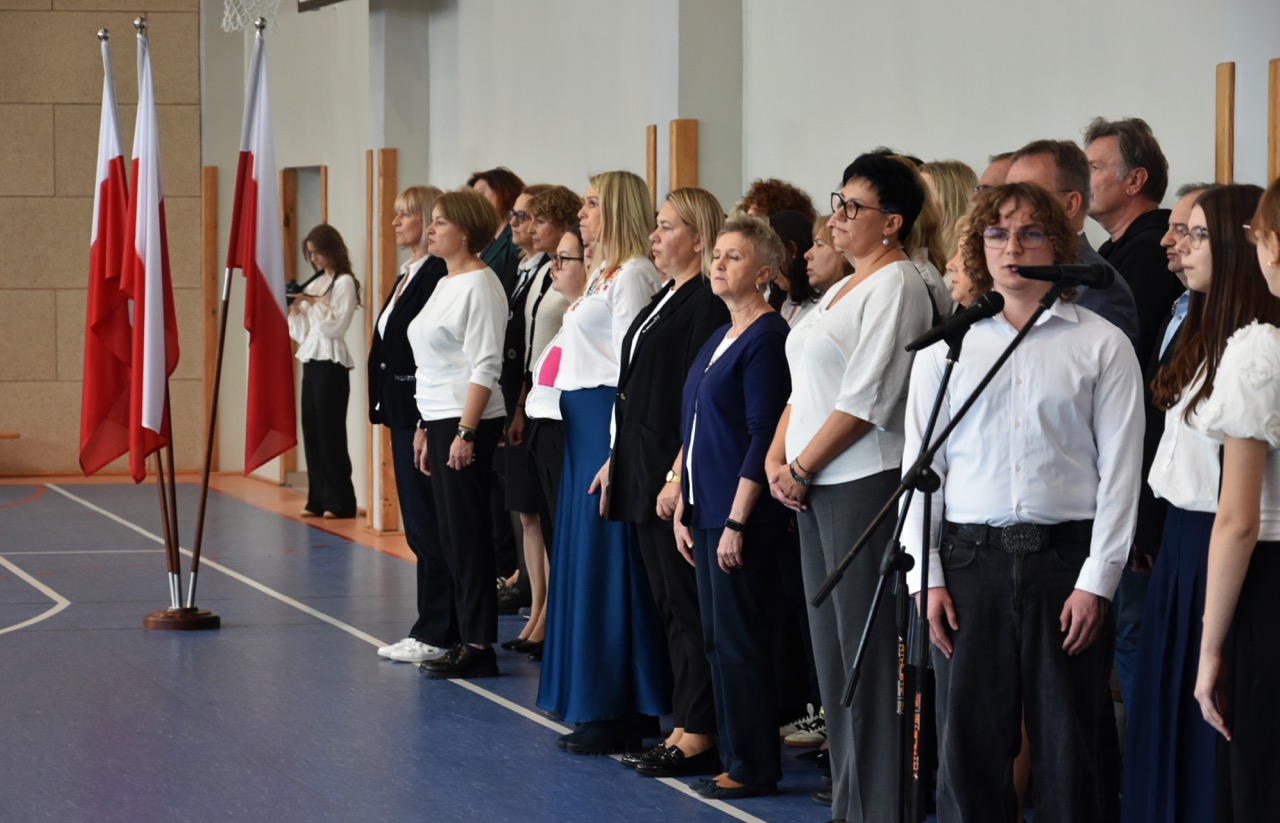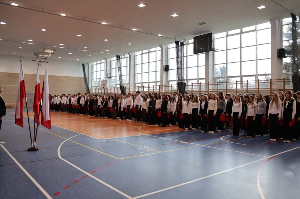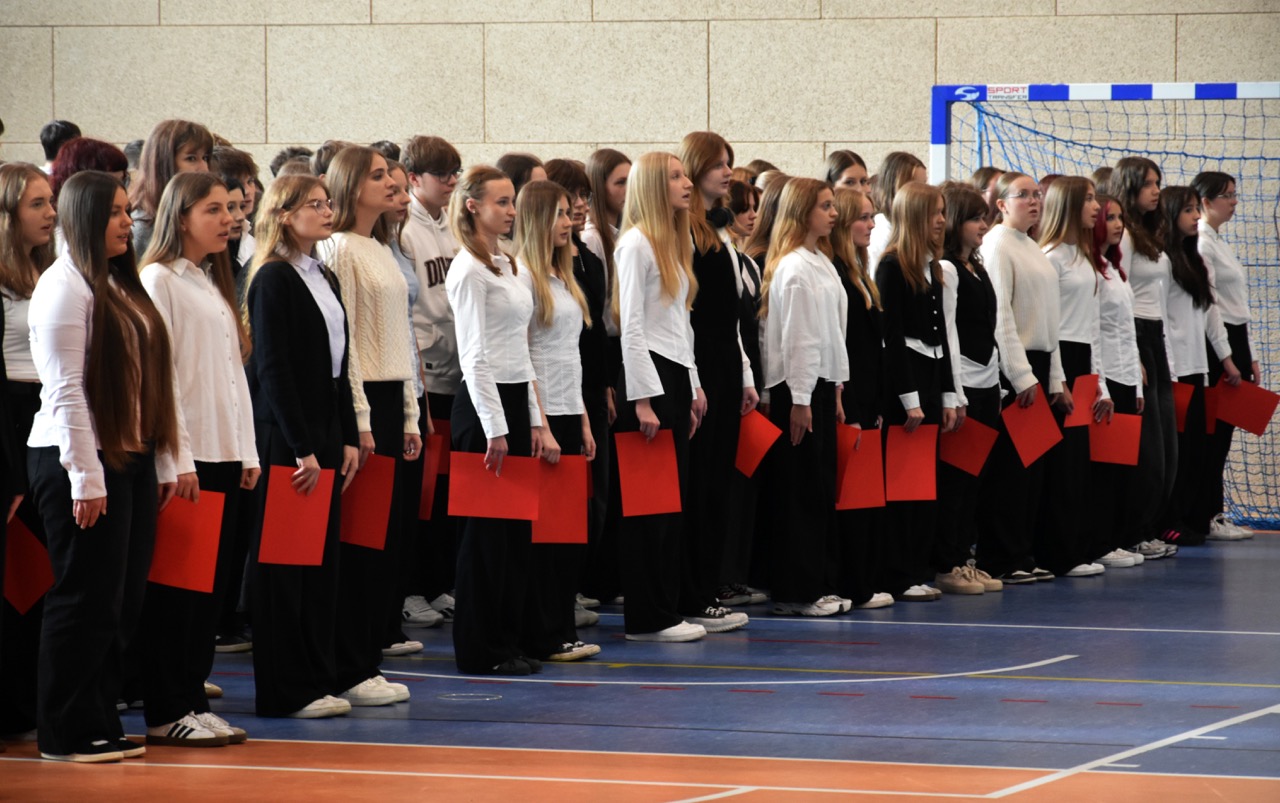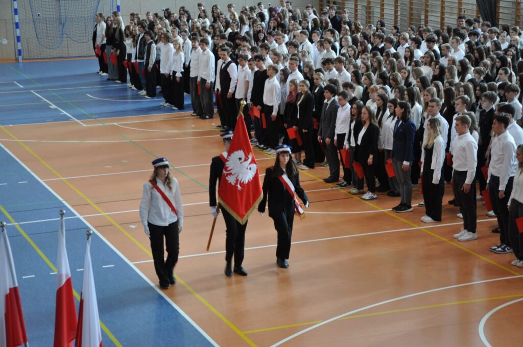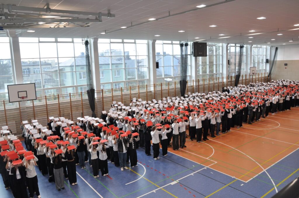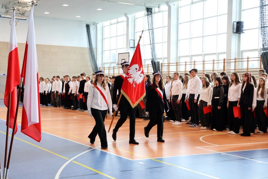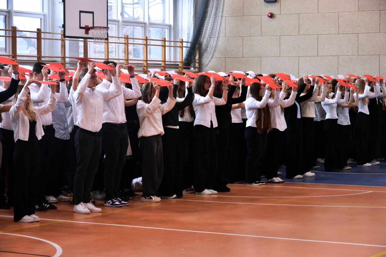 admin 5 miesięcy temu Organizacyjne , UroczystościDo tradycji naszej szkoły należy wspólne śpiewanie „Mazurka Dąbrowskiego”, będącego ważnym ogniwem projektu patriotycznego „Szkoła do hymnu” realizowanego z inicjatywy Ministerstwa Edukacji Narodowej. W tym roku hymn państwowy wybrzmiał po raz kolejny w sali gimnastycznej o godzinie 11:11, a do jego odśpiewania przystąpili wszyscy uczniowie i nauczyciele. Pięknym elementem wizualnym była flaga biało-czerwona utworzona przez wszystkich uczniów. Zainaugurowano w ten sposób obchody Narodowego Święta Niepodległości, a kolejnym wydarzeniem podkreślającym rangę uroczystości będzie akademia szkolna.