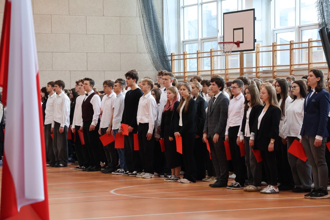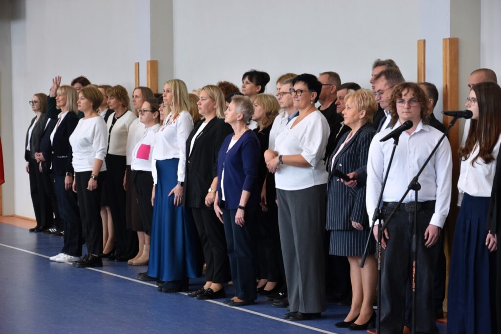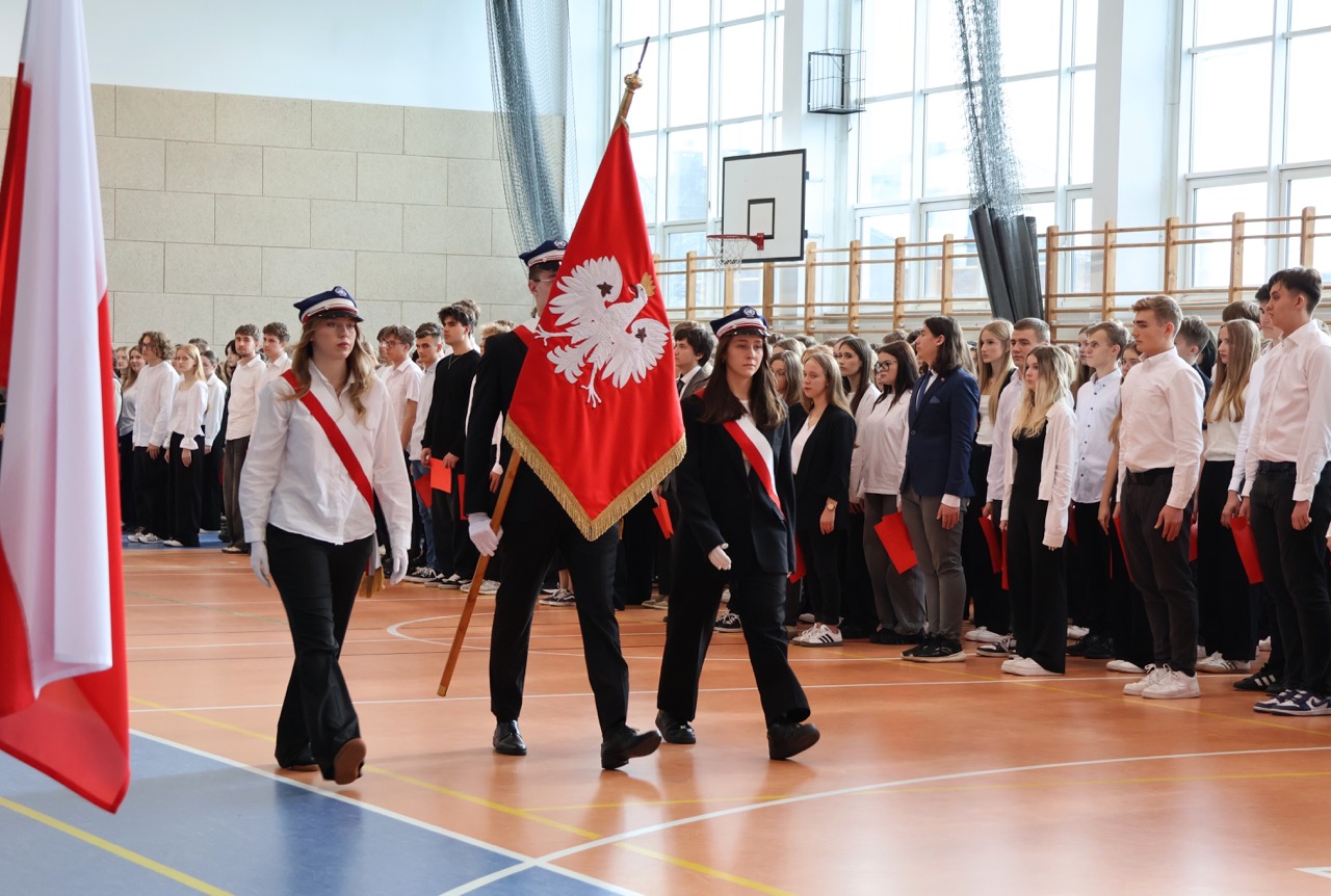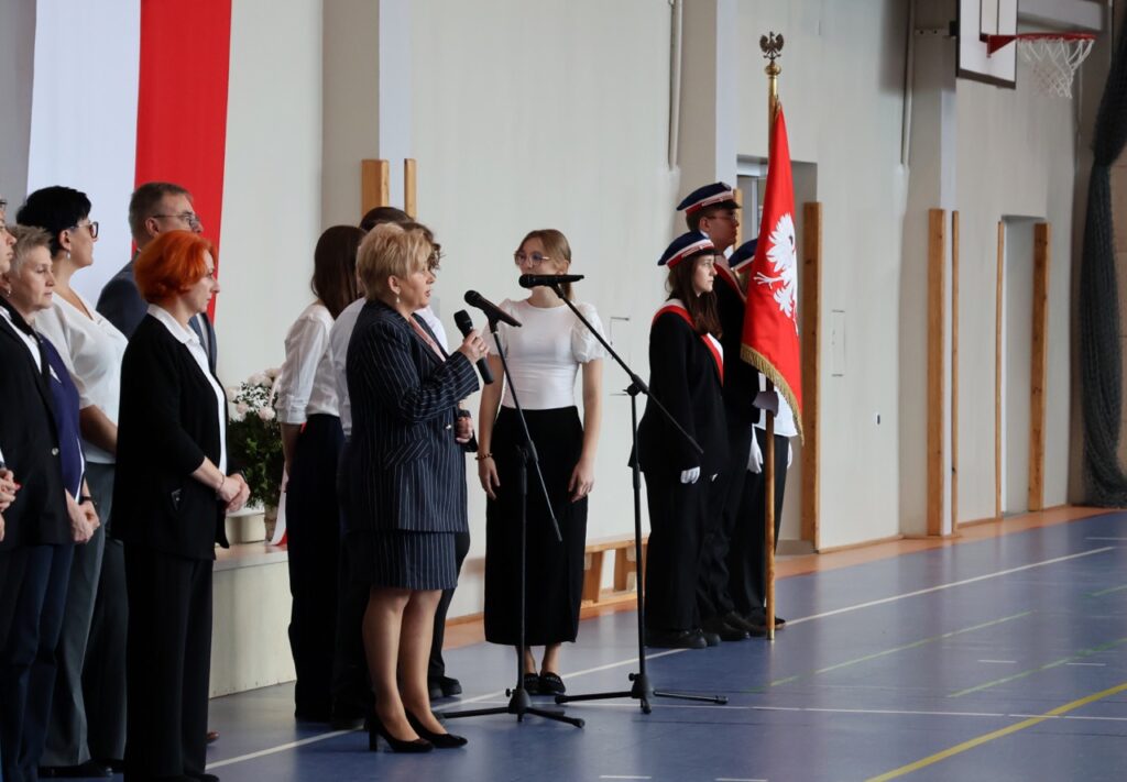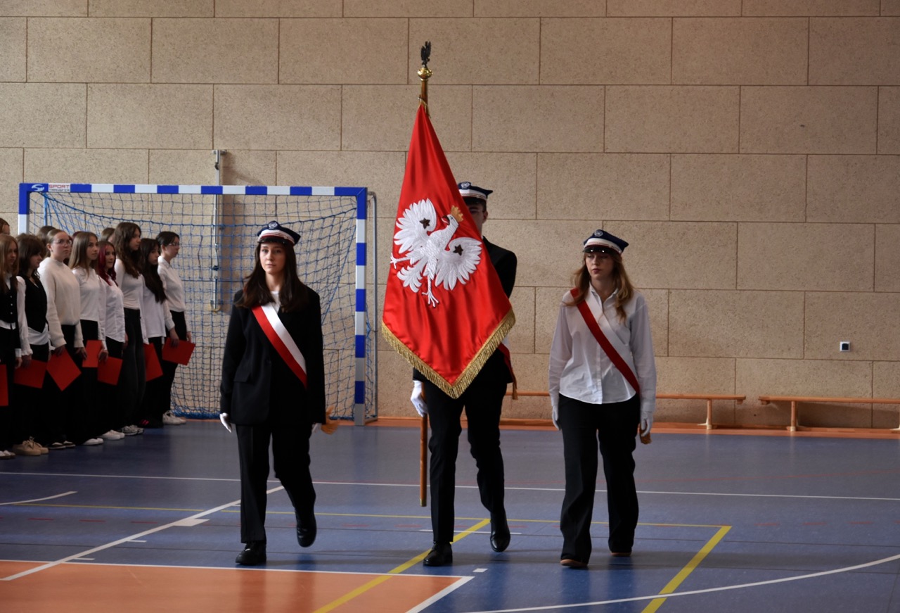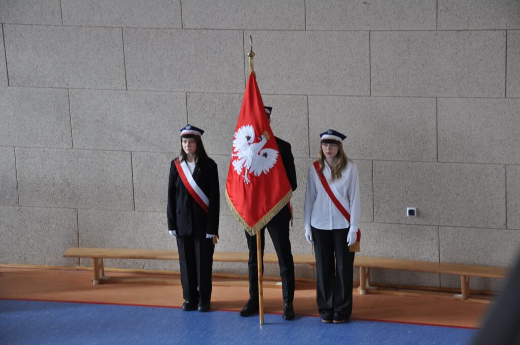 admin 5 miesięcy temu Organizacyjne , UroczystościDo tradycji naszej szkoły należy wspólne śpiewanie „Mazurka Dąbrowskiego”, będącego ważnym ogniwem projektu patriotycznego „Szkoła do hymnu” realizowanego z inicjatywy Ministerstwa Edukacji Narodowej. W tym roku hymn państwowy wybrzmiał po raz kolejny w sali gimnastycznej o godzinie 11:11, a do jego odśpiewania przystąpili wszyscy uczniowie i nauczyciele. Pięknym elementem wizualnym była flaga biało-czerwona utworzona przez wszystkich uczniów. Zainaugurowano w ten sposób obchody Narodowego Święta Niepodległości, a kolejnym wydarzeniem podkreślającym rangę uroczystości będzie akademia szkolna.