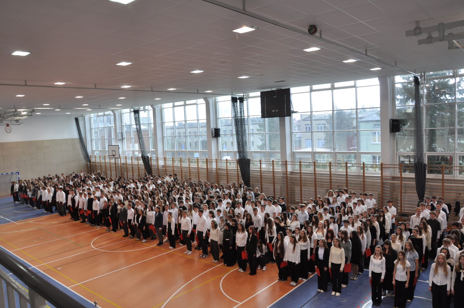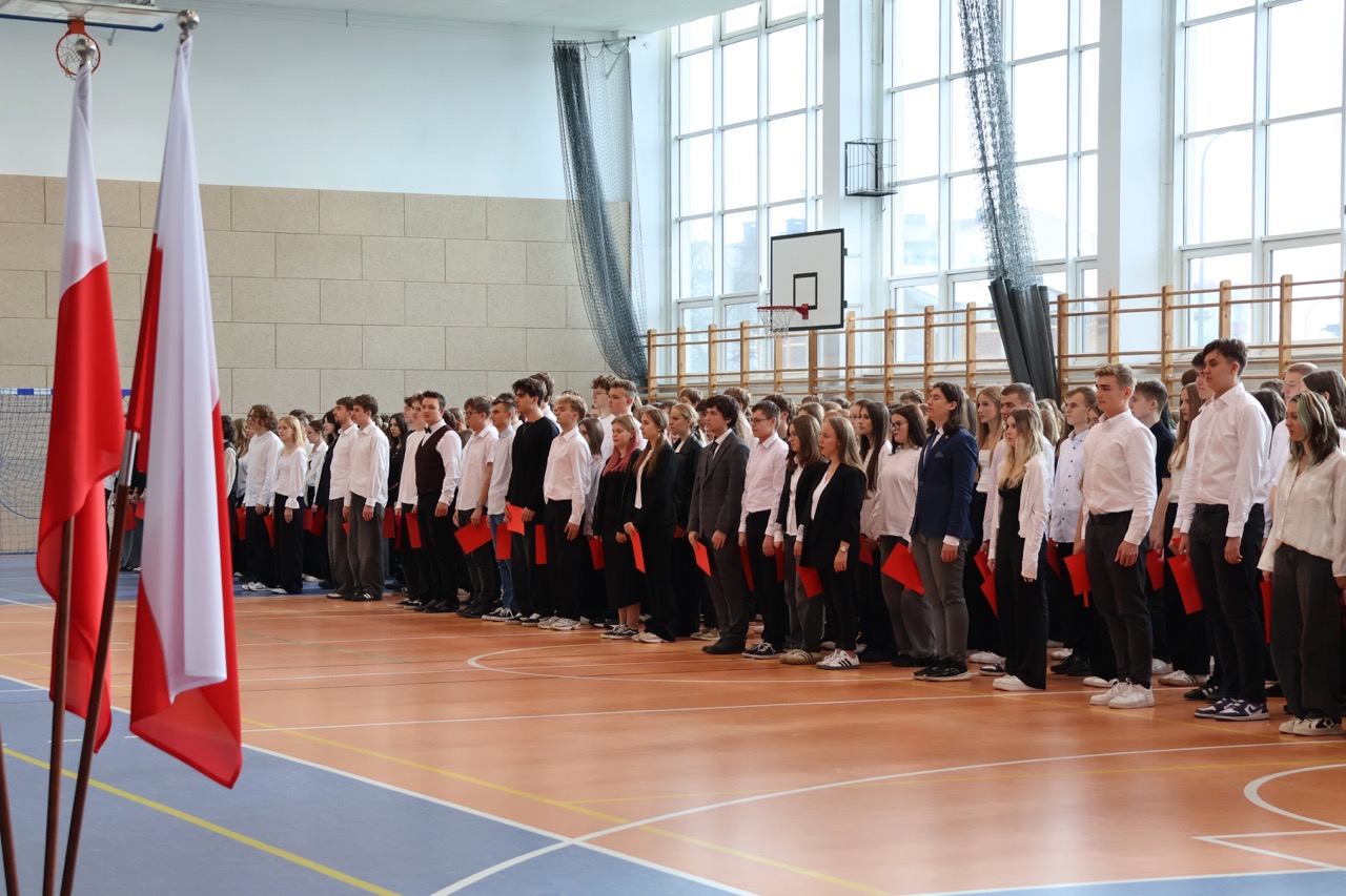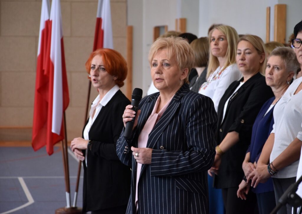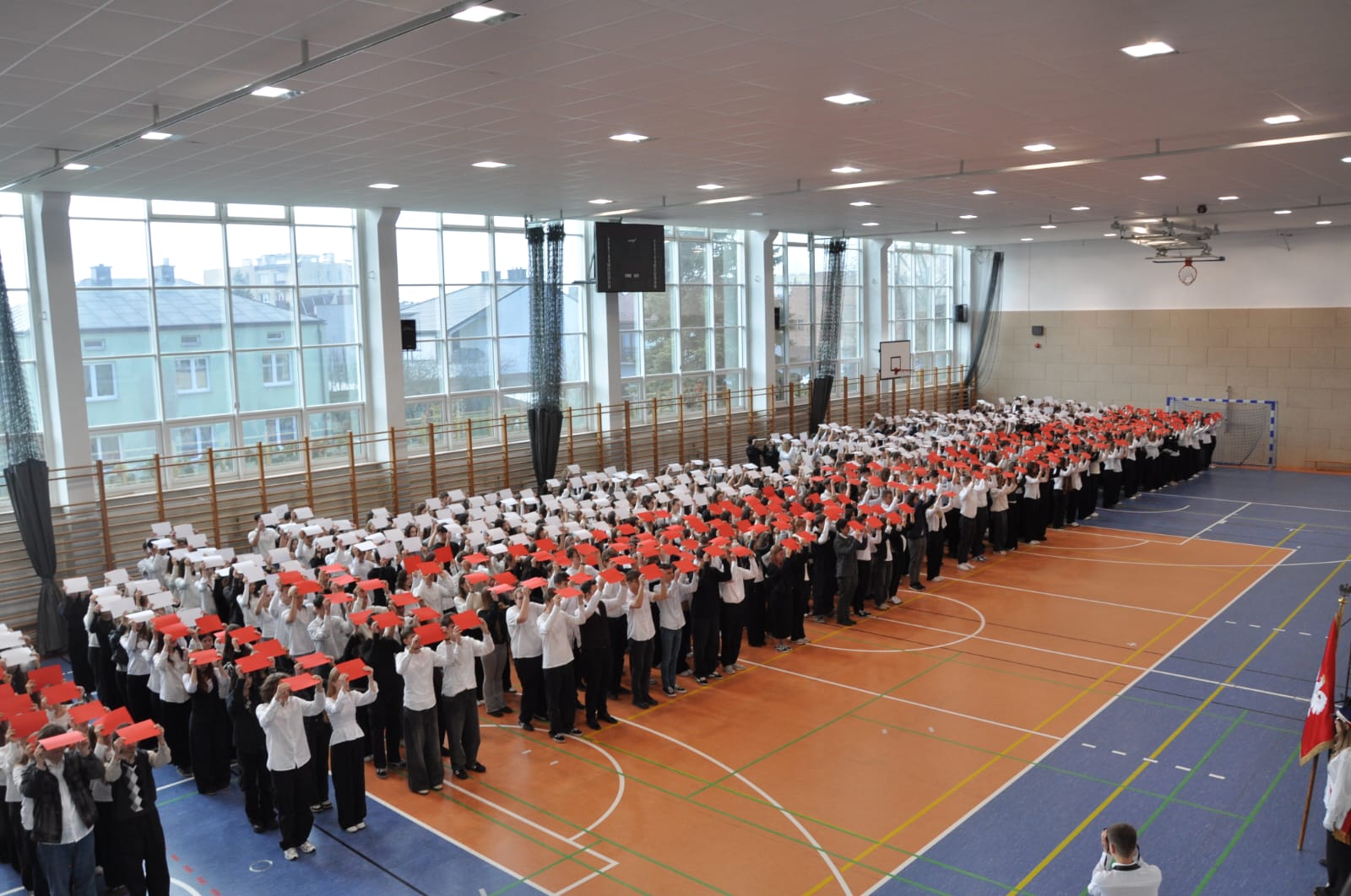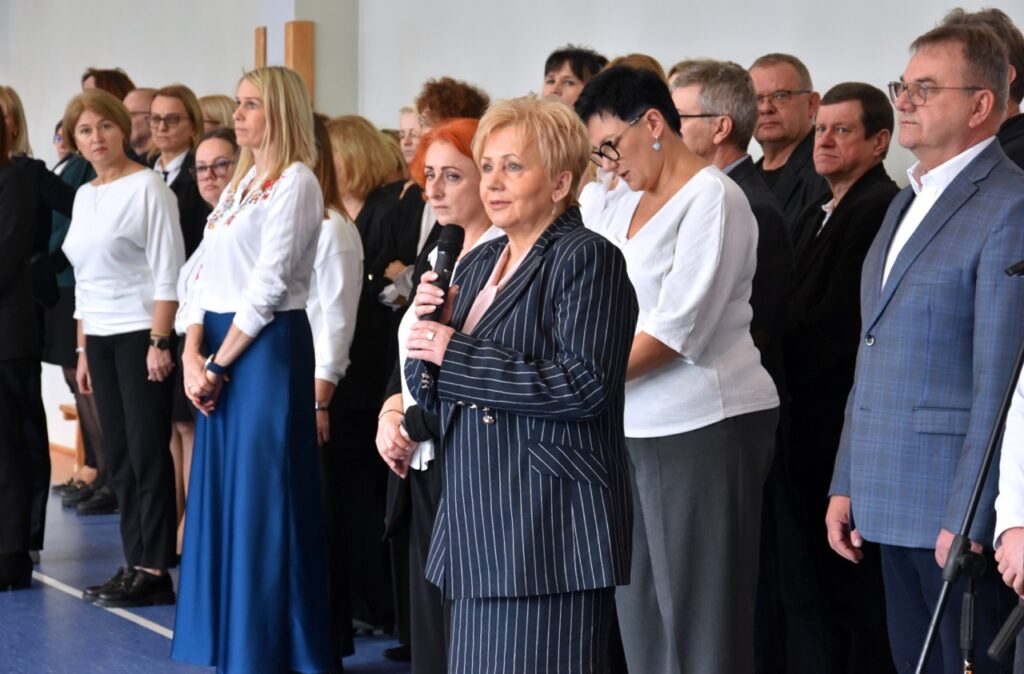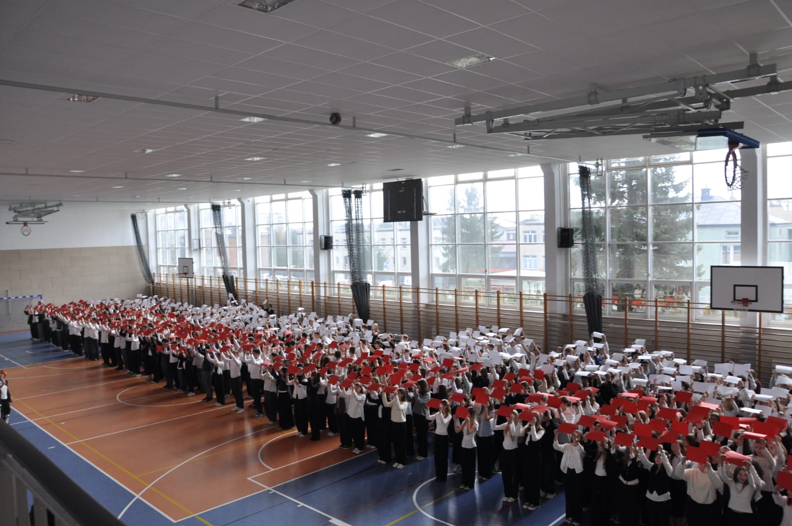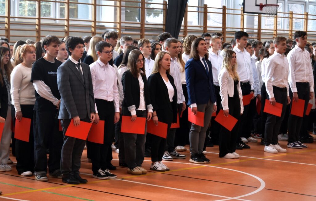 admin 5 miesięcy temu Organizacyjne , UroczystościDo tradycji naszej szkoły należy wspólne śpiewanie „Mazurka Dąbrowskiego”, będącego ważnym ogniwem projektu patriotycznego „Szkoła do hymnu” realizowanego z inicjatywy Ministerstwa Edukacji Narodowej. W tym roku hymn państwowy wybrzmiał po raz kolejny w sali gimnastycznej o godzinie 11:11, a do jego odśpiewania przystąpili wszyscy uczniowie i nauczyciele. Pięknym elementem wizualnym była flaga biało-czerwona utworzona przez wszystkich uczniów. Zainaugurowano w ten sposób obchody Narodowego Święta Niepodległości, a kolejnym wydarzeniem podkreślającym rangę uroczystości będzie akademia szkolna.