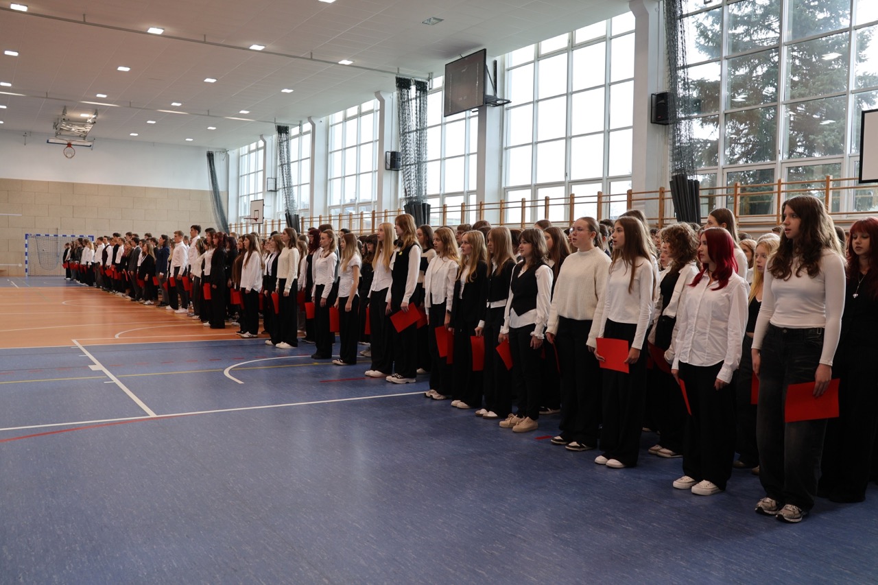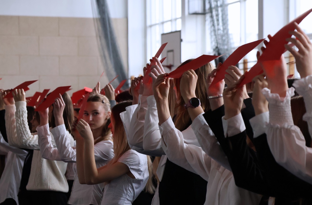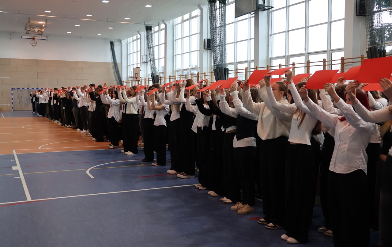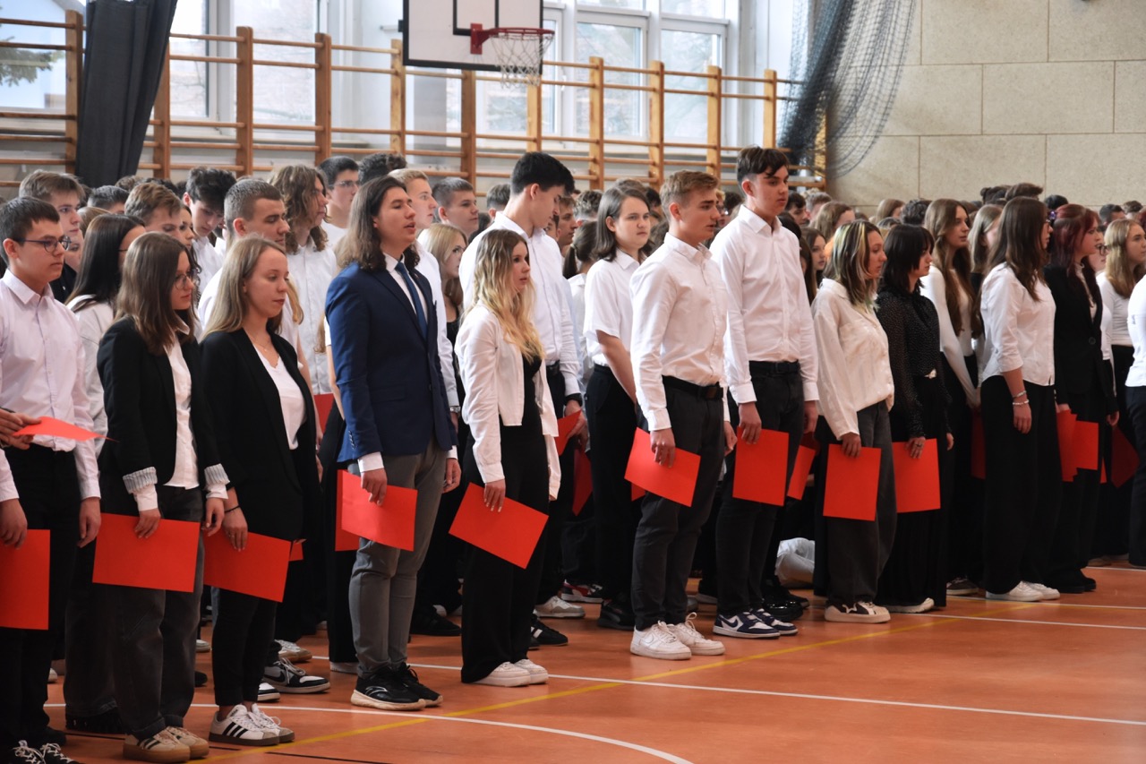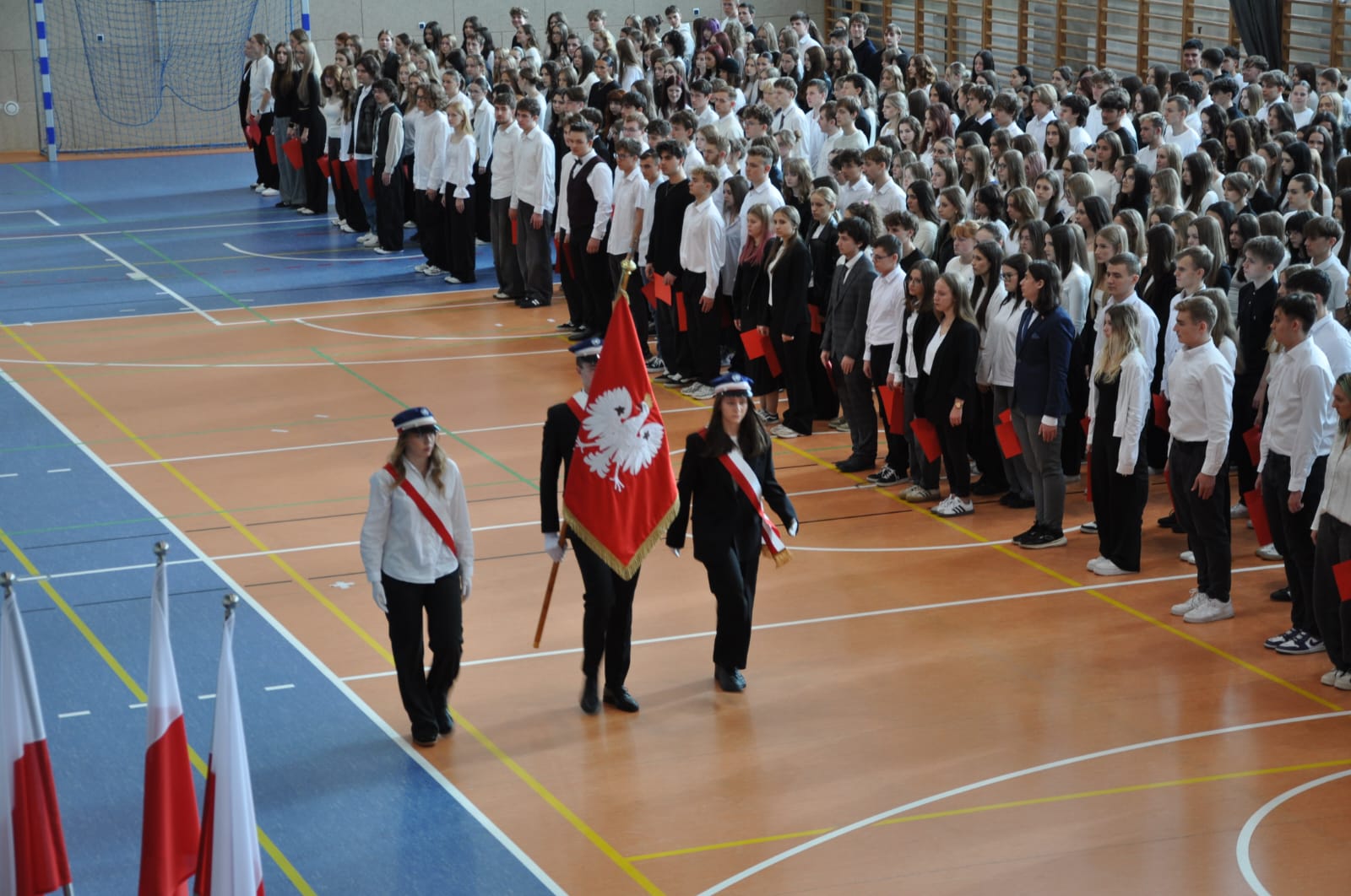 admin 5 miesięcy temu Organizacyjne , UroczystościDo tradycji naszej szkoły należy wspólne śpiewanie „Mazurka Dąbrowskiego”, będącego ważnym ogniwem projektu patriotycznego „Szkoła do hymnu” realizowanego z inicjatywy Ministerstwa Edukacji Narodowej. W tym roku hymn państwowy wybrzmiał po raz kolejny w sali gimnastycznej o godzinie 11:11, a do jego odśpiewania przystąpili wszyscy uczniowie i nauczyciele. Pięknym elementem wizualnym była flaga biało-czerwona utworzona przez wszystkich uczniów. Zainaugurowano w ten sposób obchody Narodowego Święta Niepodległości, a kolejnym wydarzeniem podkreślającym rangę uroczystości będzie akademia szkolna.