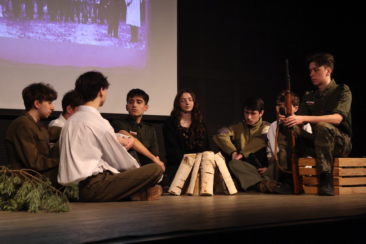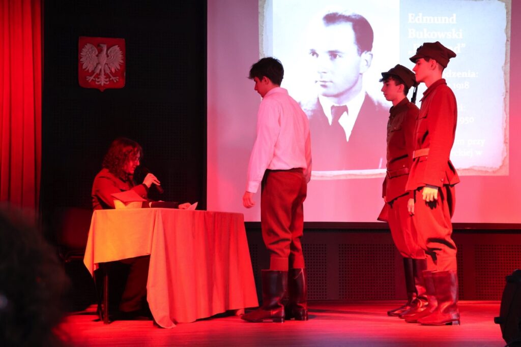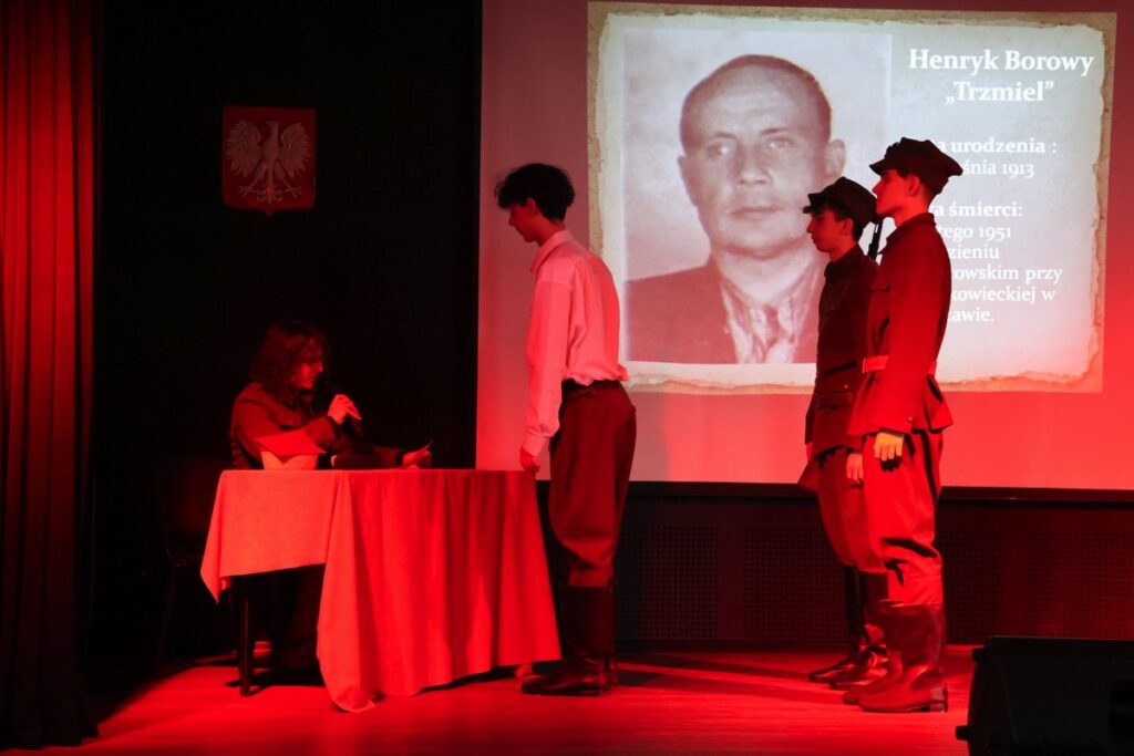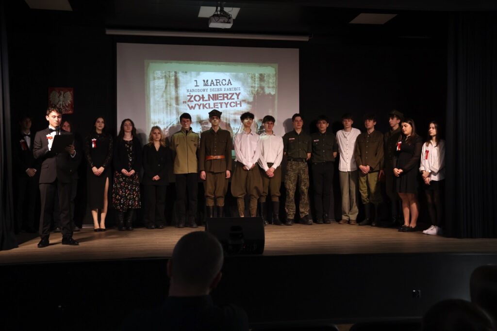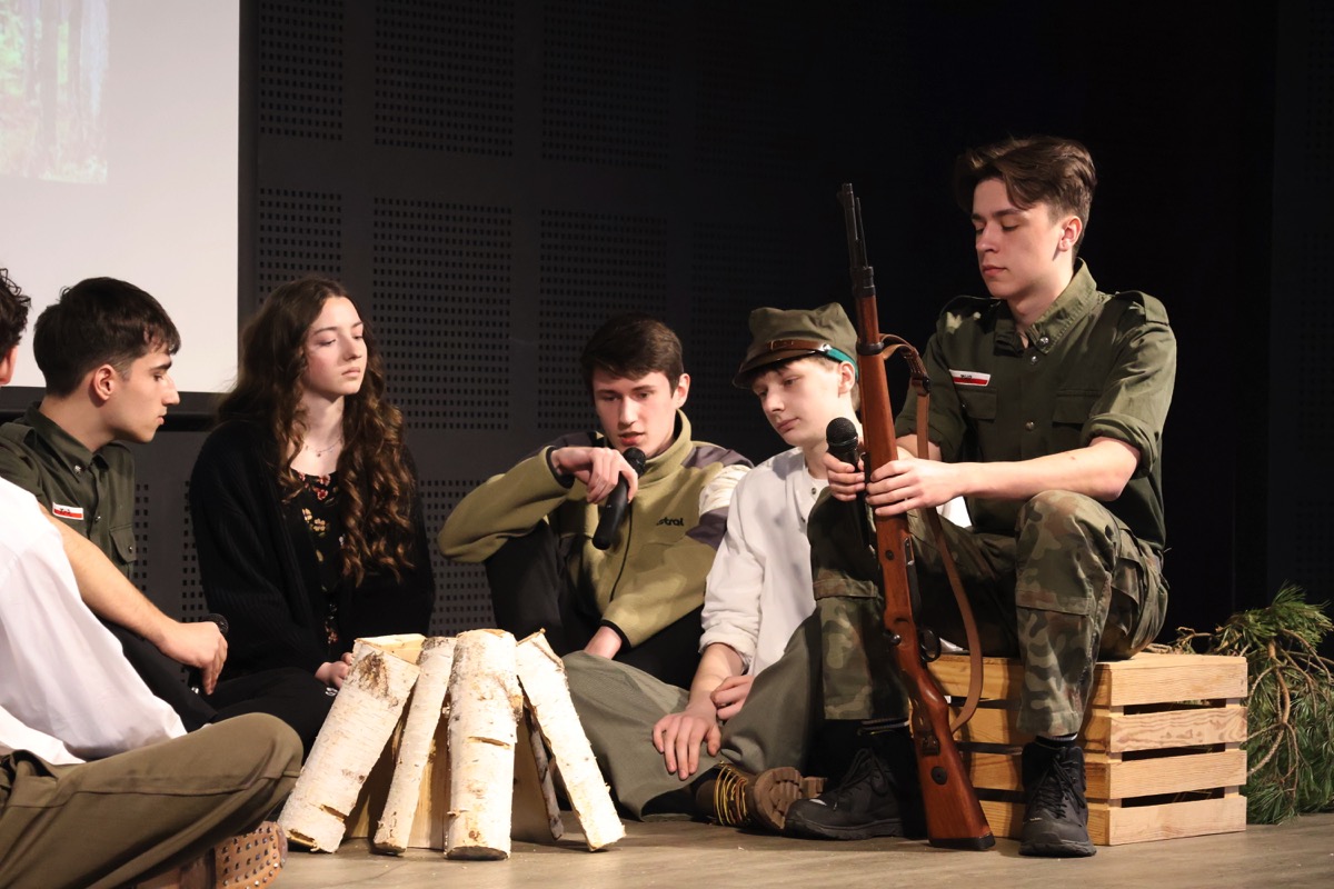 Urodzeni w wolnej Polsce Żołnierze Niezłomni nie tylko marzyli o niepodległej Ojczyźnie, ale mieli także odwagę walczyć z bronią w ręku o jej wolność i niezawisłość. Za swoje męstwo zapłacili najwyższą cenę. Oddając hołd poległym i pomordowanym uczestnikom podziemia antykomunistycznego i niepodległościowego, uczniowie klasy III C, III E i III F przygotowali pod kierunkiem pani Renaty Krzesińskiej i pani Katarzyny Weneckiej okolicznościowe przedstawienie, które zaprezentowali 4 marca 2025 roku całej społeczności szkolnej. Na holu pierwszego piętra uczniowie klasy II D przygotowali także gazetkę upamiętniającą Żołnierzy Niezłomnych.