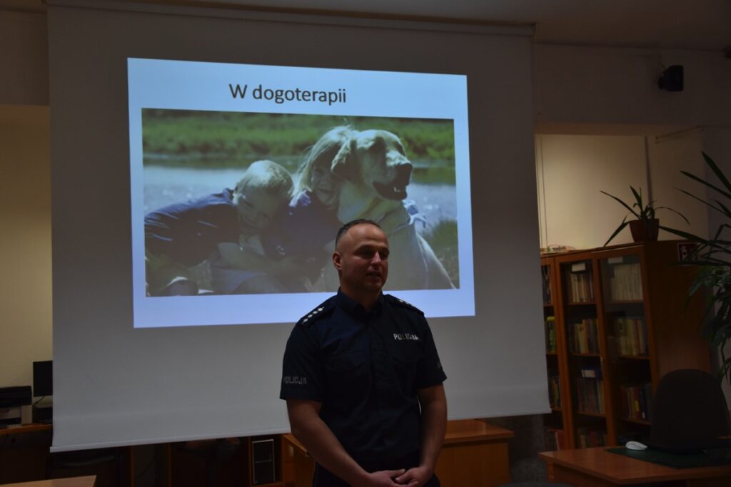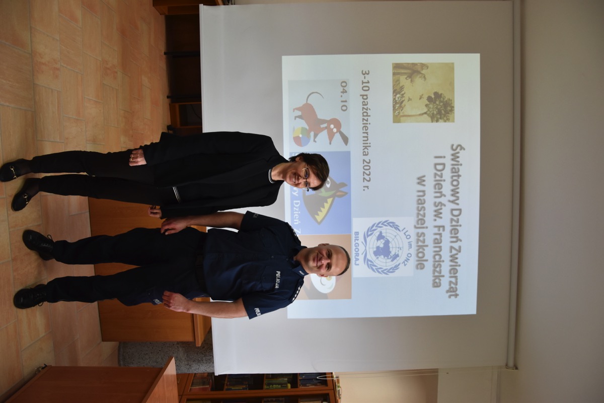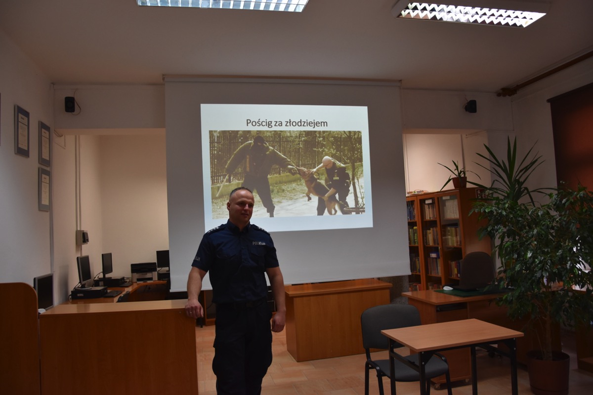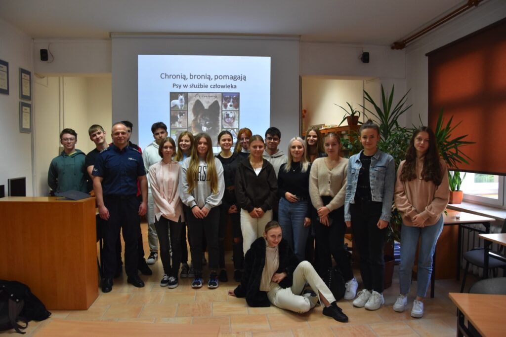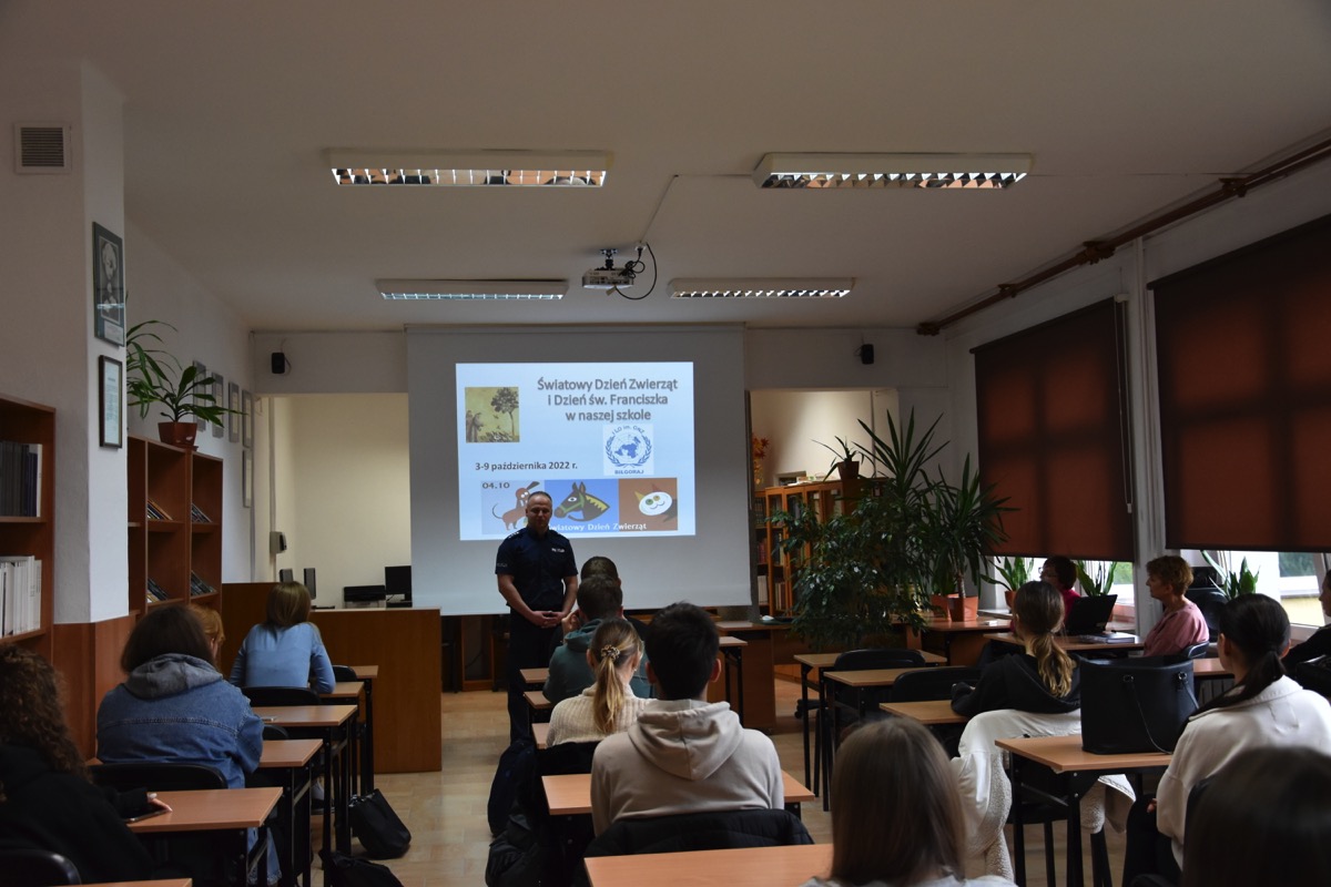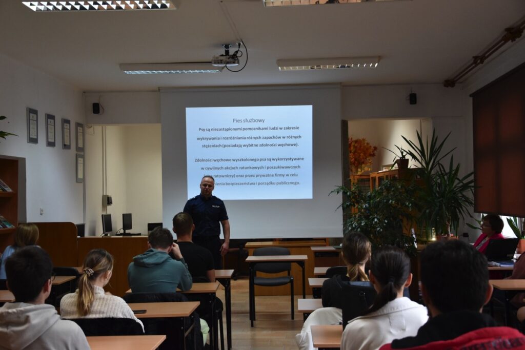 Pod takim hasłem 4 września 2022 roku z okazji Światowego Dnia Zwierząt i Dnia św. Franciszka w czytelni biblioteki szkolnej odbyło się spotkanie z policjantem – opiekunem psów policyjnych.  Zaproszony gość przybliżył młodzieży licealnej zagadnienia związane z wykorzystaniem psów do poszukiwania zaginionych osób i wykrywania przestępstw. Policjant poinformował jak wygląda szkolenie zwierząt, opieka weterynaryjna, a także opowiedział o udziale swoich podopiecznych w ostatnich akcjach poszukiwawczych. Chętnie odpowiadał na pytania zadawane przez młodzież.