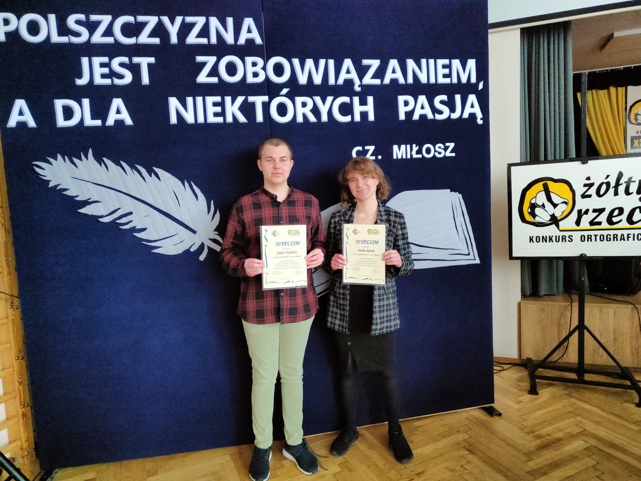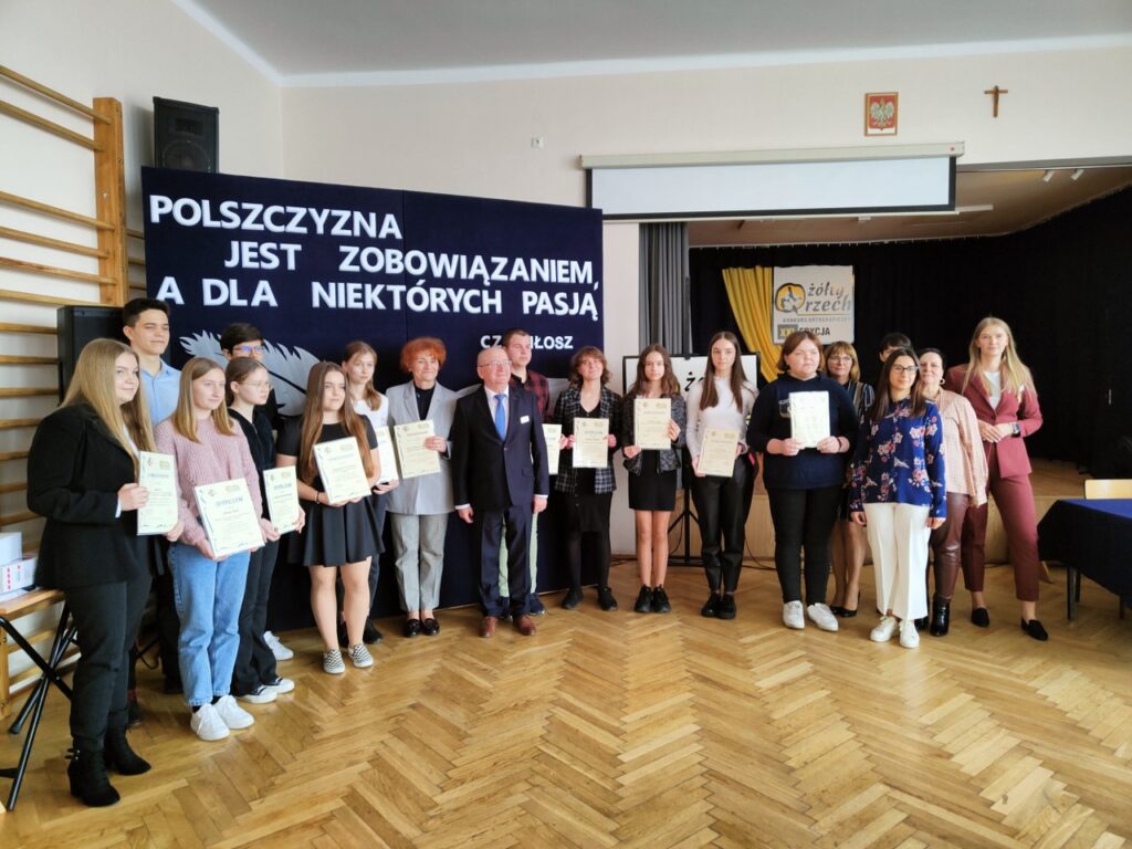 admin 4 lata temu Bez kategorii , Konkursy , Organizacyjne , OsiągnięciaW XXI edycji Powiatowego Konkursu Ortograficznego „Żółty Orzech” duże sukcesy odnieśli nasi licealiści. Wśród uczniów szkół ponadpodstawowych najlepiej dyktando napisał Jakub Trybalski z kl. I F, zajmując I miejsce, natomiast II miejsce zdobyła Amelia Rybak z kl. III Bp. Mistrzowie ortografii z naszego powiatu rywalizowali ze sobą 8 kwietnia 2022 roku w Regionalnym Centrum Edukacji Zawodowej w Biłgoraju.