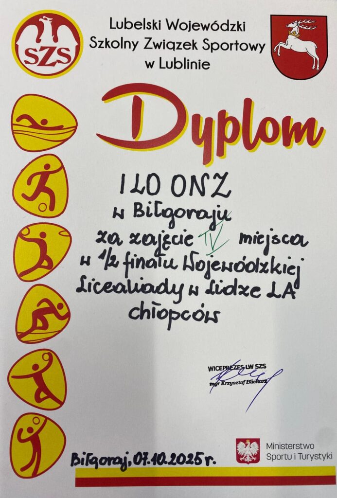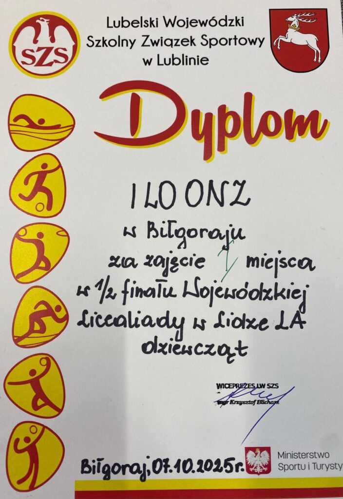Nasze dziewczęta i chłopcy znakomicie zaprezentowali się podczas Powiatowej i Rejonowej Licealiady w Szkolnej Lidze Lekkoatletycznej, która odbyła się 7 października 2025 r. na stadionie OSiR w Biłgoraju. Dziewczęta zajęły pierwsze miejsce i wywalczyły awans do kolejnego etapu zawodów. Pokazały klasę, siłę i determinację. Chłopcy z kolei uplasowali się na trzecim miejscu w rywalizacji szkół powiatu biłgorajskiego i również dumnie reprezentowali naszą szkołę.Skład drużyny dziewcząt: Łukasik Diana I A, Eliza Bielak I C, Paulina Abram IV A, Natalia Budzyńska III E, Martyna Cich II E, Anna Kusz III C, Oliwia Rożek IV H, Milena Dmitroca II B, Wiktoria Głaz I D, Katarzyna Kazimierowicz I B, Michalina Kobel I C, Emilia Kulińska I B, Julia Pawelec III G, Magdalena Startek II D i Zuzanna Wołoszyn III G.Skład drużyny chłopców: Paweł Solak II B, Ignacy Bartoszek IV C, Wojciech Dec II B, Mateusz Gmyz I A, Bartłomiej Kordas IV C, Krystian Piętak IV A, Filip Antosz I A, Wojciech Bukarewicz I A, Kamil Kręt IV C, Bruno Goch IV i, Michał Gozdecki III C, Kasjan Kanty II E, Adam Łata II A, Mateusz Mich II D, Maciej Muda II B, Bernard Olech IV A, Dominik Rój IV B, Karol Tchórzewski II D, Adam Michalik IV C i Piotr Góra I B.