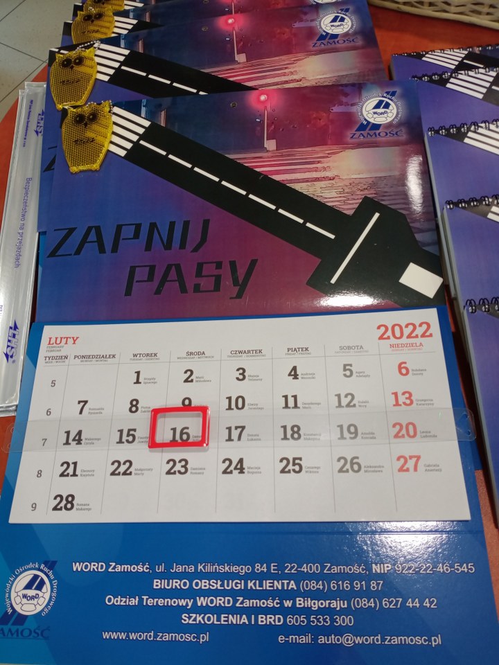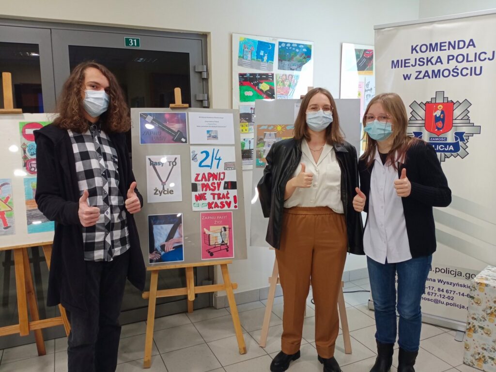 admin 4 lata temu Bez kategorii , Konkursy , Organizacyjne , OsiągnięciaKinga Jaskowska z kl. II A zajęła I miejsce, natomiast Magdalena Szyszka z kl. III Ap i Robert Borowy z kl. I A uzyskali wyróżnienia w konkursie plastycznym „Zaprojektuj plakat – ZAPNIJ PASY – który przemówi do młodych kierowców” zorganizowanym przez Wojewódzki Ośrodek Ruchu Drogowego w Zamościu. Pracę Kingi uznano za najlepszą oraz najciekawszą i umieszczono ją w kalendarzu na rok 2022. Wszyscy uczniowie otrzymali dyplomy oraz cenne nagrody, szkoła natomiast magnetyczne przyrządy tablicowe.