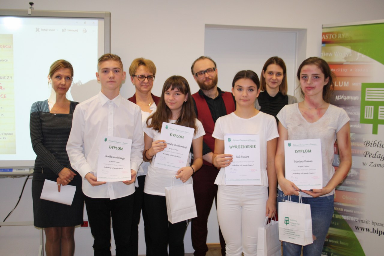 7 listopada 2018 r. w Bibliotece Pedagogicznej w Zamościu odbył się finał regionalnego konkursu czytelniczego „Booktalking, czyli gawęda o książce…”. Wzięli w nim udział najlepsi uczniowie z powiatu zamojskiego, biłgorajskiego, hrubieszowskiego i tomaszowskiego, którzy zwyciężyli w eliminacjach powiatowych. W kategorii szkół ponadgimnazjalnych komisja konkursowa nagrodziła aż trzy uczennice naszej szkoły. I miejsce zajęła Aleksandra Chutkowska (kl. III gB), na II miejscu uplasowała się Martyna Koman (kl. I D), a wyróżnienie otrzymała Nela Fusiarz (kl. I D). Zadaniem uczestników konkursu było zareklamowanie ulubionej książki metodą booktalkingu, czyli przedstawienie bohaterów, fabuły lub kilku scen z książki w taki sposób, aby słuchacze chcieli ją przeczytać. Główną zasadą booktalkingu jest nieujawnianie wszystkich informacji o książce, ale uwzględnienie tylko jej „kuszących” fragmentów.