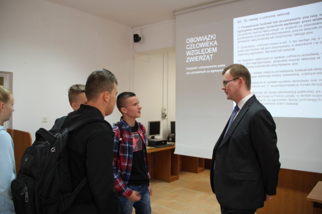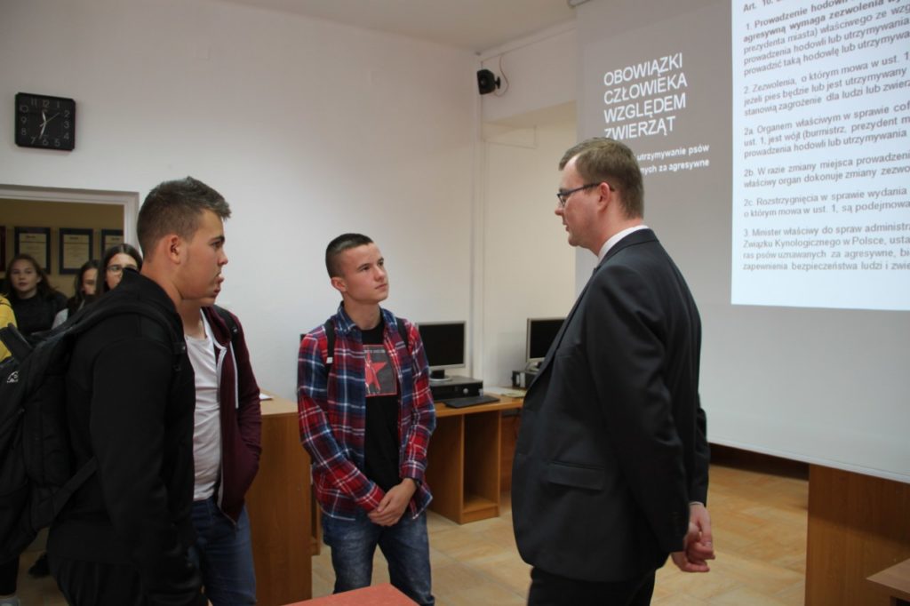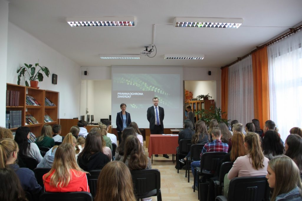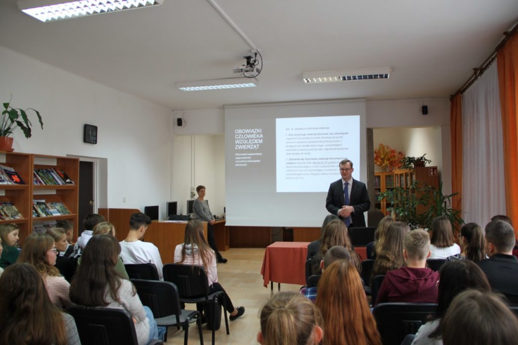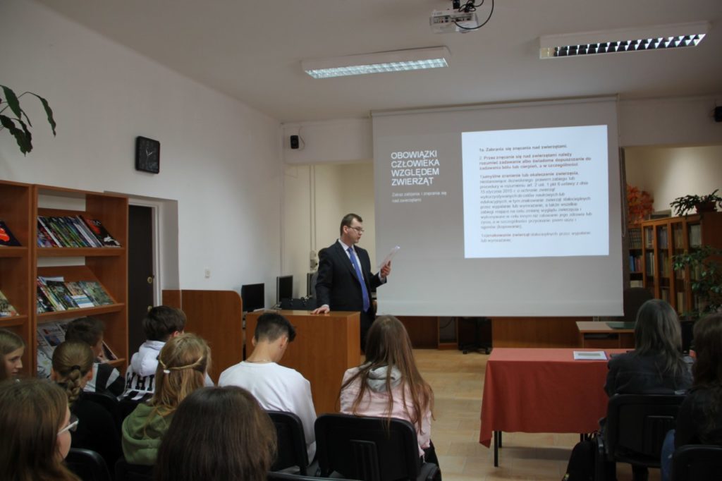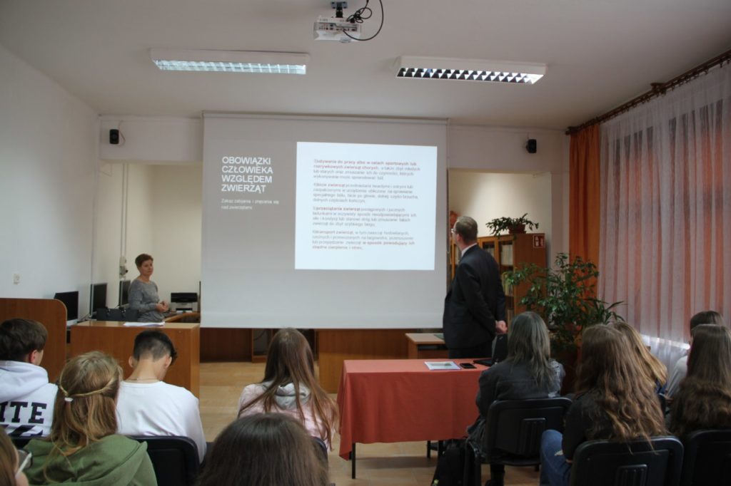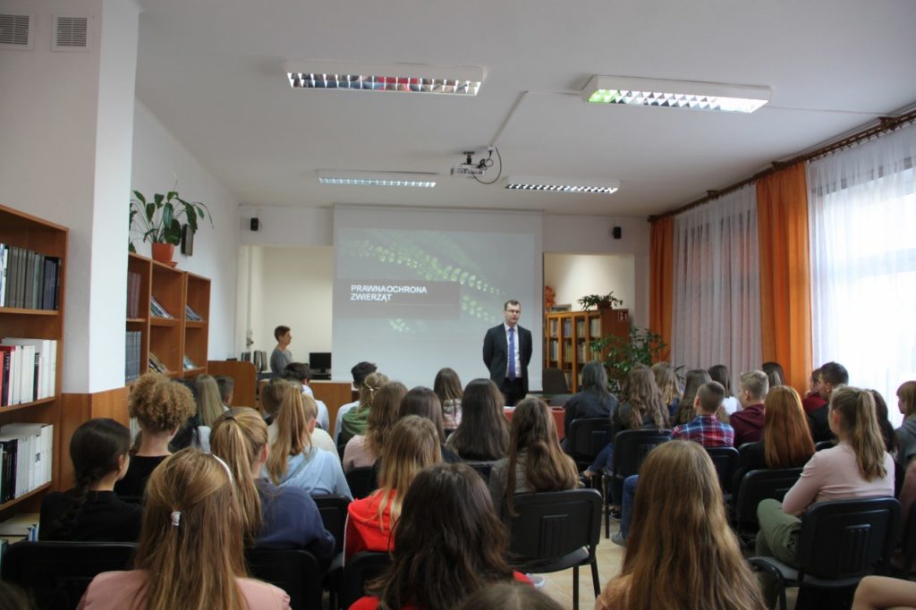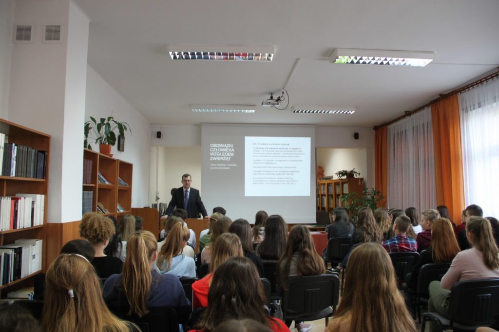 Uczniowie z klas prawniczych wzięli udział w wykładzie mecenasa Jacka Kraczka, który przedstawił licealistom aktualny stan prawny w zakresie ochrony zwierząt. Pan Kraczek informował o skutkach znęcania się nad czworonogami i uwrażliwiał młodzież na krzywdę zwierząt.