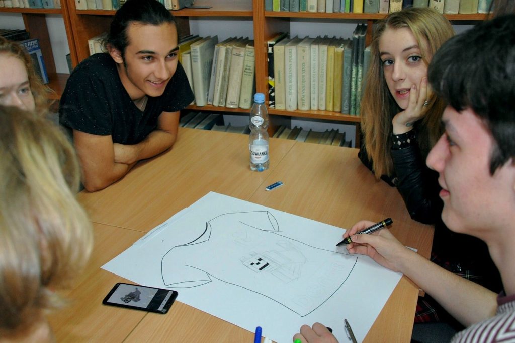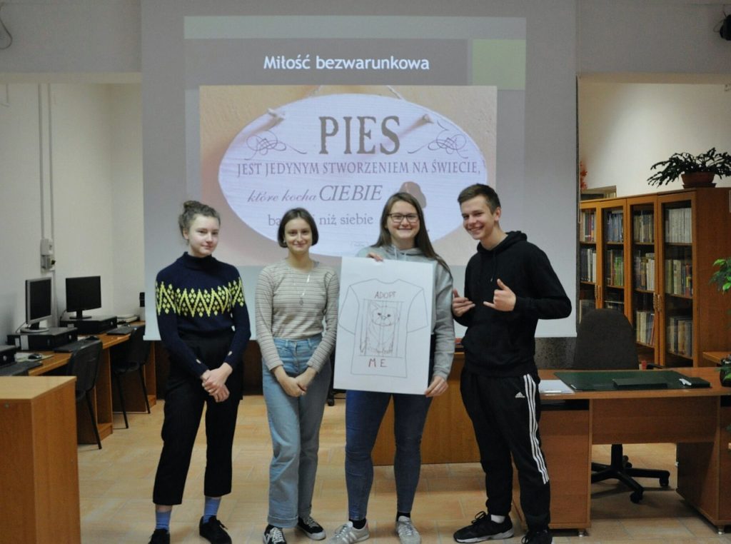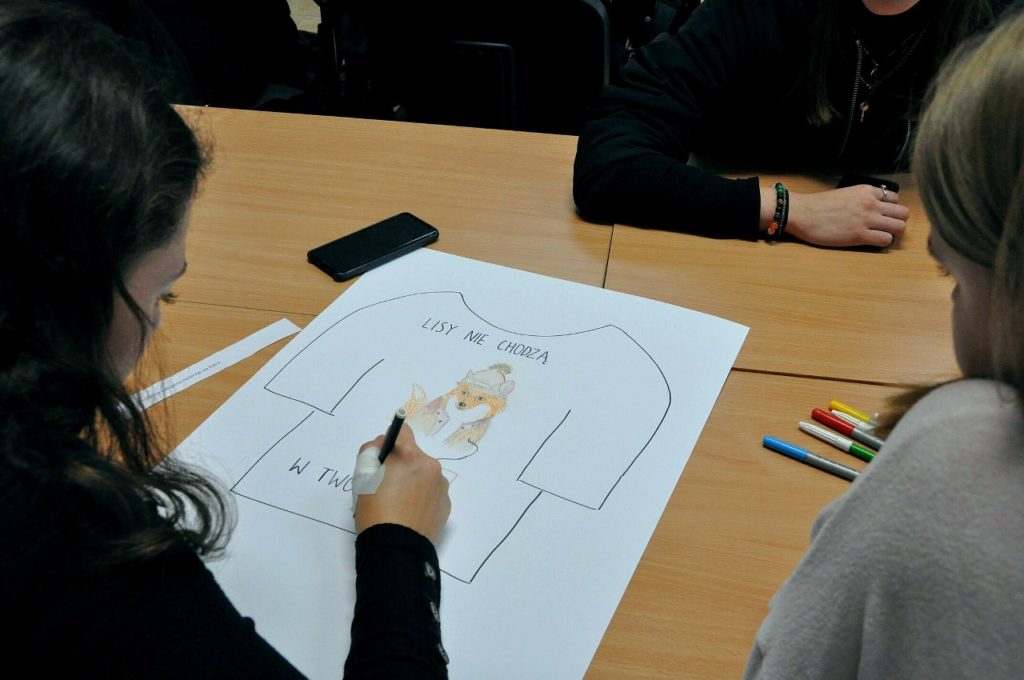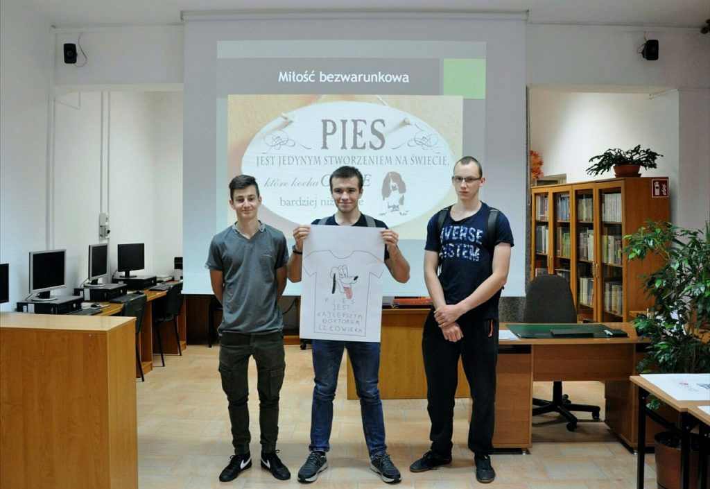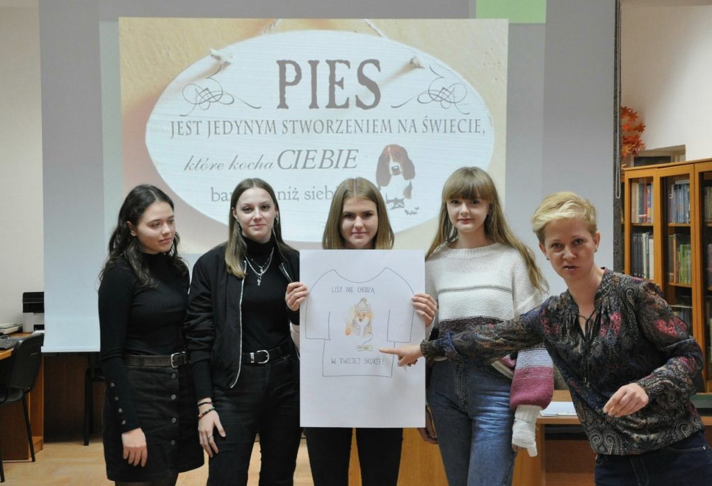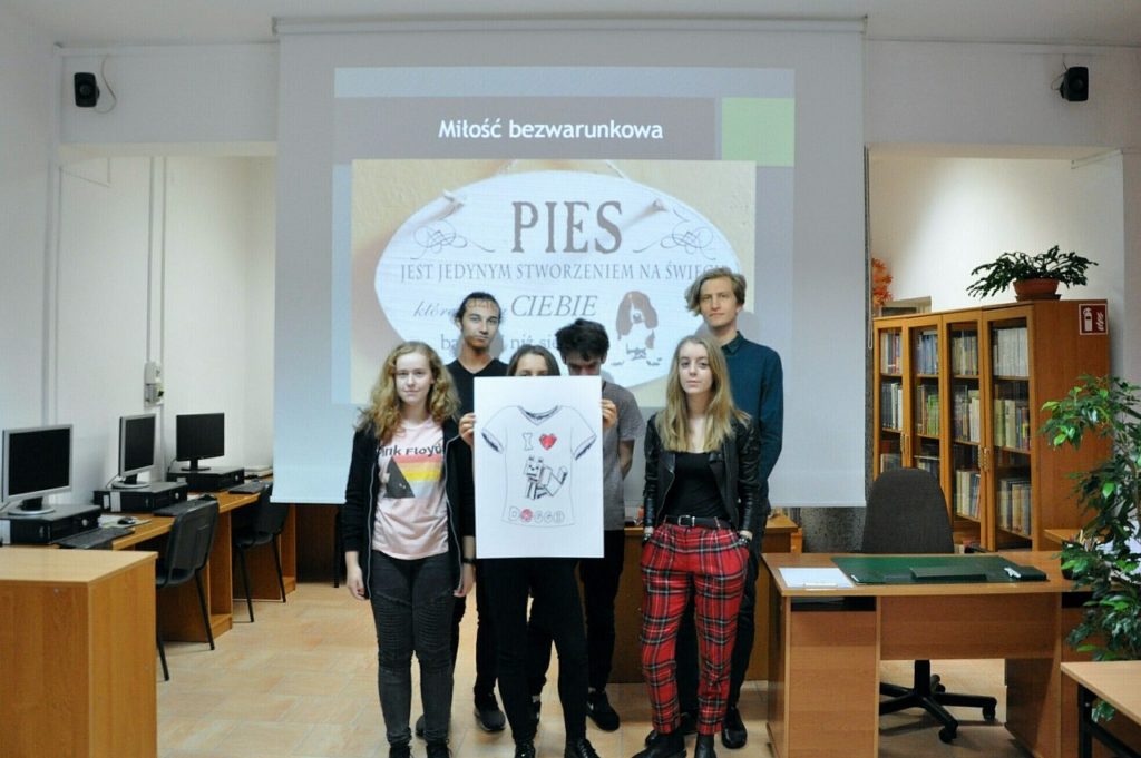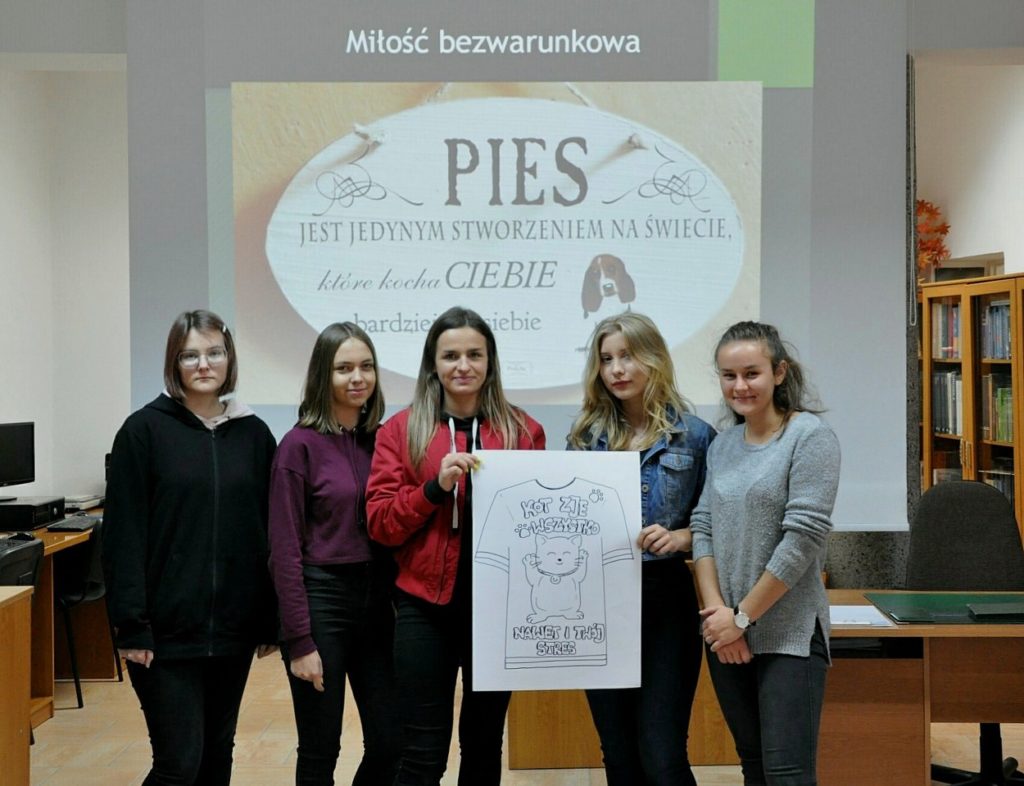Dla uczniów z klas graficznych ciekawe warsztaty prowadziła pani psycholog Monika Szczerba. Podczas zajęć licealiści rozmawiali o wpływie zwierząt na psychikę człowieka oraz projektowali koszulki promujące opiekę nad zwierzętami.