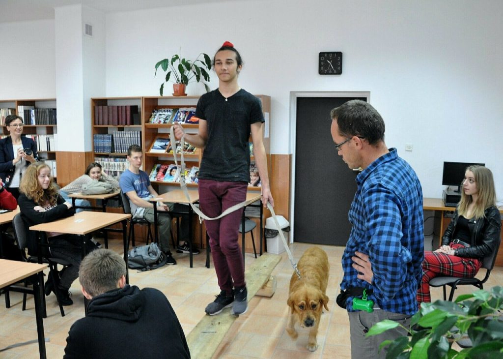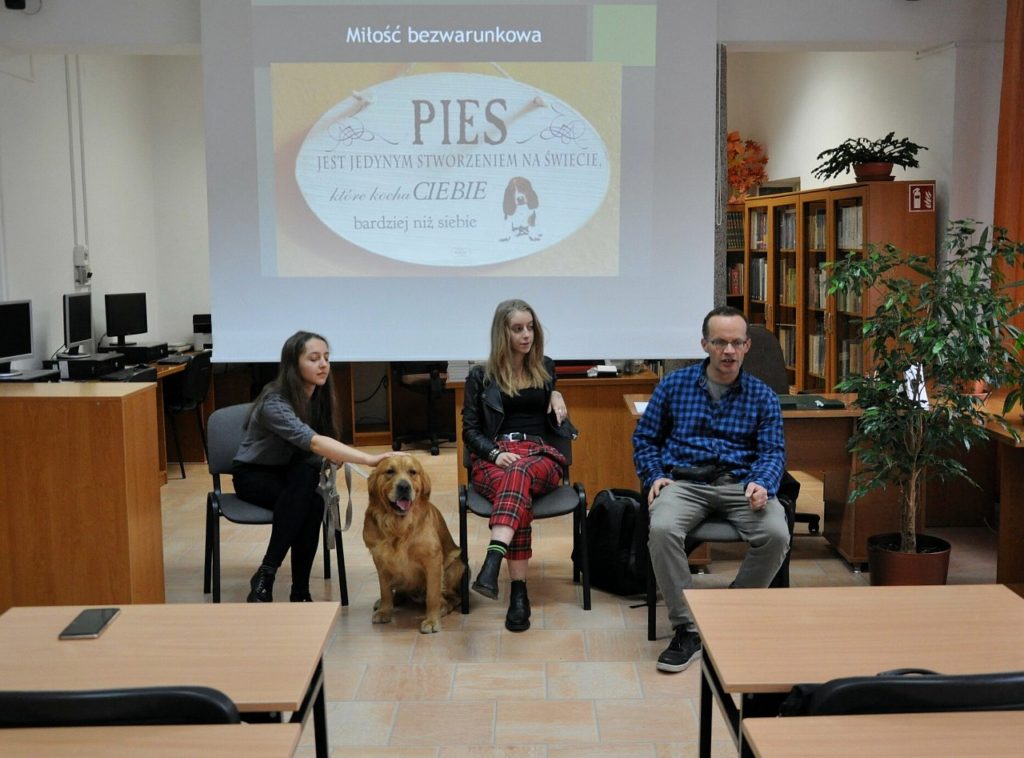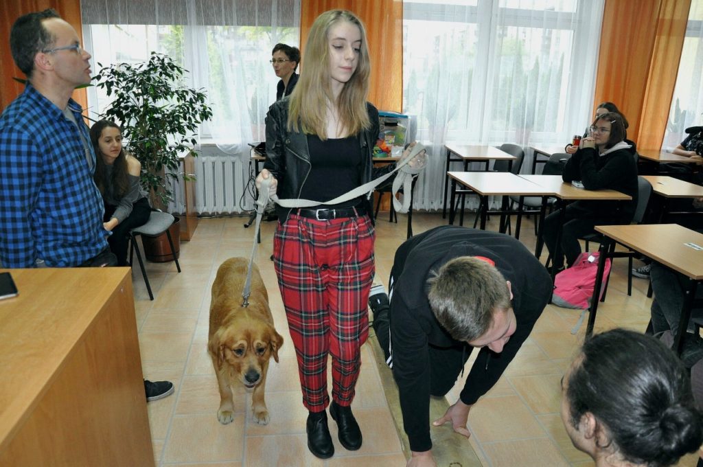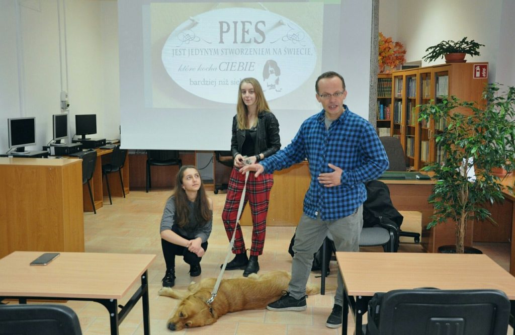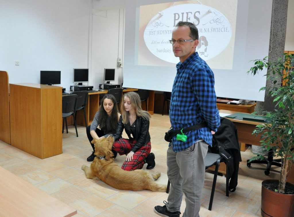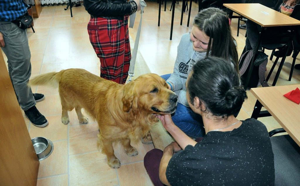 Dużo radości sprawiło młodzieży spotkanie z dogoterapeutą – panem Grzegorzem Kubikiem, który przybył do szkoły razem z Talikiem, psem terapeutycznym. Pan Kubik opowiadał o zawodzie dogoterapeuty oraz efektach terapii z dziećmi i dorosłymi. Prezentował ćwiczenia wpływające na koncentrację uwagi i rozwój funkcji poznawczych.