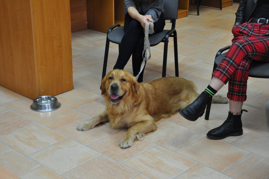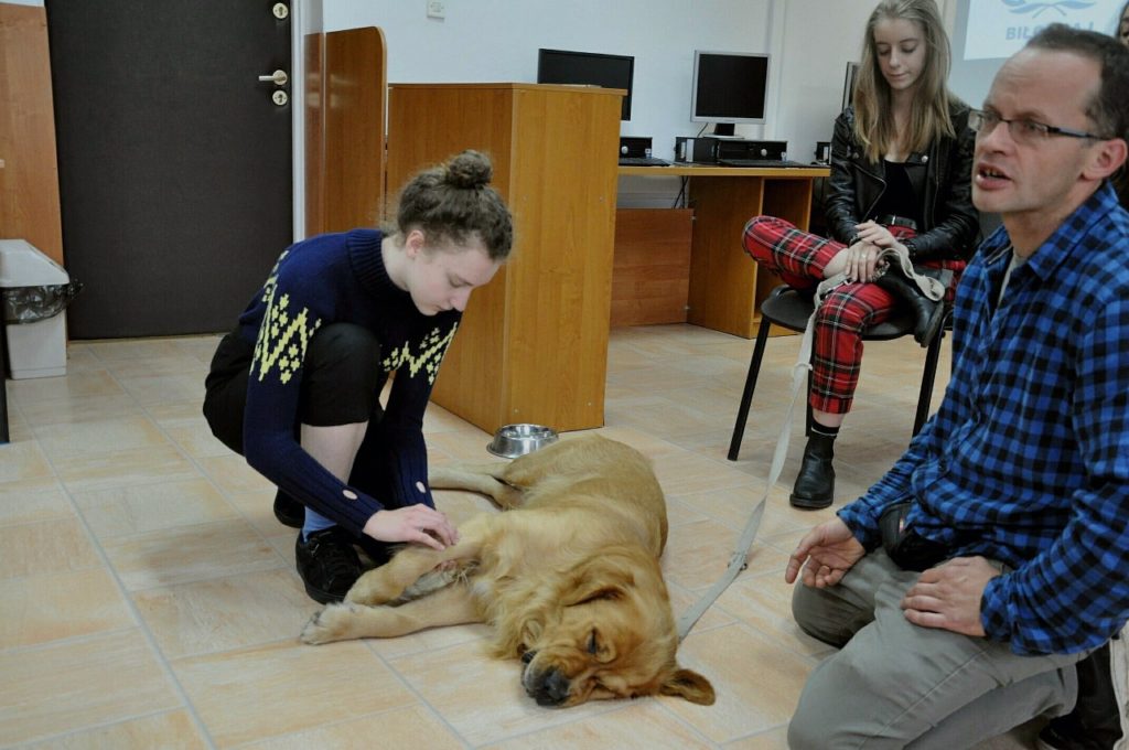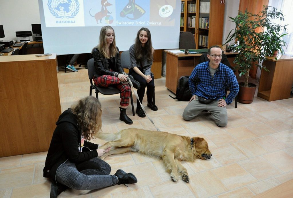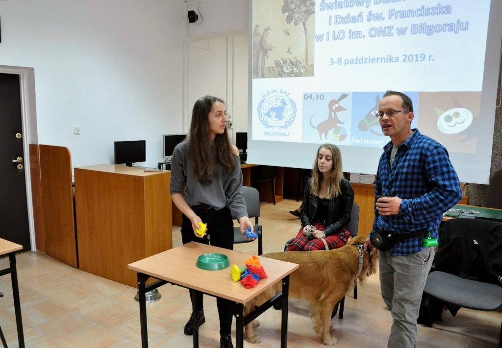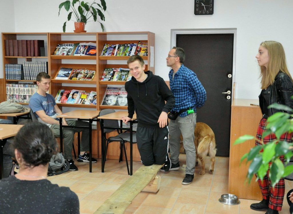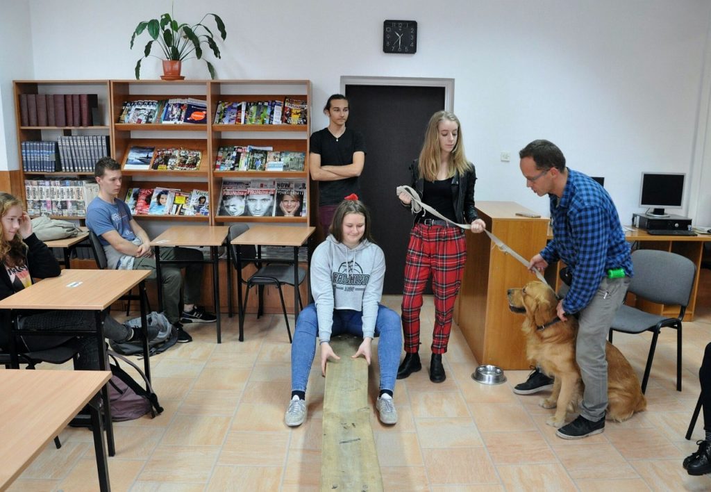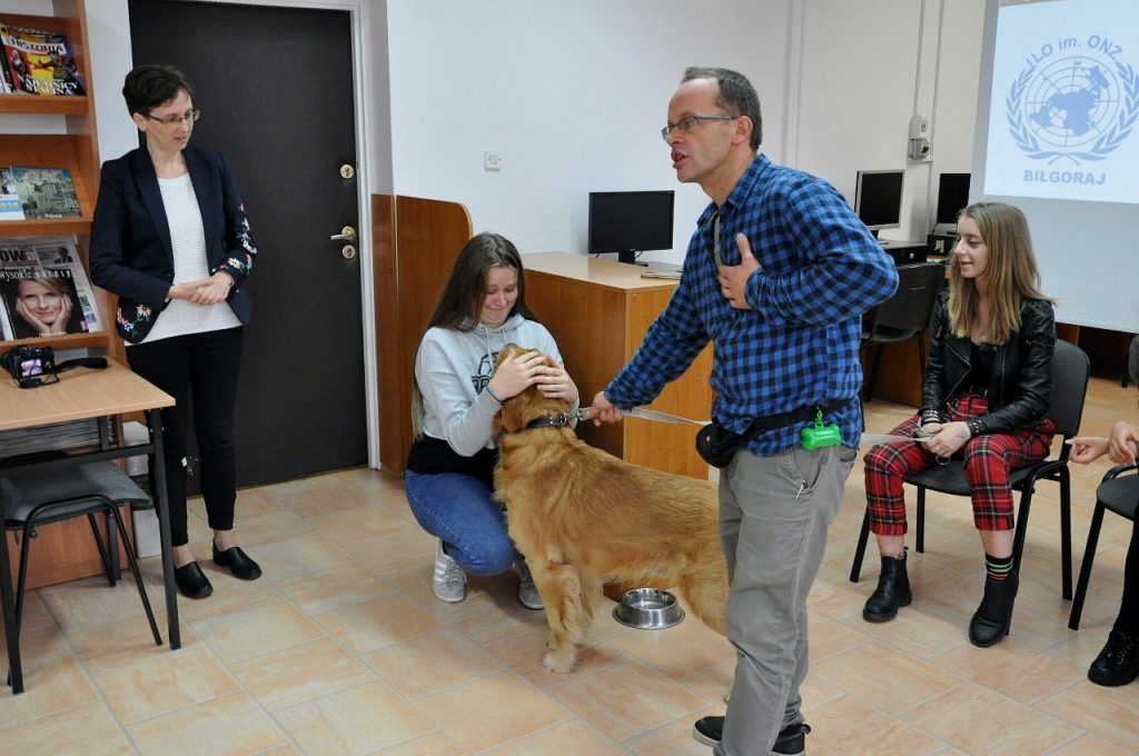 Dużo radości sprawiło młodzieży spotkanie z dogoterapeutą – panem Grzegorzem Kubikiem, który przybył do szkoły razem z Talikiem, psem terapeutycznym. Pan Kubik opowiadał o zawodzie dogoterapeuty oraz efektach terapii z dziećmi i dorosłymi. Prezentował ćwiczenia wpływające na koncentrację uwagi i rozwój funkcji poznawczych.