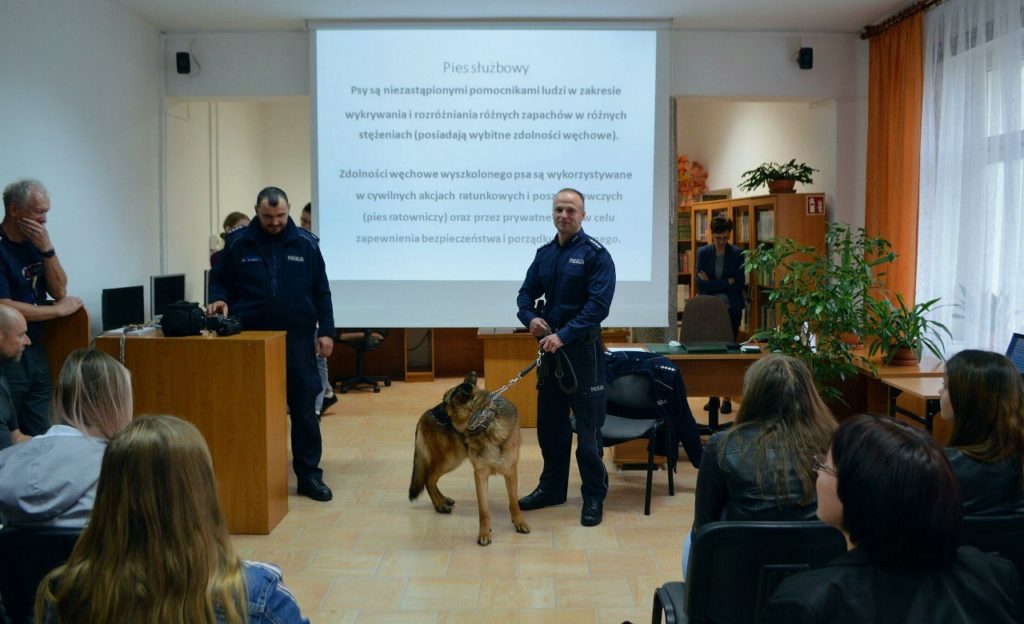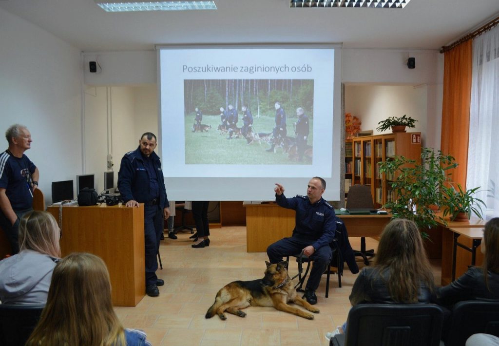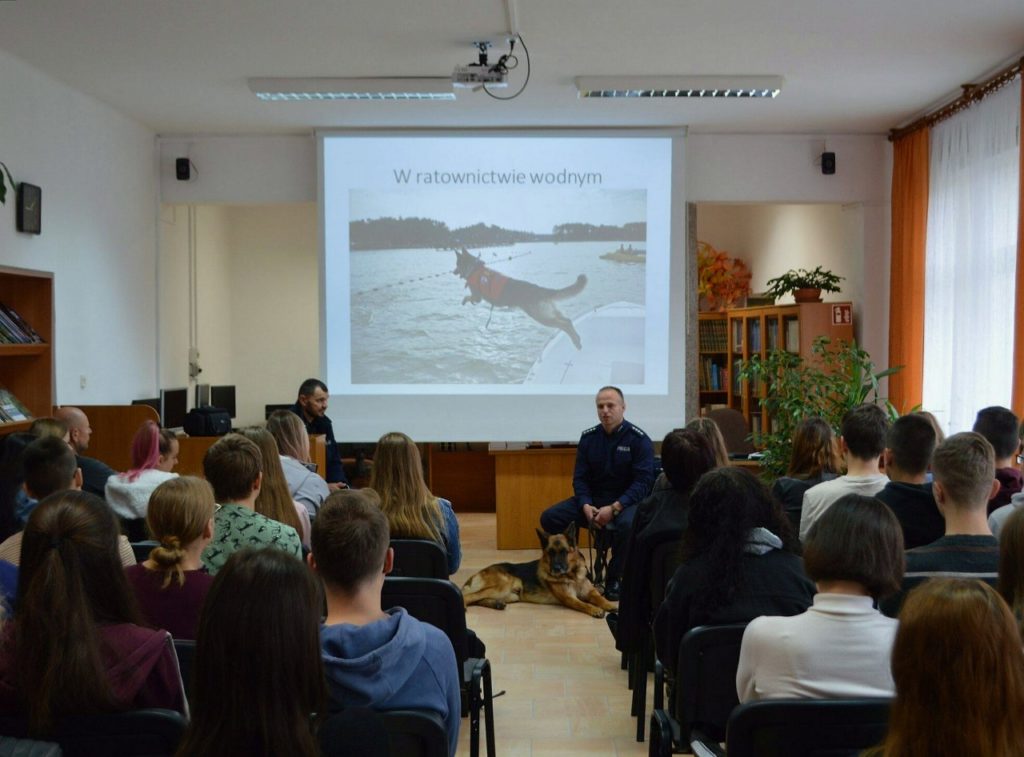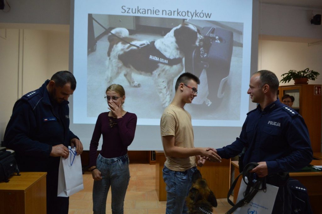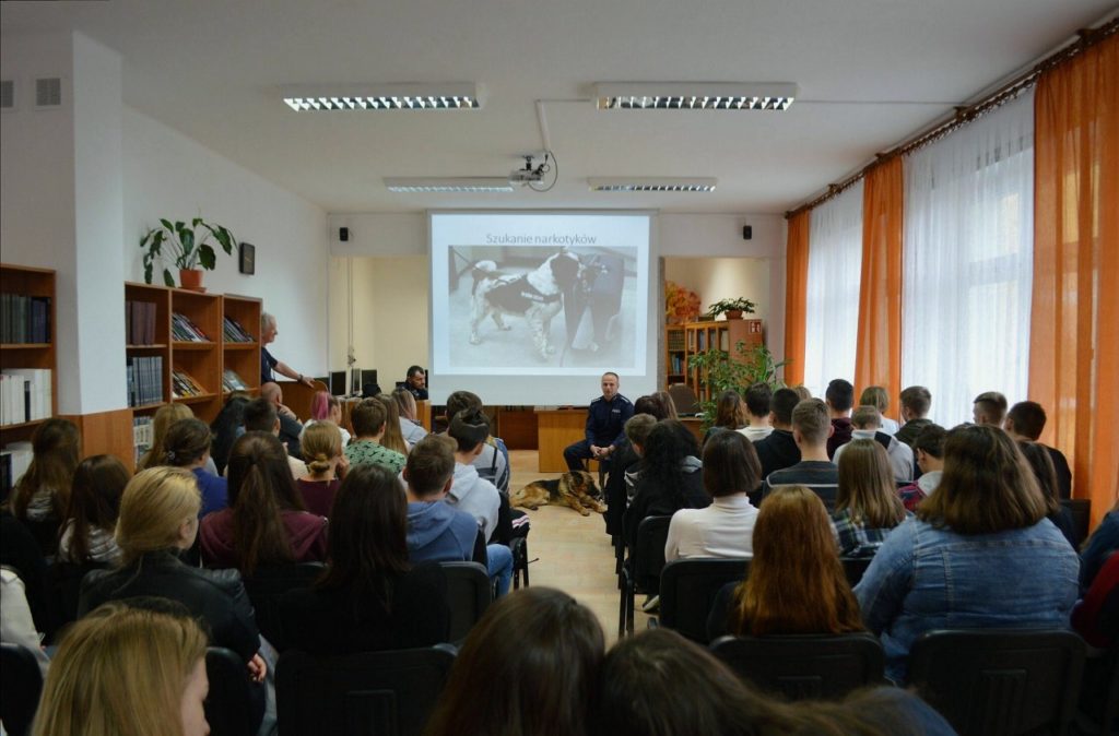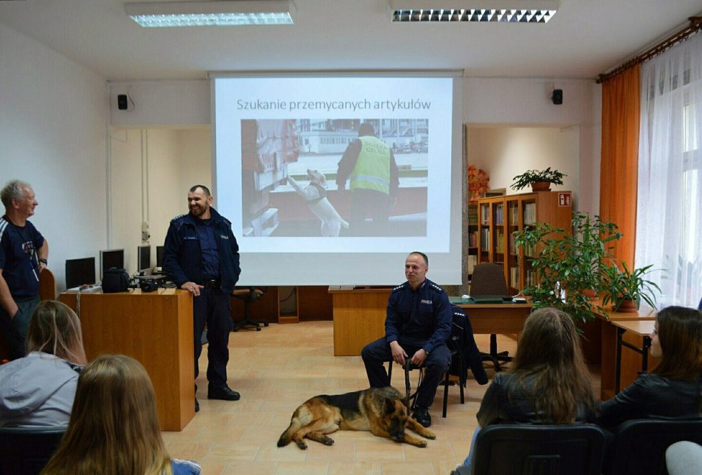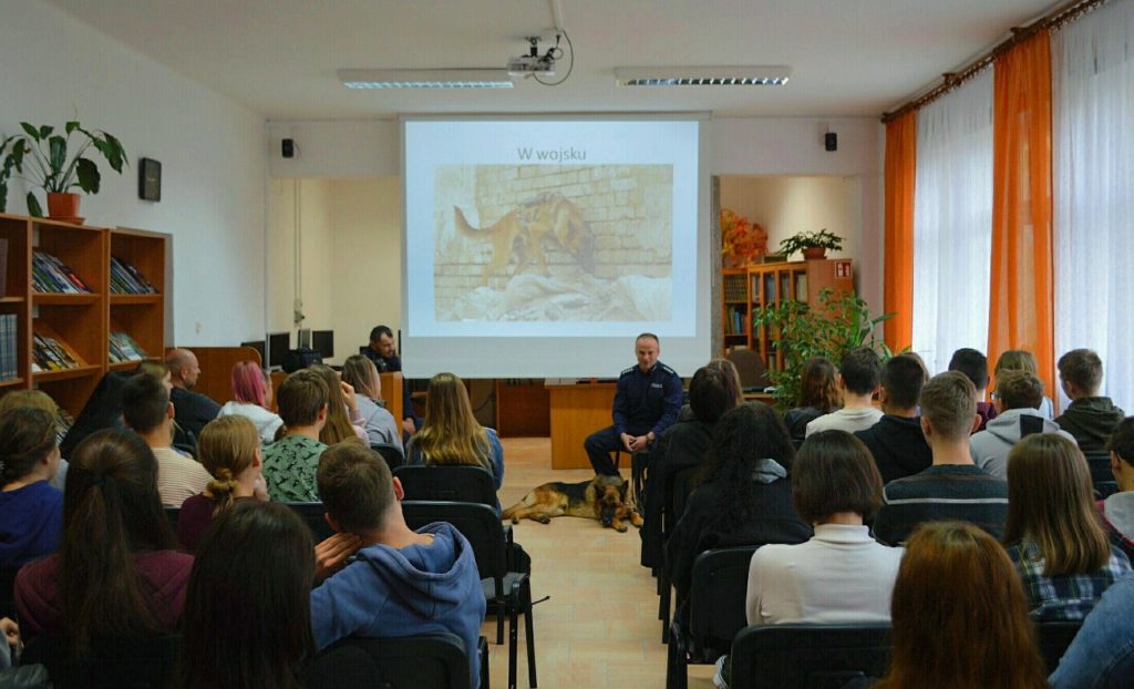 Młodzież z klas mundurowych uczestniczyła w spotkaniu z policjantami – panem Adamem Grandą i panem Markiem Harkotem oraz służbowym psem Nilo. Podczas zajęć uczniowie dowiedzieli się wielu ciekawych informacji na temat niezastąpionej pomocy czworonogów w codziennej pracy policjantów, szczególnie pionu kryminalnego. Uczniowie obejrzeli także prezentację multimedialną przygotowaną przez nauczycieli pt. „Psy w służbie człowieka”, dzięki której mogli zobaczyć, w jakich innych zawodach psy wspomagają pracę ludzi.