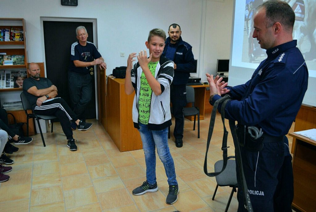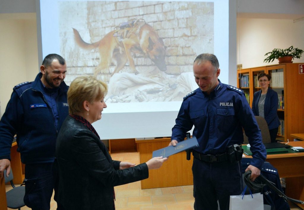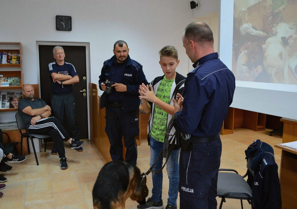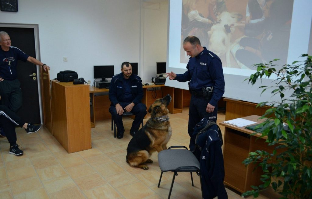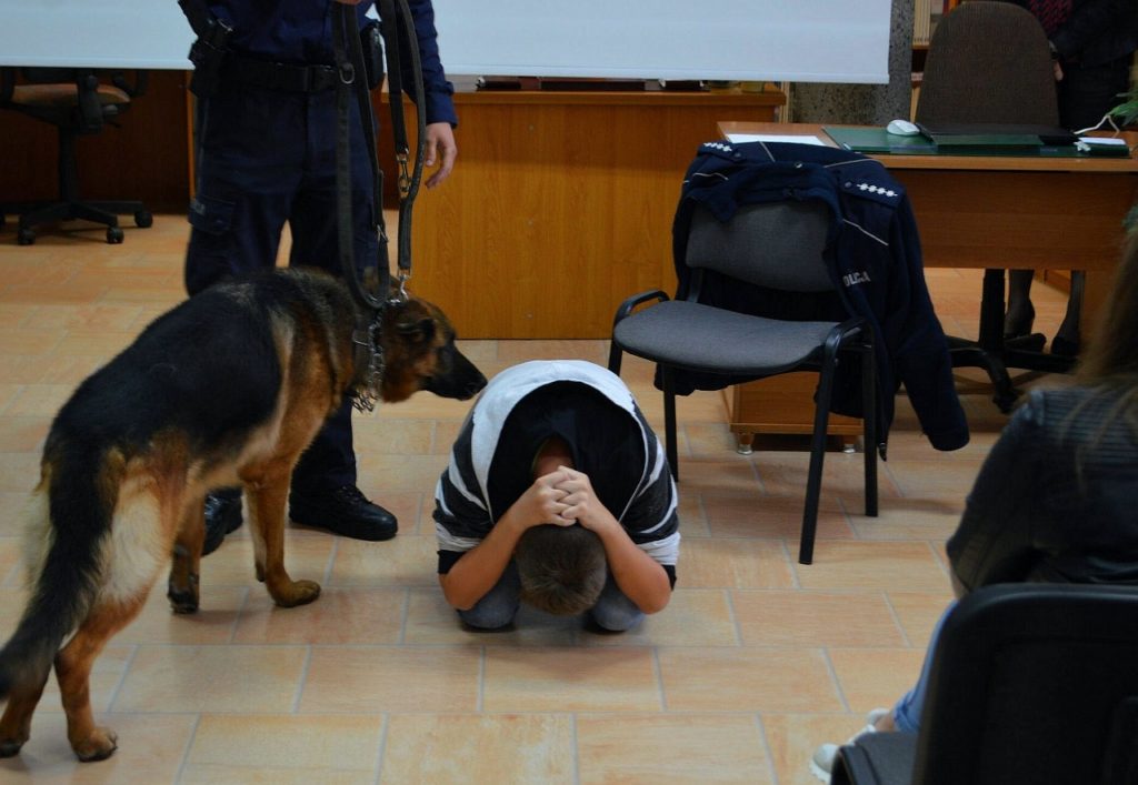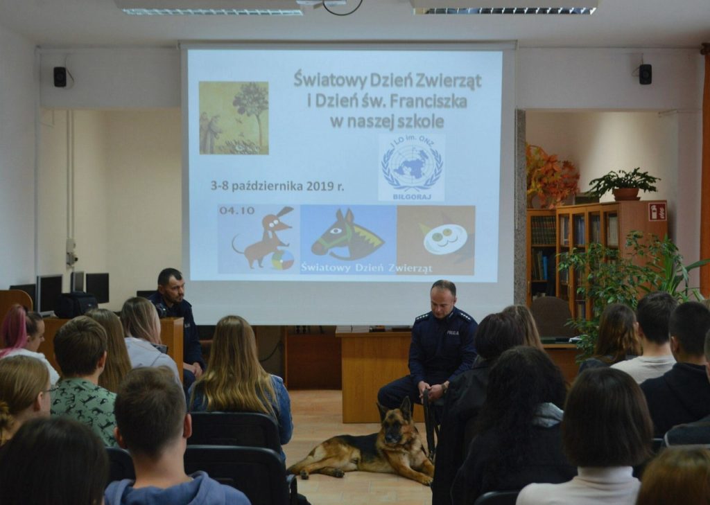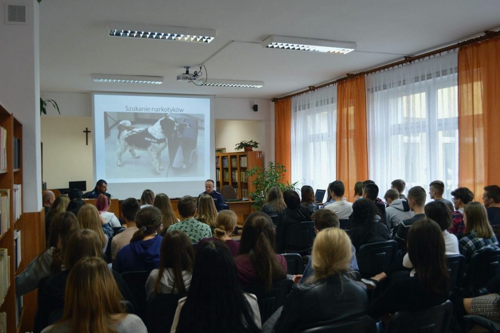 Młodzież z klas mundurowych uczestniczyła w spotkaniu z policjantami – panem Adamem Grandą i panem Markiem Harkotem oraz służbowym psem Nilo. Podczas zajęć uczniowie dowiedzieli się wielu ciekawych informacji na temat niezastąpionej pomocy czworonogów w codziennej pracy policjantów, szczególnie pionu kryminalnego. Uczniowie obejrzeli także prezentację multimedialną przygotowaną przez nauczycieli pt. „Psy w służbie człowieka”, dzięki której mogli zobaczyć, w jakich innych zawodach psy wspomagają pracę ludzi.